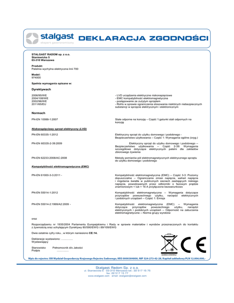 STALGAST RADOM sp. z o.o. Staniewicka 5 03-310 Warszawa Produkt: Patelnia wychylna elektryczna linii 700 Model: 974000 Spełnia wymagania opisane w: Dyrektywach - LVD urządzenia elektryczne niskonapięciowe - EMC kompatybilność elektromagnetyczna - postępowanie ze zużytym sprzętem - RoHs w sprawie ograniczenia stosowania niektórych niebezpiecznych substancji w sprzęcie elektrycznym i elektronicznym 2006/95/WE 2004/108/WE 2002/96/WE 2011/65/EU Normach PN-EN 10088-1:2007 Stale odporne na korozję – Część 1:gatunki stali odpornych na korozję Niskonapięciowy sprzęt elektryczny (LVD) PN-EN 60335-1:2012 Elektryczny sprzęt do użytku domowego i podobnego Bezpieczeństwo użytkowania -- Część 1: Wymagania ogólne (oryg.) PN-EN 60335-2-39:2009 Elektryczny sprzęt do użytku domowego i podobnego -Bezpieczeństwo użytkowania -- Część 2-39: Wymagania szczegółowe dotyczące elektrycznych patelni dla zakładów zbiorowego żywienia PN-EN 62233:2008/AC:2008 Metody pomiarów pól elektromagnetycznych elektrycznego sprzętu do użytku domowego i podobnego Kompatybilność elektromagnetyczna (EMC) PN-EN 61000-3-3:2011 - Kompatybilność elektromagnetyczna (EMC) -- Część 3-3: Poziomy dopuszczalne -- Ograniczanie zmian napięcia, wahań napięcia i migotania światła w publicznych sieciach zasilających niskiego napięcia, powodowanych przez odbiorniki o fazowym prądzie znamionowym < lub = 16 A przyłączone bezwarunkowo PN-EN 55014-1:2012 Kompatybilność elektromagnetyczna -- Wymagania dotyczące przyrządów powszechnego użytku, narzędzi elektrycznych i podobnych urządzeń -- Część 1: Emisja PN-EN 55014-2:1999/A2:2009 - Kompatybilność elektromagnetyczna (EMC) -- Wymagania dotyczące przyrządów powszechnego użytku, narzędzi elektrycznych i podobnych urządzeń -- Odporność na zaburzenia elektromagnetyczne -- Norma grupy wyrobów oraz Rozporządzeniu nr 1935/2004 Parlamentu Europejskiemu i Rady w sprawie materiałów i wyrobów przeznaczonych do kontaktu z żywnością oraz uchylającym Dyrektywy 80/590/EWG i 89/109/EWG Dwie ostatnie cyfry roku , w którym naniesiono CE:14. Deklaracje wystawiono: …………. Wystawiający Stanowisko Podpis Pełnomocnik d/s Jakości ………….