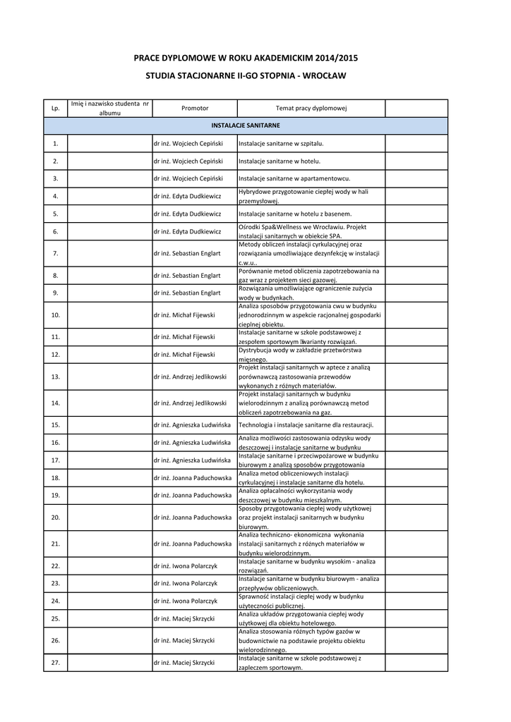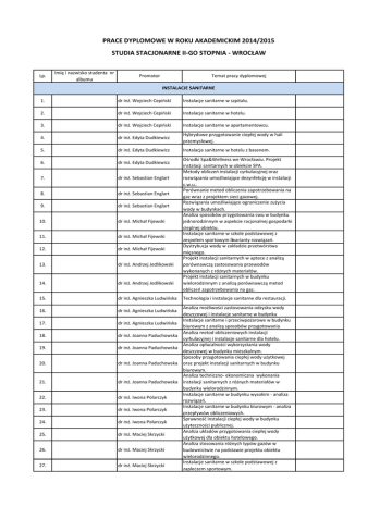 PRACE DYPLOMOWE W ROKU AKADEMICKIM 2014/2015 STUDIA STACJONARNE II-GO STOPNIA - WROCŁAW Lp. Imię i nazwisko studenta nr albumu Promotor Temat pracy dyplomowej INSTALACJE SANITARNE 1. dr inż. Wojciech Cepiński Instalacje sanitarne w szpitalu. 2. dr inż. Wojciech Cepiński Instalacje sanitarne w hotelu. 3. dr inż. Wojciech Cepiński Instalacje sanitarne w apartamentowcu. 4. dr inż. Edyta Dudkiewicz Hybrydowe przygotowanie ciepłej wody w hali przemysłowej. 5. dr inż. Edyta Dudkiewicz Instalacje sanitarne w hotelu z basenem. 6. dr inż. Edyta Dudkiewicz 7. dr inż. Sebastian Englart 8. dr inż. Sebastian Englart 9. dr inż. Sebastian Englart 10. dr inż. Michał Fijewski 11. dr inż. Michał Fijewski 12. dr inż. Michał Fijewski 13. dr inż. Andrzej Jedlikowski 14. dr inż. Andrzej Jedlikowski 15. dr inż. Agnieszka Ludwińska 16. dr inż. Agnieszka Ludwińska 17. dr inż. Agnieszka Ludwińska 18. dr inż. Joanna Paduchowska 19. dr inż. Joanna Paduchowska 20. dr inż. Joanna Paduchowska 21. dr inż. Joanna Paduchowska 22. dr inż. Iwona Polarczyk 23. dr inż. Iwona Polarczyk 24. dr inż. Iwona Polarczyk 25. dr inż. Maciej Skrzycki 26. dr inż. Maciej Skrzycki 27. dr inż. Maciej Skrzycki Ośrodki Spa&Wellness we Wrocławiu. Projekt instalacji sanitarnych w obiekcie SPA. Metody obliczeń instalacji cyrkulacyjnej oraz rozwiązania umożliwiające dezynfekcję w instalacji c.w.u.. Porównanie metod obliczenia zapotrzebowania na gaz wraz z projektem sieci gazowej. Rozwiązania umożliwiające ograniczenie zużycia wody w budynkach. Analiza sposobów przygotowania cwu w budynku jednorodzinnym w aspekcie racjonalnej gospodarki cieplnej obiektu. Instalacje sanitarne w szkole podstawowej z zespołem sportowym warianty rozwiązań. Dystrybucja wody w zakładzie przetwórstwa mięsnego. Projekt instalacji sanitarnych w aptece z analizą porównawczą zastosowania przewodów wykonanych z różnych materiałów. Projekt instalacji sanitarnych w budynku wielorodzinnym z analizą porównawczą metod obliczeń zapotrzebowania na gaz. Technologia i instalacje sanitarne dla restauracji. Analiza możliwości zastosowania odzysku wody deszczowej i instalacje sanitarne w budynku Instalacje sanitarne i przeciwpożarowe w budynku biurowym z analizą sposobów przygotowania Analiza metod obliczeniowych instalacji cyrkulacyjnej i instalacje sanitarne dla hotelu. Analiza opłacalności wykorzystania wody deszczowej w budynku mieszkalnym. Sposoby przygotowania ciepłej wody użytkowej oraz projekt instalacji sanitarnych w budynku biurowym. Analiza techniczno- ekonomiczna wykonania instalacji sanitarnych z różnych materiałów w budynku wielorodzinnym. Instalacje sanitarne w budynku wysokim - analiza rozwiązań. Instalacje sanitarne w budynku biurowym - analiza przepływów obliczeniowych. Sprawność instalacji ciepłej wody w budynku użyteczności publicznej. Analiza układów przygotowania ciepłej wody użytkowej dla obiektu hotelowego. Analiza stosowania różnych typów gazów w budownictwie na podstawie projektu obiektu wielorodzinnego. Instalacje sanitarne w szkole podstawowej z zapleczem sportowym. 28. dr inż Alina Żabnieńska-Góra 29. dr inż Alina Żabnieńska-Góra 30. 31. Projekt instalacji dla domu jednorodzinnego wraz z analizą wykorzystania ścieków deszczowych. Analiza sposobów przygotowania ciepłej wody użytkowej w hotelu. Analiza metod obliczeniowych instalacji dr inż Alina Żabnieńska-Góra cyrkulacyjnej w hotelu. Analiza kosztów instalacji z różnych materiałów dla dr inż Alina Żabnieńska-Góra budynku wielorodzinnego. OGRZEWNICTWO I CIEPŁOWNICTWO Projekt oraz analiza pracy dwufunkcyjnego źródła ciepła w budynku jednorodzinnym użytkowanym okresowo. Rozliczanie kosztów ogrzewania w budynkach wielorodzinnych. 32. dr inż. Grzegorz Bartnicki 33. dr inż. Grzegorz Bartnicki 34. dr inż. Grzegorz Bartnicki Biwalentne źródło ciepła dla budynku mieszkalnego. 35. prof. dr hab. inż. Jan Danielewicz 36. prof. dr hab. inż. Jan Danielewicz 37. prof. dr hab. inż. Jan Danielewicz 38. dr inż. Piotr Kęskiewicz 39. dr inż. Piotr Kęskiewicz 40. dr inż. Piotr Kęskiewicz 41. dr inż. Piotr Jadwiszczak 42. dr inż. Piotr Jadwiszczak Budynek bliskozeroenergetyczny w warunkach Wrocławia. Analiza energetyczna dachu domu jednorodzinnego z panelami fotowaltaicznymi w warunkach Wrocławia. Analza ekonomiczna wentylacji z rekuperacją ciepła na przykładzie domu jednorodzinnego w warunkach polskich. Symulacja energetyczna wielorodzinnego budynku pasywnego w EDSL TAS. Analiza EDSL TAS krótkoterminowej akumulacji ciepła wspierającej instalację c.o. budynku jednorodzinnego. Wpływ zastosowania różnych metod definiowania wewnętrznych zysków ciepła na wyniki symulacji energetycznej budynku wielorodzinnego w EDSL TAS. Analiza numeryczna energochłonności budynku w cyklu całorocznym. Instalacje i systemy energetyczne budynku wielorodzinnego w standardzie NF40. 43. dr inż. Piotr Jadwiszczak Akumulacyjny system ogrzewania budynku. 44. dr inż. Marcin Klimczak Analiza pracy sieci ciepłowniczej. 45. dr inż. Marcin Klimczak 46. dr inż. Marcin Klimczak 47. dr inż. Piotr Kowalski 48. dr inż. Piotr Kowalski 49. dr inż. Piotr Kowalski 50. dr inż. Marta Laska 51. dr inż. Marta Laska 52. dr inż. Marta Laska 53. dr inż. Maciej Miniewicz 54. dr inż. Maciej Miniewicz 55. dr inż. Maciej Miniewicz 56. dr inż. Bogdan Nowak 57. dr inż. Bogdan Nowak Projekt systemu zasilania w ciepło dużego osiedla domków jednorodzinnych usytuowanego na Projekt systemu zasilania w ciepło trzygwiazdkowego hotelu usytuowanego we Charakterystyka energetyczna budynku mieszkalnego. Wymiarowanie instalacji kolektorów słonecznych na potrzeby grzewcze. Charakterystyka energetyczna budynku użyteczności publicznej. Analiza energetyczna oraz świadectwo energetyczne dla budynku wielorodzinnego. Analiza energetyczna oraz świadectwo energetyczne dla budynku z kondygnacją usługową. Analiz
