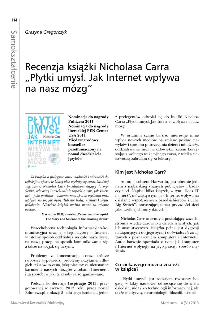 114 Samokształcenie Grażyna Gregorczyk Recenzja książki Nicholasa Carra „Płytki umysł. Jak Internet wpływa na nasz mózg” Nominacja do nagrody Pulitzera 2011 Nominacja do nagrody literackiej PEN Center USA 2011 Międzynarodowy bestseller przetłumaczony na ponad dwadzieścia języków To książka o pielęgnowaniu mądrości i zdolności do refleksji w epoce, w której obie wydają się coraz bardziej zagrożone. Nicholas Carr przedstawia dający do myślenia, odważny intelektualnie wywód o tym, jak Internet – jako medium – zmienia nasz sposób myślenia oraz wpływa na to, jak będą (lub nie będą) myślały kolejne pokolenia. Niewiele książek można uznać za równie istotne. Maryanne Wolf, autorka „Proust and the Squid. The Story and Science of the Reading Brain” Wszechobecna technologia informacyjno-komunikacyjna oraz jej okręt flagowy – Internet w istotny sposób oddziałują na całe nasze życie, na naszą pracę, na sposób komunikowania się, a także na to, jak się uczymy. Problemy z koncentracją, coraz krótsze i uboższe wypowiedzi, problemy z czytaniem długich tekstów to cena, jaką płacimy za nieustanne karmienie naszych mózgów zasobami Internetu, i za sposób, w jaki te zasoby są zorganizowane. Podczas konferencji Inspiracje 2013, przygotowanej w czerwcu 2013 roku przez portal Edunews.pl z okazji 5-lecia jego istnienia, jeden Mazowiecki Kwartalnik Edukacyjny z prelegentów odwołał się do książki Nicolasa Carra „Płytki umysł. Jak Internet wpływa na nasz mózg”. W ostatnim czasie bardzo interesuje mnie wpływ nowych mediów na zmianę postaw, nawyków i sposobu postrzegania dzieci i młodzieży, oddziaływanie sieci na człowieka. Zatem korzystając z wolnego wakacyjnego czasu, z wielką ciekawością zabrałam się za lekturę. Kim jest Nicholas Carr? Autor, absolwent Harvardu, jest obecnie jednym z najbardziej znanych publicystów i badaczy sieci. Napisał kilka książek, w tym „Does IT matter?”, mówiącą o tym, jak Internet wpływa na działanie współczesnych przedsiębiorców i „The Big Switch”, poruszającą temat przyszłości sieci jako wielkiej chmury danych. Nicholas Carr to erudyta posiadający wszechstronną wiedzę zarówno z dziedzin ścisłych, jak i humanistycznych. Książka pełna jest dygresji nawiązujących do jego życia i doświadczeń związanych z poznawaniem komputera i Internetu. Autor barwnie opowiada o tym, jak komputer i Internet wpłynęły na jego pracę i sposób myślenia. Co ciekawego można znaleźć w książce? „Płytki umysł” jest rodzajem rozprawy bogatej w fakty naukowe, odnoszące się do wielu dziedzin, nie tylko technologii informacyjnej, ale także medycyny, neurobiologii, filozofii, historii. Meritum 4 (31) 2013 Recenzja książki Nicholasa Carra „Płytki umysł. Jak Internet wpływa na nasz mózg” Przemierzamy historię w czasie i przestrzeni, od starożytności po współczesność. Poznajemy teorie Kartezjusza, Nietzschego, Freuda oraz Younga na temat funkcjonowania mózgu. Zastanawiamy się razem z autorem, czy prawdą jest, że pod wpływem długotrwałego kontaktu z Internetem u notorycznych internautów następują zmiany w budowie mózgu, że powstają tzw. hipertekstowe umysły, co oznacza zmianę sposobu myślenia z dotychczasowego, linearnego, na hipertekstowy i wielowątkowy. Podążamy za myślą o roli, jaką pełni człowiek w tym coraz bardziej stechnicyzowanym świecie. Nowe technologie i związane z ich rozwojem obawy budzą wiele pytań. Czy jako gatunek, wśród zaawansowanych technologicznie maszyn, staniemy się zbędni? Co się wydarzy, kiedy technologia zdobędzie zdolność reprodukcji? Autor przedstawia również pozytywne strony zaawansowanych współczesnych technologii, opisuje zjawisko cyfryzacji mediów, wykorzystywanie Internetu w codziennym życiu oraz odejście od tradycyjnych nośników informacji na rzecz nowoczesnych urządzeń, takich jak tablety, smartfony i inne. Czego się nie dowiemy z tej książki? Nicolas Carr nie daje odpowiedzi na wszystkie pytania, jakie pojawiają się w książce. Raczej zachęca czytelnika do samodzielnych przemyśleń. Nie poznamy więc także instrukcji, jak rozszyfro- wać algorytm wyszukiwania Google, ani jak kierować naszym myśleniem, by było tak wydajne, jak procesor komputera. Nie dowiemy się także, co należy zrobić, aby zapobiec wszystkim zagrożeniom generowanym przez nowe technologie i szkodom dokonywanym przez Internet. Dla kogo jest ta książka? „Płytki umysł” z pewnością można polecić wszystkim tym, którzy interesują się nowoczesnymi technologiami i ich wpływem na nasze życie, na zachowanie, na sposób, w jaki uczymy się i pracujemy, szczególnie tym wszystkim, którzy chcą dowiedzieć się, czy i jak Internet kształtuje nasz mózg. Samokształcenie Od samego początku towarzyszymy autorowi w arcyciekawej wędrówce, począwszy od plastyczności mózgu, odnoszącej się do zmian w jego strukturze przez całe życie człowieka, poprzez historię pisma, opowieść, jak rodziła się książka, badania nad umysłem człowieka, aż po wynalazki takie jak mapy, zegary, nowoczesne technologie i sztuczną inteligencję. Dowiadujemy się, jak funkcjonują mapy mózgu i co mają wspólnego z tradycyjną mapą oraz zegarem. 115 Jest to cenna lektura dla nauczycieli i rodziców, ponieważ ułatwia zrozumienie, jak młodzi ludzie funkcjonują w cyfrowym społeczeństwie. Książka powinna także zaciekawić osoby, które interesują się działaniem algorytmu największej wyszukiwarki Google i które utożsamiają się z łowcami i zbieraczami w lesie elektronicznych danych. Przy okazji warto zauważyć, że doświadczamy właśnie odwrócenia intelektualnej ewolucji naszego gatunku. Z wyznawców wiedzy i mądrości jako przymiotu ściśle związanego z osobowością znów stajemy się myśliwymi i zbieraczami, tym razem w elektronicznym lesie pełnym informacji. Bez w