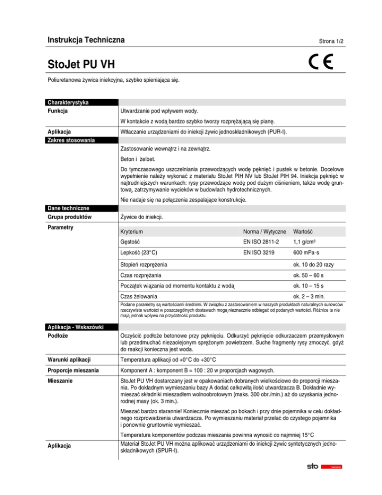 Instrukcja Techniczna Strona 1/2 StoJet PU VH Poliuretanowa Ŝywica iniekcyjna, szybko spieniająca się. Charakterystyka Funkcja Utwardzanie pod wpływem wody. W kontakcie z wodą bardzo szybko tworzy rozpręŜającą się pianę. Aplikacja Zakres stosowania Wtłaczanie urządzeniami do iniekcji Ŝywic jednoskładnikowych (PUR-I). Zastosowanie wewnątrz i na zewnątrz. Beton i Ŝelbet. Do tymczasowego uszczelniania przewodzących wodę pęknięć i pustek w betonie. Docelowe wypełnienie naleŜy wykonać z materiału StoJet PIH NV lub StoJet PIH 94. Iniekcja pęknięć w najtrudniejszych warunkach: rysy przewodzące wodę pod duŜym ciśnieniem, takŜe wodę gruntową, zatrzymywanie wycieków w budowlach hydrotechnicznych. Nie nadaje się na połączenia zespalające konstrukcje. Dane techniczne Grupa produktów Parametry śywice do iniekcji. Kryterium Norma / Wytyczne Wartość Gęstość EN ISO 2811-2 1,1 g/cm3 Lepkość (23°C) EN ISO 3219 600 mPa·s Stopień rozpręŜenia ok. 10 do 20 razy Czas rozpręŜania ok. 50 – 60 s Początek wiązania od momentu kontaktu z wodą ok. 10 – 15 s Czas Ŝelowania ok. 2 – 3 min. Podane parametry są wartościami średnimi. W związku z zastosowaniem w naszych produktach naturalnych surowców rzeczywiste wartości w poszczególnych dostawach mogą nieznacznie odbiegać od podanych wartości. RóŜnice te nie mają jednak wpływu na przydatność produktu. Aplikacja - Wskazówki PodłoŜe Oczyścić podłoŜe betonowe przy pęknięciu. Odkurzyć pęknięcie odkurzaczem przemysłowym lub przedmuchać niezaolejonym spręŜonym powietrzem. Suche fragmenty rysy zmoczyć, gdyŜ do reakcji konieczna jest woda. Warunki aplikacji Temperatura aplikacji od +0°C do +30°C Proporcje mieszania Komponent A : komponent B = 100 : 20 w proporcjach wagowych. Mieszanie StoJet PU VH dostarczany jest w opakowaniach dobranych wielkościowo do proporcji mieszania. Po dokładnym wymieszaniu bazy A dodać całkowitą ilość utwardzacza B. Dokładnie wymieszać składniki mieszadłem wolnoobrotowym (maks. 300 obr./min.) aŜ do uzyskania jednorodnej masy (ok. 3 min.). Mieszać bardzo starannie! Koniecznie mieszać po bokach i przy dnie pojemnika w celu dokładnego rozprowadzenia utwardzacza. Po wymieszaniu materiał przelać do czystego pojemnika i ponownie gruntownie wymieszać. Temperatura komponentów podczas mieszania powinna wynosić co najmniej 15°C Aplikacja Materiał StoJet PU VH moŜna aplikować urządzeniami do iniekcji Ŝywic syntetycznych jednoskładnikowych (SPUR-I). Instrukcja Techniczna Strona 2/2 StoJet PU VH Poliuretanowa Ŝywica iniekcyjna, szybko spieniająca się. Dla pełnego uszczelnienia pęknięć przewodzących wodę wykonać wstępną iniekcję materiałem StoJet PU VH. Bezpośrednio po przerwaniu wypływu wody wykonać iniekcję docelową materiałem StoJet PIH NV lub StoJet PIH 94, uŜywając tych samych pakerów. W razie konieczności wymienić kalamitki. Czyszczenie narzędzi Niezwłocznie po uŜyciu oczyścić środkiem StoCryl VV. Następnie wskazane jest oczyszczenie iniektora środkiem StoJet NR. Formy dostawy Opakowanie Komplety 1 kg, (komponent A + komponent B), numer artykułu 14096/003 Komplety 10 kg, (komponent A + komponent B), numer artykułu 14096/002 Składowanie Warunki składowania Czas składowania Przechowywać w suchym miejscu w dodatnich temperaturach. Chronić przed nasłonecznieniem. W oryginalnym opakowaniu do ... (patrz nr partii na opakowaniu) Informacje dodatkowe Bezpieczeństwo Dodatkowe informacje dotyczące obchodzenia się z produktem, składowania i usuwania odpadów znajdują się w Karcie Charakterystyki Preparatu Niebezpiecznego. CE Znak CE zgodnie z PN-EN 1504-5 Deklaracja zgodności WE zgodnie z PN-EN 1504-5 Nr rewizyjny StoJet PU VH/PL/015 Obowiązuje od 26.10.2009 Zastosowania nie wymienione w niniejszej Instrukcji Technicznej naleŜy skonsultować z przedstawicielem Sto-ispo Sp. z o.o. Informacje oraz dane odnoszą się do standardowych zastosowań. Sto-ispo Sp. z o.o. ul. Zabraniecka 15 03-872 Warszawa tel. (0 22) 511 61 00 fax (0 22) 511 61 01 e-mail: [email protected] www.sto.pl
