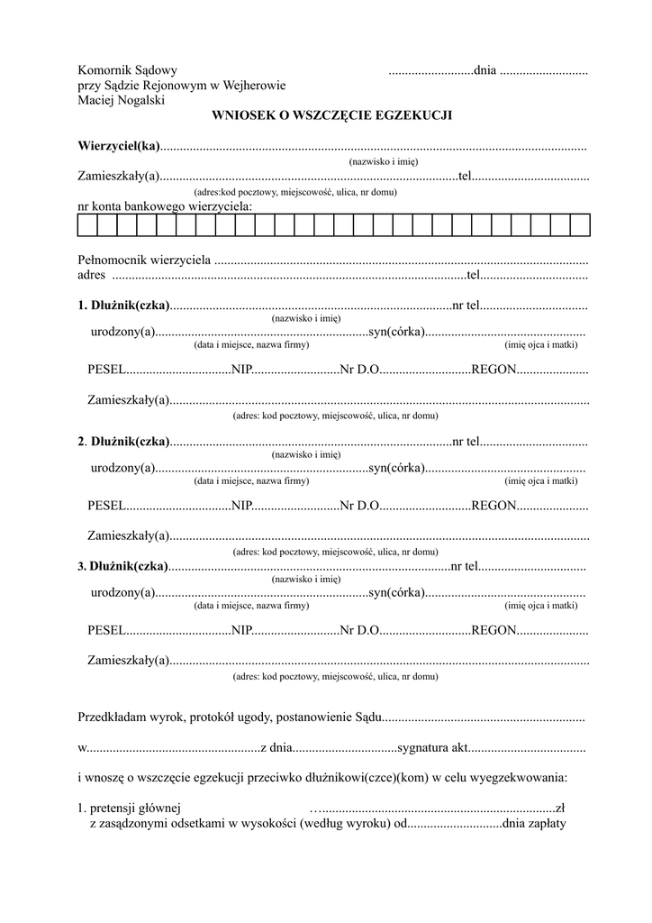 Komornik Sądowy ..........................dnia ........................... przy Sądzie Rejonowym w Wejherowie Maciej Nogalski WNIOSEK O WSZCZĘCIE EGZEKUCJI Wierzyciel(ka).................................................................................................................................. (nazwisko i imię) Zamieszkały(a)...........................................................................................tel.................................... (adres:kod pocztowy, miejscowość, ulica, nr domu) nr konta bankowego wierzyciela: Pełnomocnik wierzyciela .................................................................................................................. adres ............................................................................................................tel................................. 1. Dłużnik(czka)......................................................................................nr tel................................. (nazwisko i imię) urodzony(a).................................................................syn(córka)................................................. (data i miejsce, nazwa firmy) (imię ojca i matki) PESEL................................NIP...........................Nr D.O............................REGON...................... Zamieszkały(a)................................................................................................................................ (adres: kod pocztowy, miejscowość, ulica, nr domu) 2. Dłużnik(czka)......................................................................................nr tel................................. (nazwisko i imię) urodzony(a).................................................................syn(córka)................................................. (data i miejsce, nazwa firmy) (imię ojca i matki) PESEL................................NIP...........................Nr D.O............................REGON...................... Zamieszkały(a)................................................................................................................................ (adres: kod pocztowy, miejscowość, ulica, nr domu) 3. Dłużnik(czka)......................................................................................nr tel................................. (nazwisko i imię) urodzony(a).................................................................syn(córka)................................................. (data i miejsce, nazwa firmy) (imię ojca i matki) PESEL................................NIP...........................Nr D.O............................REGON...................... Zamieszkały(a)................................................................................................................................ (adres: kod pocztowy, miejscowość, ulica, nr domu) Przedkładam wyrok, protokół ugody, postanowienie Sądu.............................................................. w.....................................................z dnia................................sygnatura akt.................................... i wnoszę o wszczęcie egzekucji przeciwko dłużnikowi(czce)(kom) w celu wyegzekwowania: 1. pretensji głównej ….......................................................................zł z zasądzonymi odsetkami w wysokości (według wyroku) od.............................dnia zapłaty 2. kosztów procesu …...............................................................................................................zł 3. kosztów klauzuli....................................................................................................................zł 4. kosztów …........................................................................................................................................................................ zł 5. kosztów egzekucyjnych, które powstaną w toku postępowania. Egzekucję wnoszę skierować do:  ruchomości*(wymienić)....................................................................................................................,  wierzytelności*..............................................................................................................................,  rachunku bankowego* nazwa banku i nr ...................................................................................................,  wynagrodzenia*(nazwa i adres zakładu pracy).......................................................................................,  świadczeń emerytalno – rentowych*............................................................................................,  nieruchomości*: miejsce położenia .......................................................................nr KW …................. * jeżeli wierzyciel nie ma wiedzy w tym zakresie, należy wpisać „wg ustaleń komornika” Informacje o dłużniku: **  posiada samochód (marka, nr rejestracyjny): ............................................................................. ,  posiada wartościowe ruchomości: …............................................................................................ …..................................................................................................................................................,  prowadzi działalność gospodarczą:..............................................................................................,  jest właścicielem działki budowlanej, domu, garażu, mieszkania, itp.: ....................................... …..................................................................................................................................................,  posiada udziały w spółkach, spółdzielniach itp.: …....................................................................,  inne: ….............................................................................................................