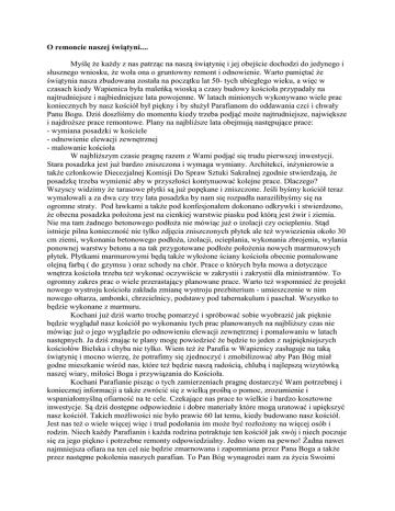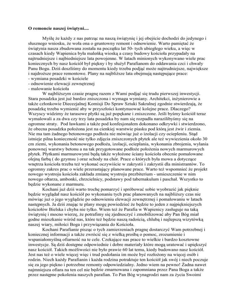 O remoncie naszej świątyni.... Myślę Ŝe kaŜdy z nas patrząc na naszą świątynię i jej obejście dochodzi do jedynego i słusznego wniosku, Ŝe woła ona o gruntowny remont i odnowienie. Warto pamiętać Ŝe świątynia nasza zbudowana została na początku lat 50- tych ubiegłego wieku, a więc w czasach kiedy Wapienica była maleńką wioską a czasy budowy kościoła przypadały na najtrudniejsze i najbiedniejsze lata powojenne. W latach minionych wykonywano wiele prac koniecznych by nasz kościół był piękny i by słuŜył Parafianom do oddawania czci i chwały Panu Bogu. Dziś doszliśmy do momentu kiedy trzeba podjąć moŜe najtrudniejsze, największe i najdroŜsze prace remontowe. Plany na najbliŜsze lata obejmują następujące prace: - wymiana posadzki w kościele - odnowienie elewacji zewnętrznej - malowanie kościoła W najbliŜszym czasie pragnę razem z Wami podjąć się trudu pierwszej inwestycji. Stara posadzka jest juŜ bardzo zniszczona i wymaga wymiany. Architekci, inŜynierowie a takŜe członkowie Diecezjalnej Komisji Do Spraw Sztuki Sakralnej zgodnie stwierdzają, Ŝe posadzkę trzeba wymienić aby w przyszłości kontynuować kolejne prace. Dlaczego? Wszyscy widzimy Ŝe tarasowe płytki są juŜ popękane i zniszczone. Jeśli byśmy kościół teraz wymalowali a za dwa czy trzy lata posadzka by nam się rozpadła narazilibyśmy się na ogromne straty. Pod ławkami a takŜe pod konfesjonałem dokonano odkrywki i stwierdzono, Ŝe obecna posadzka połoŜona jest na cienkiej warstwie piasku pod którą jest Ŝwir i ziemia. Nie ma tam Ŝadnego betonowego podłoŜa nie mówiąc juŜ o izolacji czy ociepleniu. Stąd istnieje pilna konieczność nie tylko zdjęcia zniszczonych płytek ale teŜ wywiezienia około 30 cm ziemi, wykonania betonowego podłoŜa, izolacji, ocieplania, wykonania zbrojenia, wylania ponownej warstwy betonu a na tak przygotowane podłoŜe połoŜenia nowych marmurowych płytek. Płytkami marmurowymi będą takŜe wyłoŜone ściany kościoła obecnie pomalowane olejną farbą ( do gzymsu ) oraz schody na chór. Prace o których była mowa a dotyczące wnętrza kościoła trzeba teŜ wykonać oczywiście w zakrystii i zakrystii dla ministrantów. To ogromny zakres prac o wiele przerastający planowane prace. Warto teŜ wspomnieć Ŝe projekt nowego wystroju kościoła zakłada zmianę wystroju prezbiterium - umieszczenie w nim nowego ołtarza, ambonki, chrzcielnicy, podstawy pod tabernakulum i paschał. Wszystko to będzie wykonane z marmuru. Kochani juŜ dziś warto trochę pomarzyć i spróbować sobie wyobrazić jak pięknie będzie wyglądał nasz kościół po wykonaniu tych prac planowanych na najbliŜszy czas nie mówiąc juŜ o jego wyglądzie po odnowieniu elewacji zewnętrznej i pomalowaniu w latach następnych. Ja dziś znając te plany mogę powiedzieć Ŝe będzie to jeden z najpiękniejszych kościołów Bielska i chyba nie tylko. Wiem teŜ Ŝe Parafia w Wapienicy zasługuje na taką świątynię i mocno wierzę, Ŝe potrafimy się zjednoczyć i zmobilizować aby Pan Bóg miał godne mieszkanie wśród nas, które teŜ będzie naszą radością, chlubą i najlepszą wizytówką naszej wiary, miłości Boga i przywiązania do Kościoła. Kochani Parafianie pisząc o tych zamierzeniach pragnę dostarczyć Wam potrzebnej i koniecznej informacji a takŜe zwrócić się z wielką prośbą o pomoc, zrozumienie i wspaniałomyślną ofiarność na te cele. Czekające nas prace to wielkie i bardzo kosztowne inwestycje. Są dziś dostępne odpowiednie i dobre materiały które mogą uratować i upiększyć nasz kościół. Takich moŜliwości nie było prawie 60 lat temu, kiedy budowano nasz kościół. Jest nas teŜ o wiele więcej więc i trud podołania im moŜe być rozłoŜony na więcej osób i rodzin. Niech kaŜdy Parafianin i kaŜda rodzina potraktuje ten kościół jak swój i niech poczuje się za jego piękno i potrzebne remonty odpowiedzialny. Jedno wiem na pewno! śadna nawet najmniejsza ofiara na ten cel nie będzie zmarnowana i zapomniana przez Pana Boga a takŜe przez następne pokolenia naszych parafian. To Pan Bóg wynagrodzi nam za Ŝycia Swoimi łaskami i błogosławieństwem kaŜdą formę pomocy i złoŜoną ofiarę a przyszłe pokolenia parafian pamięcią modlitewną pomogą nam po śmierci otworzyć bramy nieba. Uczyńmy z naszych ofiar i trudu radosny, spontaniczny dar dla Pana Boga, bliźnich i siebie. Pamiętajmy Ŝe mamy do spłacenia olbrzymi dług wdzięczności naszym dziadkom i ojcom w postaci obecnego kościoła i warto coś dać od siebie aby o nas mówiono tak po 50 czy 100 latach. Zwracam się więc jeszcze raz do Wszystkich Parafian, do kaŜdej rodziny, do młodych i starszych, do właścicieli zakładów i firm o pomoc i ofiary na cele remontu i upiększenia naszego kościoła. MoŜe warto teŜ pamiętać, Ŝe większe ofiary złoŜone na cele kultu religijnego a wiec i na remont kościoła mogą być odliczone od dochodu i ujęte w naszych zeznaniach podatkowych, które składać będziemy do Urzędu Skarbowego ale trzeba pamiętać Ŝe wówczas muszą być wpłacone na konto bankowe parafii, które podam na zakończenie tych refleksji. Dokładna informacja na ten temat jest teŜ umieszczona na stronie internetowej naszej parafii. Kochani Parafianie. PrzeŜywamy Rok św. Pawła. TenŜe Apostoł Narodów zapewnia nas Ŝe „radosnego dawcę miłuje Bóg!”. Uwierzmy w te słowa! Niech ogromu tej miłości Boga dozna kaŜdy z nas poprzez swoją radosną ofiarę i zatroskanie o swoją świątynię. ks. prob. Jerzy Matoga Parafia i wszystko co do niej naleŜy jest naszym wspólnym dobrem. Na nas wszystkich spoczywa odpowiedzialność za rozwój dóbr duchowych i materialnych. W kaŜdą trzecią niedzielę moŜemy składać dobrowolną ofiarę na potrzeby naszej parafii. Ofiary moŜna składać takŜe na konto parafii: Bank PKO SA oddział w Bielsku-Białej NRB 04 1240 1170 1111 0000 2408 7650 Za 