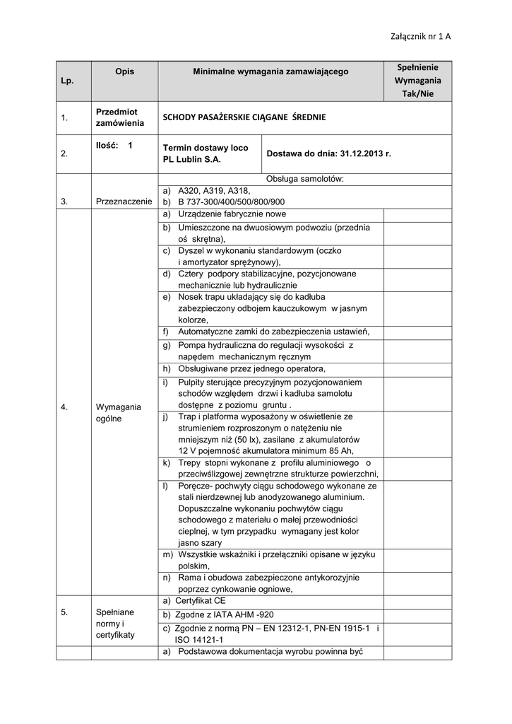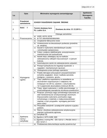 Załącznik nr 1 A Minimalne wymagania zamawiającego Opis Lp. 1. Przedmiot zamówienia Ilość: 1 2. SCHODY PASAŻERSKIE CIĄGANE ŚREDNIE Termin dostawy loco PL Lublin S.A. Dostawa do dnia: 31.12.2013 r. Obsługa samolotów: 3. Przeznaczenie a) A320, A319, A318, b) B 737-300/400/500/800/900 a) Urządzenie fabrycznie nowe b) Umieszczone na dwuosiowym podwoziu (przednia oś skrętna), c) Dyszel w wykonaniu standardowym (oczko i amortyzator sprężynowy), d) Cztery podpory stabilizacyjne, pozycjonowane mechanicznie lub hydraulicznie e) Nosek trapu układający się do kadłuba zabezpieczony odbojem kauczukowym w jasnym kolorze, f) Automatyczne zamki do zabezpieczenia ustawień, g) Pompa hydrauliczna do regulacji wysokości z napędem mechanicznym ręcznym h) Obsługiwane przez jednego operatora, Pulpity sterujące precyzyjnym pozycjonowaniem schodów względem drzwi i kadłuba samolotu dostępne z poziomu gruntu . j) Trap i platforma wyposażony w oświetlenie ze strumieniem rozproszonym o natężeniu nie mniejszym niż (50 lx), zasilane z akumulatorów 12 V pojemność akumulatora minimum 85 Ah, k) Trepy stopni wykonane z profilu aluminiowego o przeciwślizgowej zewnętrzne strukturze powierzchni, l) Poręcze- pochwyty ciągu schodowego wykonane ze stali nierdzewnej lub anodyzowanego aluminium. Dopuszczalne wykonaniu pochwytów ciągu schodowego z materiału o małej przewodniości cieplnej, w tym przypadku wymagany jest kolor jasno szary m) Wszystkie wskaźniki i przełączniki opisane w języku polskim, n) Rama i obudowa zabezpieczone antykorozyjnie poprzez cynkowanie ogniowe, a) Certyfikat CE i) 4. Wymagania ogólne 5. Spełniane normy i certyfikaty b) Zgodne z IATA AHM -920 c) Zgodnie z normą PN – EN 12312-1, PN-EN 1915-1 i ISO 14121-1 a) Podstawowa dokumentacja wyrobu powinna być Spełnienie Wymagania Tak/Nie Załącznik nr 1 A b) c) d) 6. Dokumentacja e) f) a) b) 7. Gwarancja, serwis c) d) a) b) c) d) e) 8. Dane f) dostarczona w j. polskim, pozostała dokumentacja powinna być dostarczona w j. polskim lub angielskim. Akceptowane będzie autoryzowane przez producenta tłumaczenie dokumentacji wyrobu na j. polski, a dotyczące w szczególności; Instrukcji Obsługi, Instrukcji Napraw, zaleceń dotyczących bezpieczeństwa użytkowania wyrobu. Autoryzowany przez producenta Katalog części zamiennych wraz z rysunkami powinien być dostarczony w j. polskim lub w j. angielskim. Dokumentacja wyrobu finalnego, jego części, instrukcji i procedur obsługowych powinna dotyczyć dostarczonego modelu wyrobu, (w tym konkretnej wersji - jeżeli to ma zastosowanie). Wszelkie zmiany dokumentacji, biuletyny obsługowe lub serwisowe dotyczące wyrobu albo dokumenty podobne, będą dostarczane bezpłatnie do zamawiającego, w terminie bezzwłocznym od daty wydania Przyjęcie dokumentacji, po jej analizie i akceptacji przez zamawiającego. Gwarancja dotycząca wyrobu i dokumentacji, zapewniona na okres 24 miesiące, licząc od daty przyjęcia wyrobu przez zamawiającego. Z chwilą wymiany wyrobu, zespołu lub części w ramach gwarancji, następuje automatyczne przedłużenie gwarancji odpowiednio na ten wyrób, zespół lub część, na okres wyszczególniony w pp. a) powyżej. Gwarancja na dostawę części zamiennych i/lub remont wyrobu, będzie zapewniona w okresie 10 lat licząc od daty przyjęcia wyrobu przez zamawiającego. Gwarancja dotycząca serwisu gwarancyjnego/pogwarancyjnego, dostawy części zamiennych, oraz dostaw dokumentacji dotyczącej wyrobu - loco PL Lublin, będzie zapewniona w czasie 96 godzin lub 6 dni, od daty zgłoszenia zamówienia. Zakres roboczy operacyjny minimalny : 2300 mm do 3800 mm, Dopuszczalne obciążenia podestu 480 kg , Pomost podnoszony przez siłownik hydrauliczny sterowany pompą hydrauliczną o napędzie elektrycznym lub spalinowym, Zabezpieczenie schodów podczas pracy jak i postoju poprzez układ mechanicznych lub hydraulicznych stabilizatorów, Szerokość ciągu schodowego nie większa niż 1300mm. Szerokość spocznika – platformy schodów nie Załącznik nr 1 A techniczne mniej niż 1200mm . g) Koła gumowe pełne lub pneumatyczne h) Schody wyposażone w pasy bezpieczeństwa na wejściu jak i pomoście górnym i) Burty boczne górne przesuwne z blokadą Pomost jak i burty przesuwne wyposażone w odbój ochronny niebrudzący k) Prędkość trakcyjna holowania nie mniej niż 15 km/godz. l) Stabilność przy obciążeniach wiatrowych 75 km/godz. a) Światło antykolizyjne odblaskowe j) 9. Wyposażenie dodatkowe Szkolenie personelu 10. 11. Inne a) Producent przeszkoli 4 przedstawicieli zamawiającego, w uzgodnionym terminie, przed terminem dostawy wyrobu loco PL Lublin. b) Producent zapewni przeszkolenie personelu zmawiającego w zakresie bezpiecznej obsługi wyrobu oraz przeszkolenie w zakresie serwisu podstawowego (podstawowe naprawy, wymiana części lub zespołów, konserwacja wyrobu). Szczegółowy zakres przeszkolenia będzie przedmiotem zapisu w umowie na dostawę wyrobu. c) Przeszkolony personel otrzyma Zaświadczenia lub Certyfikaty producenta. Wzory w/w dokumentów będą uzgodnione pomiędzy Stronami. d) Miejsce szkolenia zostanie uzgodnione pomiędzy dostawcą, a producentem. e) Producent zapewni na każde żądanie konsultacje techniczne dla personelu zamawiającego, zapewniające bezpieczną eksploatację wyrobu. a) Standard i kolor pokrycia lakierniczego wyrobu: RAL 9016 b) Gwarancja producenta dotycząca skuteczności zabezpieczenia antykorozyjnego: 3 lata od dostawy, c) Wyrób będzie wyposażony w wymagane oświetlenie, d) W przypadku zastosowania silnika elektrycznego do napędu pompy hydraulicznej urządzenie musi być wyposażone w zintegrowany prostownik doładowania akumulatora. Prostownik musi działać w trybie automatycznego nadzorowania procesu ładowania akumulatora. e) Wyrób będzie wyposażony w blokady postojowe kół lub wyposażenie podobne, f) Wyrób będzie wyposażony w koło zapasowe jezdne, g) W cenie urządzen