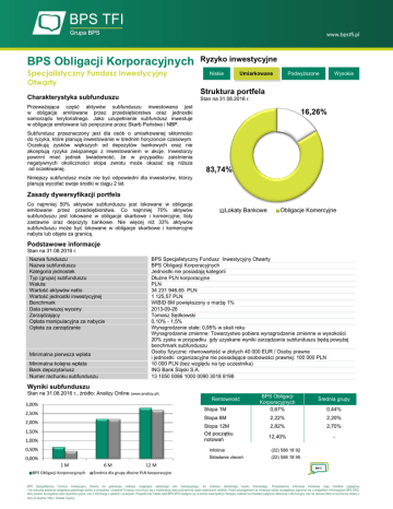 BPS Obligacji Korporacyjnych Specjalistyczny Fundusz Inwestycyjny Otwarty Ryzyko inwestycyjne Niskie Podwyższone Umiarkowane Wysokie Struktura portfela Charakterystyka subfunduszu Stan na 31.08.2016 r. Przeważająca część aktywów subfunduszu inwestowana jest w obligacje emitowane przez przedsiębiorstwa oraz jednostki samorządu terytorialnego. Jako uzupełnienie subfundusz inwestuje w obligacje emitowane lub poręczone przez Skarb Państwa i NBP. Subfundusz przeznaczony jest dla osób o umiarkowanej skłonności do ryzyka, które planują inwestowanie w średnim horyzoncie czasowym. Oczekują zysków większych od depozytów bankowych oraz nie akceptują ryzyka związanego z inwestowaniem w akcje. Inwestorzy powinni mieć jednak świadomość, że w przypadku zaistnienia negatywnych okoliczności stopa zwrotu może okazać się niższa od oczekiwanej. 16,26% 83,74% Niniejszy subfundusz może nie być odpowiedni dla inwestorów, którzy planują wycofać swoje środki w ciągu 2 lat. Zasady dywersyfikacji portfela Co najmniej 50% aktywów subfunduszu jest lokowane w obligacje emitowane przez przedsiębiorstwa. Co najmniej 70% aktywów subfunduszu jest lokowane w obligacje skarbowe i komercyjne, listy zastawne oraz depozyty bankowe. Nie więcej niż 33% aktywów subfunduszu może być lokowane w obligacje skarbowe i komercyjne nabyte lub objęte za granicą. Lokaty Bankowe Obligacje Komercyjne Podstawowe informacje Stan na 31.08.2016 r. Nazwa funduszu Nazwa subfunduszu Kategoria jednostek Typ (grupa) subfunduszu Waluta Wartość aktywów netto Wartość jednostki inwestycyjnej Benchmark Data pierwszej wyceny Zarządzający Opłata manipulacyjna za nabycie Opłata za zarządzanie Minimalna pierwsza wpłata Minimalna kolejna wpłata Bank depozytariusz Numer rachunku subfunduszu BPS Specjalistyczny Fundusz Inwestycyjny Otwarty BPS Obligacji Korporacyjnych Jednostki nie posiadają kategorii Dłużne PLN korporacyjne PLN 34 231 946,65 PLN 1 125,57 PLN WIBID 6M powiększony o marżę 1% 2013-09-26 Tomasz Sędkowski 0,10% - 1,5% Wynagrodzenie stałe: 0,95% w skali roku Wynagrodzenie zmienne: Towarzystwo pobiera wynagrodzenie zmienne w wysokości 20% zysku w przypadku gdy uzyskane wyniki zarządzania subfunduszu będą powyżej benchmark subfunduszu Osoby fizyczne: równowartość w złotych 40 000 EUR / Osoby prawne i jednostki organizacyjne nie posiadające osobowości prawnej: 100 000 PLN 10 000 PLN (bez względu na typ uczestnika) ING Bank Śląski S.A. 13 1050 0086 1000 0090 3018 8198 Wyniki subfunduszu Stan na 31.08.2016 r., źródło: Analizy Online (www.analizy.pl) Średnia grupy Stopa 1M BPS Obligacji Korporacyjnych 0,67% Stopa 6M 2,22% 2,20% Stopa 12M Od początku notowań 2,82% 2,70% 12,40% - Rentowność 3,00% 2,50% 2,00% 1,50% 1,00% Agent Transferowy ProService AT Sp. z o. o. 0,50% Infolinia (22) 588 18 92 0,00% Składanie zleceń (22) 588 18 95 1M BPS Obligacji Korporacyjnych 6M 0,44% 12 M Średnia dla grupy dłużne PLN korporacyjne BPS Specjalistyczny Fundusz Inwestycyjny Otwarty nie gwarantuje realizacji osiągnięcia założonego celu inwestycyjnego, ani realizacji określonego wyniku finansowego. Przedstawione informacje finansowe mają charakter poglądowy i nie stanowią gwarancji osiągnięcia podobnego wyniku w przyszłości. Uczestnik Funduszu musi liczyć się z możliwością utraty przynajmniej części wpłaconych środków. Przed przystąpieniem do inwestycji należy szczegółowo zapoznać się z prospektem informacyjnym BPS SFIO, który zawiera szczegółowy opis czynników ryzyka, oraz z informacją o opłatach i prowizjach. Prospekt oraz Tabela opłat BPS SFIO dostępne są na stronie www.bpstfi.pl. Niniejszy materiał ma charakter wyłącznie reklamowy i informacyjny oraz nie stanowi oferty w rozumieniu Ustawy z dnia 23 kwietnia 1964 r. Kodeks Cywilny.