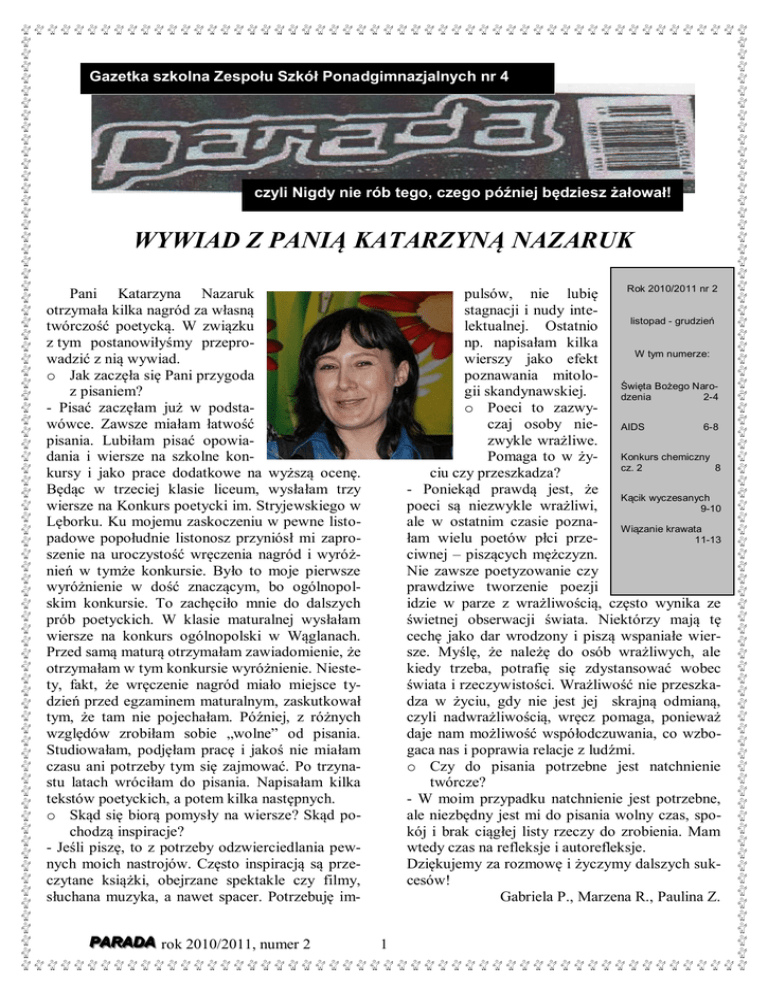 Gazetka szkolna Zespołu Szkół Ponadgimnazjalnych nr 4 czyli Nigdy nie rób tego, czego później będziesz żałował! WYWIAD Z PANIĄ KATARZYNĄ NAZARUK Rok 2010/2011 nr 2 pulsów, nie lubię stagnacji i nudy intelistopad - grudzień lektualnej. Ostatnio np. napisałam kilka W tym numerze: wierszy jako efekt poznawania mitoloŚwięta Bożego Narogii skandynawskiej. dzenia 2-4 o Poeci to zazwyczaj osoby nie- AIDS 6-8 zwykle wrażliwe. Pomaga to w ży- Konkurs chemiczny cz. 2 8 ciu czy przeszkadza? - Poniekąd prawdą jest, że Kącik wyczesanych poeci są niezwykle wrażliwi, 9-10 ale w ostatnim czasie pozna- Wiązanie krawata łam wielu poetów płci prze11-13 ciwnej – piszących mężczyzn. Nie zawsze poetyzowanie czy prawdziwe tworzenie poezji idzie w parze z wrażliwością, często wynika ze świetnej obserwacji świata. Niektórzy mają tę cechę jako dar wrodzony i piszą wspaniałe wiersze. Myślę, że należę do osób wrażliwych, ale kiedy trzeba, potrafię się zdystansować wobec świata i rzeczywistości. Wrażliwość nie przeszkadza w życiu, gdy nie jest jej skrajną odmianą, czyli nadwrażliwością, wręcz pomaga, ponieważ daje nam możliwość współodczuwania, co wzbogaca nas i poprawia relacje z ludźmi. o Czy do pisania potrzebne jest natchnienie twórcze? - W moim przypadku natchnienie jest potrzebne, ale niezbędny jest mi do pisania wolny czas, spokój i brak ciągłej listy rzeczy do zrobienia. Mam wtedy czas na refleksje i autorefleksje. Dziękujemy za rozmowę i życzymy dalszych sukcesów! Gabriela P., Marzena R., Paulina Z. Pani Katarzyna Nazaruk otrzymała kilka nagród za własną twórczość poetycką. W związku z tym postanowiłyśmy przeprowadzić z nią wywiad. o Jak zaczęła się Pani przygoda z pisaniem? - Pisać zaczęłam już w podstawówce. Zawsze miałam łatwość pisania. Lubiłam pisać opowiadania i wiersze na szkolne konkursy i jako prace dodatkowe na wyższą ocenę. Będąc w trzeciej klasie liceum, wysłałam trzy wiersze na Konkurs poetycki im. Stryjewskiego w Lęborku. Ku mojemu zaskoczeniu w pewne listopadowe popołudnie listonosz przyniósł mi zaproszenie na uroczystość wręczenia nagród i wyróżnień w tymże konkursie. Było to moje pierwsze wyróżnienie w dość znaczącym, bo ogólnopolskim konkursie. To zachęciło mnie do dalszych prób poetyckich. W klasie maturalnej wysłałam wiersze na konkurs ogólnopolski w Wąglanach. Przed samą maturą otrzymałam zawiadomienie, że otrzymałam w tym konkursie wyróżnienie. Niestety, fakt, że wręczenie nagród miało miejsce tydzień przed egzaminem maturalnym, zaskutkował tym, że tam nie pojechałam. Później, z różnych względów zrobiłam sobie „wolne” od pisania. Studiowałam, podjęłam pracę i jakoś nie miałam czasu ani potrzeby tym się zajmować. Po trzynastu latach wróciłam do pisania. Napisałam kilka tekstów poetyckich, a potem kilka następnych. o Skąd się biorą pomysły na wiersze? Skąd pochodzą inspiracje? - Jeśli piszę, to z potrzeby odzwierciedlania pewnych moich nastrojów. Często inspiracją są przeczytane książki, obejrzane spektakle czy filmy, słuchana muzyka, a nawet spacer. Potrzebuję imP PA AR RA AD DA A rok 2010/2011, numer 2 1 ŚWIĘTA BOŻEGO NARODZENIA Boże Narodzenie, obok Wielkanocy, jest najuroczyściej obchodzonym świętem. Jest to święto rodzinne, upamiętniające narodziny Jezusa Chrystusa, przeważnie spędzane w gronie najbliższych ludzi. Okres Świąt Bożego Narodzenia to czas pełen magii, czarów, radości i piękna; czas spełniania marzeń i okazywania sobie wzajemnie troski i miłości. To w te dni, zapatrzeni w roziskrzoną choinkę, w uśmiechnięte twarze naszych bliskich, odkrywamy sens życia. Jednocześnie te właśnie święta, jak żadne inne, skłaniają nas do zadumy, zamyślenia i wspomnień. Święta Bożego Narodzenia to dla Polaków najważniejsze i jednocześnie najbogatsze w tradycje ludowe święta. W liturgii kościelnej i w zwyczajach ludowych święta Bożego Narodzenia poprzedza okres Adwentu: czas pobożnego i radosnego, pełnego wiary oczekiwania na przyjście Pana. W pierwszą niedzielę Adwentu zawieszano w pokojach pod sufitem wianek zrobiony z gałęzi choinki i przyozdobiony czerwonymi wstążkami. Na wieńcu zapalano jedną świeczkę, w każdą kolejną niedzielę dodawano następną. Najwięcej zwyczajów ludowych wiąże się z ostatnim dniem Adwentu, czyli z Wigilią. Słowo "wigilia" pochodzi z języka łacińskiego i oznacza czuwanie. Z chwilą ukazania sie pierwszej gwiazdy, pilnie wypatrywanej przez dzieci, po przełamaniu się opłatkiem i złożeniu życzeń, wszyscy domownicy zasiadają do wspólnego posiłku. Liczba, rodzaj i kolejność dań pojawiających się na wigilijnym stole zależy od lokalnej tradycji. Wszędzie jednak, bez wyjątku, są to dania postne. W przeszłości przestrzegano zasady, aby spróbować wszystkich przygotowanych na Wigilię potraw. Dzięki temu miało ich nie zabraknąć w nadchodzącym roku. Powszechnym obyczajem w polskich domach jest kładzenie siana pod obrus, którym nakryto stół wigilijny, a także zostawianie jednego wolnego miejsca przy stole. Ma to symbolizować pamięć o naszych bliskich, którzy nie mogą spędzić z nami świąt. W wigilijny wieczór gospodarze pamiętali także o swoich zwierzętach domowych, którym P PA AR RA AD DA A rok 2010/2011, numer 2 dawali resztki potraw pozostałych z wieczerzy, wymieszanych z opłatkiem. Wierzono również, że o północy zwierzęta mówią ludzkim językiem, lecz podsłuchanie takiej rozmowy nie przynosiło szczęścia. Na Wigilię Bożego Narodzenia niemal każda polska rodzina umieszcza w swoim mieszkaniu i dekoruje choinkę. Jest to jedna z najmłodszych tradycji wigilijnych. Początkowo popularne było zawieszanie u sufitu wierzchołka sosny, jodły lub świerku. Drzewko to miało chronić dom i jego mieszkańców od złych mocy. Choinka w obecnej formie