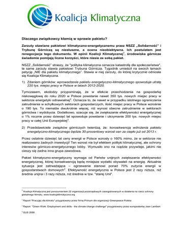 Dlaczego związkowcy kłamią w sprawie pakietu? Zarzuty stawiane pakietowi klimatyczno-energetycznemu przez NSZZ „Solidarność” i Trybunę Górniczą są niesłuszne, a ocena nieobiektywna. Ich postulatem jest renegocjacja tego dokumentu. W opinii Koalicji Klimatycznej1, środowiska górnicze świadomie pomijają liczne korzyści, które niesie ze sobą pakiet. NSZZ „Solidarność” straszy, że "polityka klimatyczna oznacza katastrofę dla społeczeństwa", te same zarzuty stawia pakietowi Trybuna Górnicza. Tygodnik umieścił na swoich łamach petycję „NIE dla pakietu klimatycznego”. Stawia w niej zarzuty, do której krytycznie odniosła się Koalicja Klimatyczna. 1) Zdaniem górników: wprowadzenie pakietu energetyczno-klimatycznego spowoduje utratę 220 tys. miejsc pracy w Polsce w latach 2012-2020. Tymczasem, ekolodzy przypominają, że w efekcie przechodzenia na gospodarkę niskowęglową do roku 2020 w Polsce powstanie nawet 350 tys. nowych miejsc pracy w sektorze energetyki odnawialnej2. Oznacza to, że nawet w przypadku istotnego ograniczenia zatrudnienia w schyłkowych sektorach gospodarczych, ilość miejsc pracy w Polsce wzrośnie o 190 tys. To niemalże dwukrotnie więcej, niż wynosi obecne zatrudnienie w sektorach górnictwa i wydobycia. Dodatkowo, szacuje się, że zwiększanie efektywności energetycznej o 1% rocznie przez dziesięć lat spowoduje powstanie i utrzymanie 200 tys. nowych miejsc pracy w całej Unii Europejskiej3. 2) Przedstawiciele związków górniczych twierdzą, że: konsekwencją wdrożenia pakietu energetyczno-klimatycznego będzie 30-procentowy wzrost cen za ciepło już od 2013 r. Przez ostatnie dziesięć lat ceny energii w Polsce wzrosły o 160% mimo, że w sektorze nie realizowano żadnych inwestycji! Ten wzrost nie był efektem polityki klimatycznej, ale ochrony interesów górniczo-energetycznego lobby. Wymusiło ono na rządzie przywileje, jakimi nie cieszy się żadna inna grupa zawodowa. Pakiet klimatyczno-energetyczny wymaga od Państw unijnych zwiększania efektywności energetycznej, której konsekwencją będą mniejsze wydatki obywateli na energię. Aktualnie sytuacja jest zatrważająca – ogrzewanie stanowi ponad 70% zużycia energii w gospodarstwach domowych4. Efektywność energetyczna w Polsce jest 2 razy niższa, niż średnia unijna i 3 razy niższa, niż średnia w tzw. "starej Unii". 1 Koalicja Klimatyczna jest porozumieniem 22 organizacji pozarządowych zaangażowanych w działania na rzecz ochrony globalnego klimatu, www.koalicjaklimatyczna.org 2 Raport "Pracując dla klimatu" przygotowany przez firmę Primum dla organizacji Greenpeace Polska 3 Raport "Green Work: Employment and skills - the climate change challenge" przygotowany przez europosłankę Jean Lambert 4 GUS 2006 Lobby paliwo-energetyczne korzysta na większym zużyciu energii. Rozwiązań proefektywnościowych nie wspiera także rząd, który pozostaje zakładnikiem związków zawodowych i obawia się zmniejszenia wpływów do budżetu z podatków i akcyzy. 3) W swoich materiałach związkowcy straszą, że: w Polsce w latach 2014-2020 wdrożenie pakietu energetyczno-klimatycznego pociągnie za sobą stuprocentowy wzrost cen energii. Wzrost cen energii nie będzie wynikiem wejścia w życie pakietu klimatycznoenergetycznego, ale fatalnego zarządzania sektorem energetycznym w naszym kraju. Kolejne rządy, koncerny energetyczne oraz związki zawodowe powinny wziąć na siebie odpowiedzialność za wieloletnie zaniedbania. Niemal 60 proc. polskich mocy wytwórczych ma co najmniej 30 lat i wymaga natychmiastowej wymiany. Tragiczny jest również stan sieci przesyłowych, zakładanych w Polsce w latach 60-tych i 70-tych. Polska ma najwyższy koszt wytwarzania jednostki energii w Europie, co wynika m.in. z nadmiernego zatrudnienia w tym sektorze, dwukrotnie wyższego na jednostkę wytworzonej energii elektrycznej niż w najlepszych elektrowniach na Zachodzie Europy. Za niemoralne należy uznać szantażowanie społeczeństwa i rządu dla wywalczenia gwarancji zatrudnienia sięgających ponad 10 lat – niezależnie od efektywności pracy i osiąganych wyników ekonomicznych. Za te przywileje zapłacimy wszyscy. Ich efektem jest jeden z najwyższych w Europie udział kosztów energii w budżetach domowych. Gdyby nie partykularne interesy menadżerów związkowych, działania modernizacyjne można byłoby realizować od dwudziestu lat. 4) Zdaniem górników: zastosowanie w Polsce zasad pakietu energetyczno-klimatycznego poskutkuje spadkiem PKB od 2% do 8%! Koalicja Klimatyczna nie twierdzi, że odejście od węgla i wdrażania wymogów ochrony klimatu będzie w Polsce procesem łatwym. Jak wynika z szacunków Banku Światowego koszty dla gospodarki i społeczeństwa będą na poziomie 1-1,5% zmniejszenia PKB rocznie. Jednak jeszcze przed rokiem 2030 zmiana charakteru gospodarki na niskoemisyjny przyczyni się do przyspieszenia wzrostu gospodarczego. Ważny, choć zupełnie pominięty przez NSZZ „Solidarność" i Trybunę Górniczą jest również aspekt wpływu zmniejszenia emisji do atmosfery na zdrowie. Badania mówią, że zwiększenie celu redukcyjnego z 20 na 30% przyniesie w Polsce 4 miliardy euro zysku na opiece zdrowotnej rocznie5! --------W ocenie Koalicji Klimatycznej obecny protest związków zawodowych ma na celu obronę ich własnych partykularnych interesów, oraz interesów sektora energetycznego, a nie działanie na korzyść społeczeństwa i gospodarki. Chronią one schyłkową branżę przed unowocześnieniem i dostosowaniem do współczesnych warunków rynkowych. 5 Raport "Acting now for better health: A 30% target for EU climate policy przygotowany przez Health and Environment Alliance oraz Health Care Without Harm Dzisiaj rynek produktów i usług niskowęglowych na świecie szacuje się na 3 mld dolarów i gwałtownie rośnie. Jeśli chcemy uczestniczyć w tym rynku, nie możemy pozwolić by skansen wygrał z nowoczesnością!