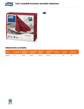 Tork Linstyle® bordowa serwetka obiadowa 1 właściwości produktu artykuł Typ składania Długość po rozwinięciu Szerokość po rozwinięciu Długość po złożeniu Szerokość po złożeniu Warstwy Nadruk Tłoczenie 478855 1/4 39 cm 39 cm 19.5 cm 19.5 cm 1 tak tak Tork Linstyle® bordowa serwetka obiadowa dane wysyłki jednostka klienta jednostka transportu paleta EAN 7322540680782 EAN 7322540653090 EAN 7322540653106 elementy 50 elementy 600 elementy 12000 materiał Plastic jednostki klienta 12 jednostki klienta 240 wysokość 90 mm materiał Carton wysokość 1250 mm szerokość 200 mm wysokość 220 mm szerokość 800 mm długość 200 mm szerokość 410 mm długość 1200 mm objętość 3.6 dm3 długość 600 mm objętość 1.1 m3 masa netto 418 g objętość 54.1 dm3 masa netto 100.4 kg masa brutto 423 g masa netto 5.0 kg masa brutto 115.4 kg masa brutto 5.8 kg
