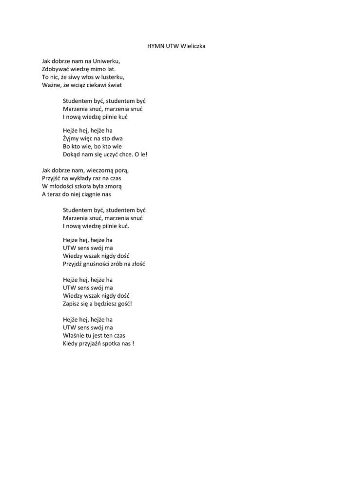 HYMN UTW Wieliczka Jak dobrze nam na Uniwerku, Zdobywać wiedzę mimo lat. To nic, że siwy włos w lusterku, Ważne, że wciąż ciekawi świat Studentem być, studentem być Marzenia snuć, marzenia snuć I nową wiedzę pilnie kuć Hejże hej, hejże ha Żyjmy więc na sto dwa Bo kto wie, bo kto wie Dokąd nam się uczyć chce. O le! Jak dobrze nam, wieczorną porą, Przyjść na wykłady raz na czas W młodości szkoła była zmorą A teraz do niej ciągnie nas Studentem być, studentem być Marzenia snuć, marzenia snuć I nową wiedzę pilnie kuć. Hejże hej, hejże ha UTW sens swój ma Wiedzy wszak nigdy dość Przyjdź gnuśności zrób na złość Hejże hej, hejże ha UTW sens swój ma Wiedzy wszak nigdy dość Zapisz się a będziesz gość! Hejże hej, hejże ha UTW sens swój ma Właśnie tu jest ten czas Kiedy przyjaźń spotka nas !