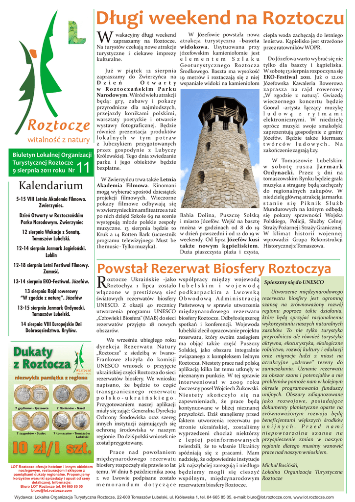 Długi weekend na Roztoczu W W Józefowie powstała nowa atrakcja turystyczna -baszta widokowa. Usytuowana przy józefowskim kamieniołomie jest e l e m e n t e m S z l a k u G e o t u r ys t yc z n e go Roz to c z a Już w piątek 12 sierpnia Środkowego. Baszta ma wysokość zapraszamy do Zwierzyńca na 19 metrów i roztaczają się z niej D z i e ń O t w a r t y wspaniałe widoki na kamieniołom w Roztoczańskim Parku Narodowym. Wśród wielu atrakcji będą: gry, zabawy i pokazy przyrodnicze dla najmłodszych, przejazdy konikami polskimi, warsztaty poetyckie i otwarcie wystawy fotograficznej. Będzie również prezentacja produktów lokalnych w tym potraw z lubczykiem przygotowanych przez gospodynie z Lubyczy Biuletyn Lokalnej Organizacji Królewskiej. Tego dnia zwiedzanie parku i jego obiektów będzie Turystycznej Roztocze bezpłatne. 9 sierpnia 2011 roku Nr wakacyjny długi weekend zapraszamy na Roztocze. Na turystów czekają nowe atrakcje turystyczne i ciekawe imprezy kulturalne. 11 Kalendarium 5-15 VIII Letnia Akademia Filmowa. Zwierzyniec. Dzień Otwarty w Roztoczańskim Parku Narodowym. Zwierzyniec 12 sierpnia Wakacje z Sonatą. Tomaszów Lubelski. 12-14 sierpnia Jarmark Jagieloński. Lublin 12-18 sierpnia Letni Festiwal Filmowy. Zamość. 13-14 sierpnia EKO-Festiwal. Józefów. 13 sierpnia Rajd rowerowy “W zgodzie z naturą”. Józefów 13-15 sierpnia Jarmark Ordynacki. Tomaszów Lubelski. 14 sierpnia VIII Europejskie Dni Dobrosąsiedztwa. Kryłów. Dukaty z Roztocza niezwykła pamiątka z regionu 7 gryfinów - Tyszowce 7 szypotów - Susiec 7 florianów - Narol 7 tomaszów - Tomaszów Lubelski 10 zł/1 szt. LOT Roztocze oferuje hotelom i innym obiektom noclegowym, restauracjom i sklepom z pamiątkami dukaty regionalne. Proponujemy korzystne warunki sprzedaży i upust od ceny detalicznej. Informacje: Biuro LOT Roztocze tel. 84 665 85 05 [email protected] W Zwierzyńcu trwa także Letnia Akademia Filmowa. Kinomani mogą wybierać spośród dziesiątek projekcji filmowych. Wieczorne pokazy filmowe odbywają się w zwierzynieckim amfiteatrze a tuż po nich dzięki Szkole 69 na scenie występują młode polskie zespoły muzyczne. 13 sierpnia będzie to Kruk a 14 Rotten Bark (uczestnik programu telewizyjnego Must be the music - Tylko muzyka). Babia Dolina, Puszczę Solską i miasto Józefów. Wejść na basztę można w godzinach od 8 do 19 w dzień powszedni i od 12 do 19 w weekendy. Od lipca Józefów kusi także nowym kąpieliskiem. Duża piaszczysta plaża i czysta, ciepła woda zachęcają do letniego lenistwa. Kąpielisko jest strzeżone przez ratowników WOPR. Do Józefowa warto wybrać się nie tylko dla baszty i kąpieliska. W sobotę 13 sierpnia rozpoczyna się EKO-Festiwal 2011. Już o 12.00 Józefowska Kawaleria Rowerowa zaprasza na rajd rowerow y „W zgodzie z naturą”. Gwiazdą wieczornego koncertu będzie Gooral -artysta łączący muzykę l u d o w ą z r y t m a m i elektronicznymi. W niedzielę oprócz muzyki swoje smakołyki zaprezentują gospodynie z gminy Józefów. Będzie także kiermasz twórców ludowych. Na zakończenie zagrają Łzy. W Tomaszowie Lubelskim w sobotę rusza Jarmark Ordynacki. Przez 3 dni na tomaszowskim Rynku będzie grała muzyka a stragany będą zachęcały do regionalnych zakupów. W niedzielę główną atrakcją jarmarku stanie się Piknik Służb Mundurowych na którym odbędą się pokazy sprawności Wojska Polskiego, Policji, Służby Celnej Straży Pożarnej i Straży Granicznej. W klimat historii wojennej wprowadzi Grupa Rekonstrukcji Historycznej z Tomaszowa. Powstał Rezerwat Biosfery Roztoczya R oztocze Ukraińskie -jako Roztochya 1 lipca zostało włączone w prestiżową sieć światowych rezerwatów biosfery UNESCO. Z okazji 40 rocznicy utworzenia programu UNESCO „Człowiek i Biosfera” (MAB) do sieci rezerwatów przyjęto 18 nowych obszarów. We wrześniu ubiegłego roku dyrekcja Rezerwatu Natur y „Roztocze” z siedzibą w IwanoFrankowe złożyła do komisji UNESCO wniosek o przyjęcie ukraińskiej części Roztocza do sieci rezerwatów biosfery. We wniosku napisano, że będzie to część transgranicznego rezerwatu polsko-ukraińskiego. Przygotowaniem naszej aplikacji miały się zająć: Generalna Dyrekcja Ochrony Środowiska oraz szereg innych instytucji zajmujących się ochroną środowiska w naszym regionie. Do dziś polski wniosek nie został przygotowany. Prace nad powołaniem międzynarodowego rezerwatu biosfery rozpoczęły się prawie 10 lat temu. W dniu 8 października 2004 r. we Lwowie podpisane zostało memorandum dotyczące współpracy między wojewodą lubelskim i wojewodą podkarpackim a Lwowską Obwodową Administracją Państwową w sprawie utworzenia międzynarodowego rezerwatu biosfery Roztocze. Odbyło się szereg spotkań i konferencji. Wojewoda lubelski zlecił opracowanie projektu rezerwatu, który swoim zasięgiem ma objąć także część Puszczy Solskiej, jako obszaru integralnie związanego z kompleksem leśnym Roztocza. Niestety prace nad polską aplikacją kilka lat temu utknęły w nieznanym punkcie. W tej sprawie interweniował w 2009 roku ówczesny poseł Wojciech Żukowski. Niestety skończyło się na zapewnieniach, że prace będą kontynuowane w bliżej nieznanej przyszłości. Dziś stanęlismy przed faktem utworzenia rezerwatu po stronie ukraińskiej, zostaliśmy wyprzedzeni chociaż niektórzy z lepiej poinformowanych twierdzili, że to własnie Ukraińcy spóźniają się z pracami. Mam nadzieję, że odpowiednie instytucje jak najszybciej zareagują i niedługo będziemy mogli się cieszyć wspólnym, międzynarodowym rezerwatem biosfery Roztocze. Spieszmy się do UNESCO Utworzenie międzynarodowego rezerwatu biosfery jest ogromną szansą na zrównoważony rozwój regionu poprzez takie działania, które będą sprzyjać racjonalnemu wykorzystaniu naszych naturalnych zasobów. To nie tylko turystyka przyrodnicza ale również turystyka aktywna, ekoturystyka, ekol
