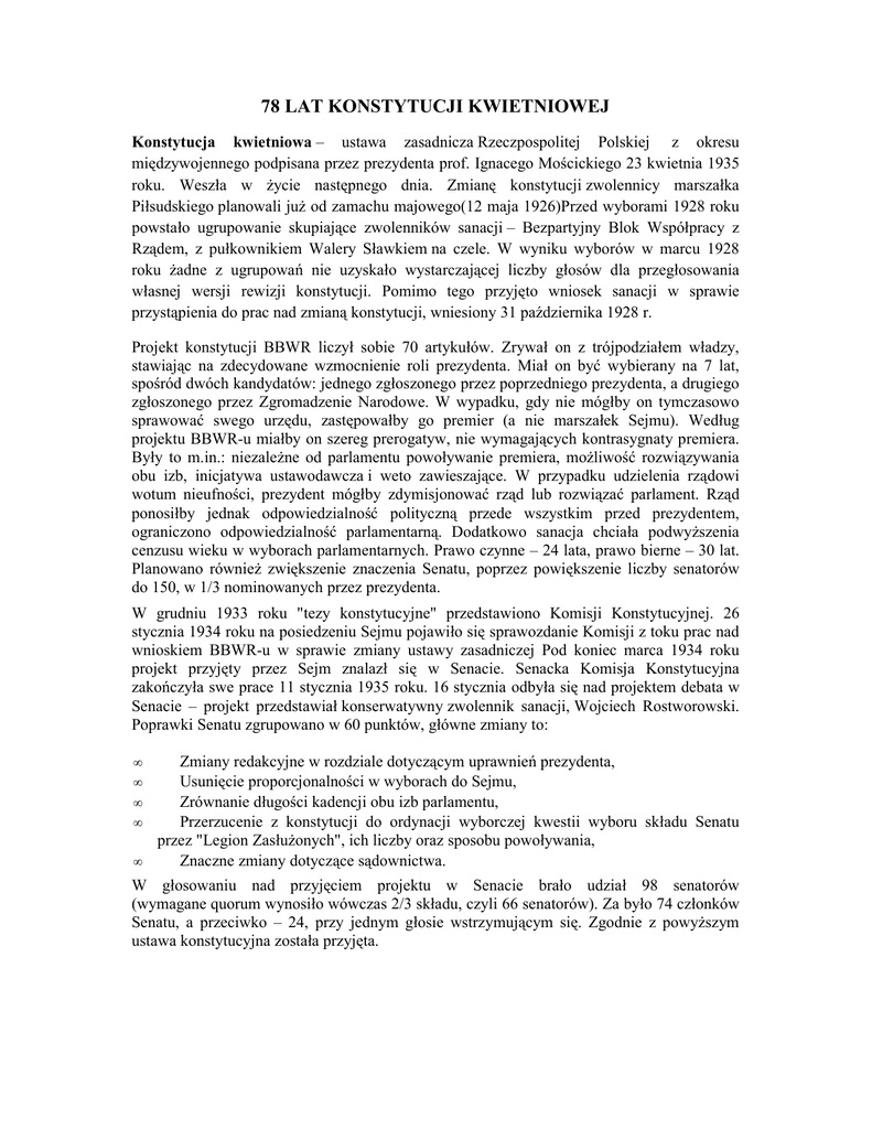 78 LAT KONSTYTUCJI KWIETNIOWEJ Konstytucja kwietniowa – ustawa zasadnicza Rzeczpospolitej Polskiej z okresu międzywojennego podpisana przez prezydenta prof. Ignacego Mościckiego 23 kwietnia 1935 roku. Weszła w Ŝycie następnego dnia. Zmianę konstytucji zwolennicy marszałka Piłsudskiego planowali juŜ od zamachu majowego(12 maja 1926)Przed wyborami 1928 roku powstało ugrupowanie skupiające zwolenników sanacji – Bezpartyjny Blok Współpracy z Rządem, z pułkownikiem Walery Sławkiem na czele. W wyniku wyborów w marcu 1928 roku Ŝadne z ugrupowań nie uzyskało wystarczającej liczby głosów dla przegłosowania własnej wersji rewizji konstytucji. Pomimo tego przyjęto wniosek sanacji w sprawie przystąpienia do prac nad zmianą konstytucji, wniesiony 31 października 1928 r. Projekt konstytucji BBWR liczył sobie 70 artykułów. Zrywał on z trójpodziałem władzy, stawiając na zdecydowane wzmocnienie roli prezydenta. Miał on być wybierany na 7 lat, spośród dwóch kandydatów: jednego zgłoszonego przez poprzedniego prezydenta, a drugiego zgłoszonego przez Zgromadzenie Narodowe. W wypadku, gdy nie mógłby on tymczasowo sprawować swego urzędu, zastępowałby go premier (a nie marszałek Sejmu). Według projektu BBWR-u miałby on szereg prerogatyw, nie wymagających kontrasygnaty premiera. Były to m.in.: niezaleŜne od parlamentu powoływanie premiera, moŜliwość rozwiązywania obu izb, inicjatywa ustawodawcza i weto zawieszające. W przypadku udzielenia rządowi wotum nieufności, prezydent mógłby zdymisjonować rząd lub rozwiązać parlament. Rząd ponosiłby jednak odpowiedzialność polityczną przede wszystkim przed prezydentem, ograniczono odpowiedzialność parlamentarną. Dodatkowo sanacja chciała podwyŜszenia cenzusu wieku w wyborach parlamentarnych. Prawo czynne – 24 lata, prawo bierne – 30 lat. Planowano równieŜ zwiększenie znaczenia Senatu, poprzez powiększenie liczby senatorów do 150, w 1/3 nominowanych przez prezydenta. W grudniu 1933 roku "tezy konstytucyjne" przedstawiono Komisji Konstytucyjnej. 26 stycznia 1934 roku na posiedzeniu Sejmu pojawiło się sprawozdanie Komisji z toku prac nad wnioskiem BBWR-u w sprawie zmiany ustawy zasadniczej Pod koniec marca 1934 roku projekt przyjęty przez Sejm znalazł się w Senacie. Senacka Komisja Konstytucyjna zakończyła swe prace 11 stycznia 1935 roku. 16 stycznia odbyła się nad projektem debata w Senacie – projekt przedstawiał konserwatywny zwolennik sanacji, Wojciech Rostworowski. Poprawki Senatu zgrupowano w 60 punktów, główne zmiany to: • • • • • Zmiany redakcyjne w rozdziale dotyczącym uprawnień prezydenta, Usunięcie proporcjonalności w wyborach do Sejmu, Zrównanie długości kadencji obu izb parlamentu, Przerzucenie z konstytucji do ordynacji wyborczej kwestii wyboru składu Senatu przez "Legion ZasłuŜonych", ich liczby oraz sposobu powoływania, Znaczne zmiany dotyczące sądownictwa. W głosowaniu nad przyjęciem projektu w Senacie brało udział 98 senatorów (wymagane quorum wynosiło wówczas 2/3 składu, czyli 66 senatorów). Za było 74 członków Senatu, a przeciwko – 24, przy jednym głosie wstrzymującym się. Zgodnie z powyŜszym ustawa konstytucyjna została przyjęta. Prezydent I gnacy Mościcki podpisuje konstytucję kwietniową 23 kwietnia 1935 Poprawki Senatu zostały zaakceptowane przez sejmową Komisję Konstytucyjną i 23 marca 1935 roku sprawa stanęła na porządku obrad niŜszej izby parlamentu. Po zakończeniu debaty przyszedł czas na głosowanie nad przyjęciem poprawek Senatu. W głosowaniu udział brało 399 posłów, nieobecnych było 42 członków izby, głównie reprezentujących mniejszości narodowe. Za było 260 posłów, przeciw – 139. 23 kwietnia 1935 roku konstytucja została podpisana przez prezydenta Ignacego Mościckiego i przez członków rządu. Dzień później, wraz z ogłoszeniem w "Dzienniku Ustaw", konstytucja kwietniowa weszła w Ŝycie. Konstytucja kwietniowa wysuwała państwo na plan pierwszy, ale traktowane jako struktura organizująca Ŝycie społeczne i gwarantująca prawa jednostki. Obywatel miał zapewnioną równość wobec prawa, moŜliwość rozwoju wartości osobistych oraz wolność sumienia, słowa i zrzeszeń. OPRACOWANIE WŁASNE: RYSZARD JAŚKOWSKI WYKORZYSTANO: WIKIPEDIA