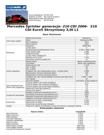 Cena katalogowa: 99 915 PLN Dopłata za kolor: Nie wybrano koloru Wyposażenie dod.:Nie wybrano Cena końcowa: 99 915 PLN Mercedes Sprinter generacja: 210 CDI 2006- 210 CDI Euro5 Skrzyniowy 3,0t L1 Dane Techniczne Informacje ogólne Nadwozie Układ napędowy Dane eksploatacyjne diesel (olej napędowy) Przestrzeń ładunkowa Gwarancja Uwagi Rodzaj samochodu dostawczy Klasa Dostawczy MCV Rok modelowy 2013 Rok produkcji 2013 Nadwozie SKRZYNIA Liczba drzwi 2 Długość/Szerokość/Wysokość [mm] 5 305/ 1 990/ 2 365 Masa własna [kg] 1 805 Ładowność [kg] 1 385 Liczba miejsc siedzących 2 Rozstaw osi w [mm] 3 250 Minimalna średnica skrętu [m] 12 Rodzaj silnika diesel z doładowaniem Typ paliwa diesel (olej napędowy) Pojemność [cm3] 2 143 Moc w [KM] 95 Moc w [kW] 70 Prędkość obr. dla maksymalnej mocy - od [obr./min] 3 800 Maksymalny moment obrotowy [Nm] 250 Maksymalny moment obrotowy [kGm] 26 Prędkość obr. dla maksymalnego momentu obr [obr./min] 1 400 - 2 400 Typ napędu tył Skrzynia biegów manualna, liczba biegów 6 Zużycie paliwa cykl miejski [l/100km] 11.3 Zużycie paliwa cykl mieszany [l/100km] 8.9 Zużycie paliwa cykl pozamiejski [l/100km] 7.5 Pojemność zbiornika paliwa [l] 75 Emisja CO2 [g/km] 235 Długość przestrzeni ładunkowej (mm): 2850 Szerokość przestrzeni ładunkowej (mm): 2030 Wysokość przestrzeni ładunkowej (mm): 400 Objętość przestrzeni ładunkowej (m3): 2.3 Gwarancja na silnik i podzespoły 2 lata Gwarancja na lakier 2 lata Gwarancja na perforację nadwozia 12 lat Załączone zdjęcie przedstawia wersję skrzyniową z podwójną kabiną. Kolorystyka nadwozia Nazwa koloru biel arktyczna błękit anemonu błękit stalowy czerwień hibiskusa czerwień welwetowa zieleń morska źółty kalcytowy błękit jaspisu metalik czerń węgla metalik czerwień bursztynowa metalik Cena(PLN) 0 PLN 0 PLN 0 PLN 0 PLN 0 PLN 0 PLN 0 PLN 4442 PLN 4442 PLN 4442 PLN srebrny brylantowy metalik 4442 PLN Wyposażenie standardowe Nazwa elementu akumulator 12V/72Ah alternator 14V/90A asystent hamowania (BAS) boczne listwy ochronne centralny zamek sterowany falami radiowymi dwudrożne głośniki z przodu filtr cząstek stałych filtr paliwa z separatorem wody hamulce tarczowe na przedniej i tylnej osi immobiliser instalacja elektryczna 12V kierunkowskazy boczne w obudowach lusterek zewnętrznych koło zapasowe kontrolka informująca o awarii oświetlenia pojazdu kontrolka informująca o braku płynu w spryskiwaczu lusterka zewnętrzne regulowane mechanicznie z dodatkowymi lusterkami szerokokątnymi mocowanie koła zapasowego na końcu ramy napinacze pasów bezpieczeństwa dla przednich foteli narzędzia ogumienie 205/75 R16 C ogumienie letnie osłony przeciwsłoneczne kierowcy i pasażera poduszka powietrzna kierowcy półka nad przednią szybą przygotowanie do montażu modułu PSM przygotowanie do montażu radia reflektory z przezroczystymi szkłami regulacja zasięgu reflektorów resor piórowy poprzeczny z przodu resory tylne paraboliczne schowki na desce rozdzielczej siedzenie kierowcy w pełni regulowane system stabilizacji toru jazdy ADAPTIVE ESP szyby przednie sterowane elektrycznie tapicerka materiałowa czarna "Brasao" trzypunktowe pasy bezpieczeństwa (dla wszystkich miejsc) układ hamulcowy hydrauliczny dwuobwodowy układ hamulcowy wyposażony w układy ABS i EBV wspomaganie układu kierowniczego wyłącznik główny napięcia zagłówek regulowany dla siedzenia kierowcy i pasażera zderzak przedni ze zintegrowanym stopniem złącze rozruchowe (dodatkowy biegun dodatni) Wyposażenie dodatkowe Lista wyposażenia dodatkowego [A50] oś przednia wzmocniona [BE2] składana dźwignia hamulca ręcznego [C17] resory tylne obniżające wysokość krawędzi ramy [C21] resory tylne dwustopniowe [C33] wzmocnione resory tylne [C42] stabilizator tylnej osi pod ramą [C43] wzmocniony stabilizator tylej osi pod ramą [C45] wzmocniony stabilizator przedniej osi [C47] amortyzatory wzmocnione [C57] boczne belki przeciw najazdowe [C71] belka przeciw najazdowa tylna [C72] zderzaki do lakierowania [C94] rezygnacja z zderzaka przedniego [CF2] Pakiet A [CF3] Pakiet B [CF4] Pakiet C [CF5] Pakiet D [CL1] regulowana kolumna kierownicy w dwóch płaszczyznach [CL4] kierownica wielofunkcyjna z komputerem pokładowym [CM9] boczne listwy ochronne białe [CT1] tłumiki drgań Cena 920 PLN 180 PLN 677 PLN 493 PLN 493 PLN 606 PLN 737 PLN 451 PLN 363 PLN 1068 PLN 571 PLN 758 PLN -102 PLN 1057 PLN 1991 PLN 1857 PLN 2477 PLN 405 PLN 1307 PLN 499 PLN 293 PLN [E07] asystent ruszania [E28] akumulator dodatkowy [E36] przekaźnik oddzielający przy dodatkowym akumulatorze [E43] gniazdo wtykowe przyczepy, 13 stykowe [E46] gniazdo elektryczne 12V [E57] przygotowanie do montażu gniazda do haka holowniczego [ED3] antena sieci GSM, GPS, UMTS [ED4] akumulator AGM 12V 95Ah [ED5] parametrowany moduł specjalny [EE8] akumulator 12V/100Ah [EH4] zestaw głośnomówiący komfortowy [ET5] zestaw głośnomówiący standardowy [EV3] przygotowanie do montażu platformy załadunkowej [EV9] przygotowanie do podłączenia urządzeń przenośnych [F35] okno w tylnej ścianie kabiny [F46] spryskiwacze reflektorów [F49] ogrzewana szyba przednia [F61] lusterko wsteczne wewnętrzne [F66] schowek zamykany [FF8] wneka 1-DIN z przodu w podsufitce [FJ1] pokrywa schowka na środku deski rozdzielczej [FK1] osłona chłodnicy lakierowana na kolor (MB 9678) [FK3] atrapa chłodnicy chromowana [FR7] przygotowanie elektryczne do pomocy cofania [FR9] przygotowanie do montażu kamery cofania wraz z montażem [FS1] lusterko dla zabudowy o szerokości 2150-2300mm [FS2] lusterko do zabudowy o szerokości 2300-2360mm [FU2] lusterka dla asymetrycznych zabudów skrzyniowych [FY1] alarm antywłamaniowy EDW II, syrena z akumulatora [FY7] kluczyk z trzema przyciskami [FZ4] alarm antywłamaniowy EDW II [FZ5] alarm antywłamaniowy [FZ8] komfortowe otwieranie i zamykanie pilotem [FZ9] dwa dodatkowe klucze do pojazdu [G40] automatyczna skrzynia biegów