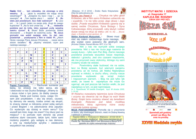 Hasła: Król … tam człowieka, nie ubranego w strój weselny. 2. „… jakże tu wszedłeś nie mając stroju weselnego?” 3. „Zwiążcie mu ręce i nogi i … go na zewnątrz”. 4. „Tam będzie płacz i … zębów” 5. „Bo wielu jest powołanych, lecz mało wybranych” 6. Lecz oni … to i poszli: jeden na swoje pole, drugi do swego kupiectwa” 7. „Na to król uniósł się …” 8. „… niebieskie podobne jest do króla, który wyprawił ucztę weselną swemu synowi”. 9. Słowo Boże porównuje bliskie obcowanie … z Bogiem do wybornej uczty. 10. Jezus gromadzi nas wokół swojego stołu, by dać nam przedsmak … przebywania z Nim w niebie 11. „Niech Ojciec naszego Pana Jezusa Chrystusa, … nasze serca swoim światłem.” 12. „abyśmy wiedzieli, czym jest nadzieja waszego ....” U Ż 2 P Z C E U 3 x x x W Z Ć 4 x Z R T N E 5 x P W A Y H 6 Z E C W Ż 7 x x x G E M x 8 x K Ł S O x 9 x C Ł W E A x 10 x x W P L E O 11 x x P Z N K 12 x P W A A x Papież Franciszek: “…– Rachunek sumienia jest łaską, bo strzeże nie tylko serca, ale i obecności w nas Ducha Świętego: „Wiemy to i Jezus mówi o tym jasno, że diabły zawsze wracają. Także pod koniec życia, czego On sam jest przykładem. I aby się strzec, czuwać, by demony nie weszły, trzeba umieć się skupić, to znaczy stanąć w milczeniu przed sobą samym i przed Bogiem i na zakończenie dnia zapytać: Co wydarzyło się dzisiaj w moim sercu? Czy wszedł tam ktoś, kogo nie znam? Czy klucz jest na miejscu? I to pomoże nam obronić się przed wieloma złymi rzeczami, także tymi, które sami możemy popełnić, gdy wstąpią w nas demony, a one są niesłychanie sprytne i ostatecznie wszystkich nas zwodzą”. 1 x x x x Z J [Watykan, 10 X 2014] – Źródło: Radio Watykańskie (http://pl.radiovaticana.va)- Święty Jan Paweł II - … Chrystus nie tylko głosił Królestwo, ale w Nim samo Królestwo uobecniło się i wypełniło. I to nie tylko przez Jego słowa i Jego dzieła: „Przede wszystkim Królestwo ujawnia się w samej osobie Chrystusa, Syna Bożego i Syna Człowieczego, który przyszedł, «aby służyć i oddać dusze swoją na okup za wielu» (Mk 10, 45) … [Konst. INSTYTUT MATKI I DZIECKA . ul. Kasprzaka 17 KAPLICA ŚW. RODZINY (OBOK IZBY PRZYJĘĆ) dogm. o Kościele Lumen gentium, 4] Słowo musi stać się ciałem codziennego życia naszego, aby wydać owoc pożywny dla głodnych serc. Stefan Kardynał Wyszyński – [Kromka Chleba, Poznań-Wa-wa 1977, X nr 14]. Ł x E x x I x x x x E x Nikt z nas nie wymyślił sobie swojego powołania. Nikt z nas nie rzuca jego nasienia do swojej duszy – tylko sam Pan Bóg. Ziarno naszego powołania przerasta wszystkie nasze niepokoje, słabości i grzechy. Jest ono czasami niepozorne, ale ma przynosić owoc stokrotny, którego my sami możemy wcale nie widzieć. * Powinniśmy stale budować nie na sobie, lecz na Bożej sprawie, być wiernymi swojemu powołaniu aż do końca, jak Matka Najświętsza wytrwać w miłości, w duchu ofiary, choćby nasze powołanie wydawało się wciąż małym i niepozornym ziarnem. – Bóg nie jest tylko tak wielki, że nawet to największe nie może Go ogarnąć, ale jest jeszcze tak bardzo wielki, że jest największy w tym, co jest najmniejsze. [x J. Twardowski, W świetle Ewangelii, wyd. W drodze 2005, s. 91-92 W Różańcu rozważamy tajemnice życia Chrystusa i uczymy się otwarcia się na Boga na wzór Matki Bożej. Dzięki temu możemy stawać się świadkami Ewangelii. Różaniec jest także modlitwą miłosierdzia, którą ogarniamy różne osoby i rozmaite ludzkie sprawy. MOJE POSTANOWIENIE: Pomodlę się o umocnienie w dobru, aby dostrzegać bliźnich, nieść im Dobrą Nowiną i spieszyć z pomocą… Kapelan IMiDz- x. Proboszcz A. Wójtowicz - 22 632 38 00 e-mail : [email protected] http://www.stanislaw-bm.pl/ Parafia Św. Stanisława BM-01-244 Warszawa;ul.Bema73/75 [gazetka do użytku wewnętrznego Instytutu] Spowiedź pół godziny przed i po Mszy Św. oraz na prośbę. Niech Ojciec naszego Pana Jezusa Chrystusa, przeniknie nasze serca swoim światłem, abyśmy wiedzieli, czym jest nadzieja waszego powołania. (Ef Mt 22,1-14 Jezus w przypowieściach mówił do arcykapłanów i starszych ludu: Królestwo niebieskie podobne jest do króla, który wyprawił ucztę weselną swemu synowi. Posłał więc swoje sługi, żeby zaproszonych zwołali na ucztę, lecz ci nie chcieli przyjść. Posłał jeszcze raz inne sługi z poleceniem: Powiedzcie zaproszonym: Oto przygotowałem moją ucztę: woły i tuczne zwierzęta pobite i wszystko jest gotowe. Przyjdźcie na ucztę! Lecz oni zlekceważyli to i poszli: jeden na swoje pole, drugi do swego kupiectwa, a inni pochwycili jego sługi i znieważywszy [ich], pozabijali. Na to król uniósł się gniewem. Posłał swe wojska i kazał wytracić owych zabójców, a miasto ich spalić. Wtedy rzekł swoim sługom: Uczta wprawdzie jest gotowa, lecz zaproszeni nie byli jej godni. Idźcie więc na rozstajne drogi i zaproście na ucztę wszystkich, których spotkacie. Słudzy ci wyszli na drogi i sprowadzili wszystkich, których napotkali: złych i dobrych. I sala zapełniła się biesiadnikami. Wszedł król, żeby się przypatrzyć biesiadnikom, i zauważył tam człowieka, nie ubranego w strój weselny. Rzekł do niego: Przyjacielu, jakże tu wszedłeś nie mając stroju weselnego? Lecz on oniemiał. Wtedy król rzekł sługom: Zwiążcie mu ręce i nogi i wyrzućcie go na zewnątrz, w ciemności! Tam będzie płacz i zgrzytanie zębów. Bo wielu jest powołanych, lecz mało wybranych. KALENDARIUM: 1,17-18) 13. X. – pn. – Wsp. bł. Honorata Koźmińskiego, prezbitera – (1829-1916) Przyjęty do zakonu kapucynów w trudnych czasach zaborów. O. Honorat tworzył zgromadzenia i posyłał je do służby. Świętość to owoc płodnej miłości, która bez lęku staje do walki o dzień powszedni. [O. T. Zamorski OP, „Oremus” X 06, s. 56]. 14 X – wt. 