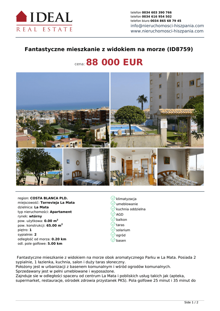 telefon 0034 603 390 766 telefon 0034 616 954 502 telefon biuro 0034 865 68 79 45 [email protected] www.nieruchomosci-hiszpania.com Fantastyczne mieszkanie z widokiem na morze (ID8759) cena: region: COSTA BLANCA PLD. miejscowość: Torrevieja La Mata dzielnica: La Mata typ nieruchomości: Apartament rynek: wtórny pow. użytkowa: 0.00 m2 pow. konstrukcji: 65.00 m2 piętro: 1 sypialnie: 2 odległość od morza: 0.20 km odl. pole golfowe: 5.00 km 88 000 EUR klimatyzacja umeblowanie kuchnia oddzielna AGD balkon taras solarium ogród basen Fantastyczne mieszkanie z widokiem na morze obok aromatycznego Parku w La Mata. Posiada 2 sypialnie, 1 łazienka, kuchnia, salon i duży taras słoneczny. Położony jest w urbanizacji z basenem komunalnym i wśród ogrodów komunalnych. Sprzedawany jest w pełni umeblowane i wyposażone. Zajnduje sie w odległości spaceru od centrum La Mata i pobliskich usług takich jak (apteka, supermarket, restauracje, ośrodek zdrowia przystanek PKS). Pola golfowe 25 minut i 35 minut do Side 1 / 2 lotniska w Alicante. www.nieruchomosci-hiszpania.com Side 2 / 2 Powered by TCPDF (www.tcpdf.org)