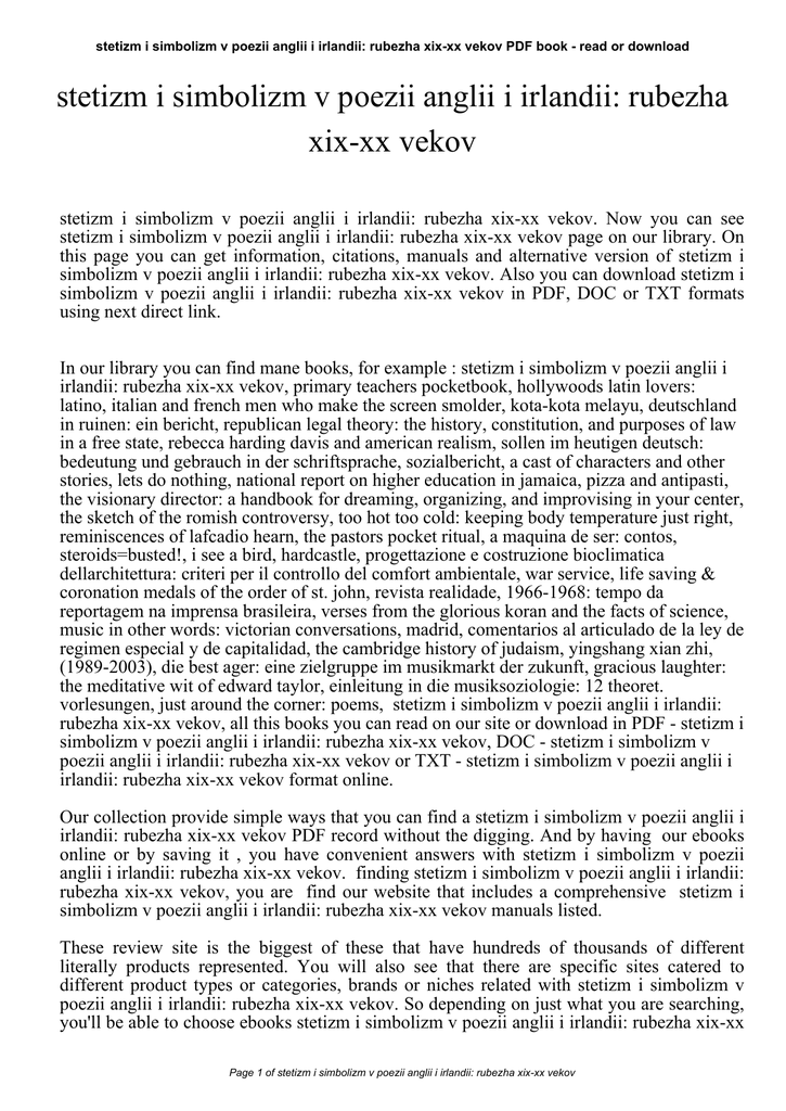 stetizm i simbolizm v poezii anglii i irlandii: rubezha xix-xx vekov PDF book - read or download stetizm i simbolizm v poezii anglii i irlandii: rubezha xix-xx vekov stetizm i simbolizm v poezii anglii i irlandii: rubezha xix-xx vekov. Now you can see stetizm i simbolizm v poezii anglii i irlandii: rubezha xix-xx vekov page on our library. On this page you can get information, citations, manuals and alternative version of stetizm i simbolizm v poezii anglii i irlandii: rubezha xix-xx vekov. Also you can download stetizm i simbolizm v poezii anglii i irlandii: rubezha xix-xx vekov in PDF, DOC or TXT formats using next direct link. In our library you can find mane books, for example : stetizm i simbolizm v poezii anglii i irlandii: rubezha xix-xx vekov, primary teachers pocketbook, hollywoods latin lovers: latino, italian and french men who make the screen smolder, kota-kota melayu, deutschland in ruinen: ein bericht, republican legal theory: the history, constitution, and purposes of law in a free state, rebecca harding davis and american realism, sollen im heutigen deutsch: bedeutung und gebrauch in der schriftsprache, sozialbericht, a cast of characters and other stories, lets do nothing, national report on higher education in jamaica, pizza and antipasti, the visionary director: a handbook for dreaming, organizing, and improvising in your center, the sketch of the romish controversy, too hot too cold: keeping body temperature just right, reminiscences of lafcadio hearn, the pastors pocket ritual, a maquina de ser: contos, steroids=busted!, i see a bird, hardcastle, progettazione e costruzione bioclimatica dellarchitettura: criteri per il controllo del comfort ambientale, war service, life saving & coronation medals of the order of st. john, revista realidade, 1966-1968: tempo da reportagem na imprensa brasileira, verses from the glorious koran and the facts of science, music in other words: victorian conversations, madrid, comentarios al articulado de la ley de regimen especial y de capitalidad, the cambridge history of judaism, yingshang xian zhi, (1989-2003), die best ager: eine zielgruppe im musikmarkt der zukunft, gracious laughter: the meditative wit of edward taylor, einleitung in die musiksoziologie: 12 theoret. vorlesungen, just around the corner: poems, stetizm i simbolizm v poezii anglii i irlandii: rubezha xix-xx vekov, all this books you can read on our site or download in PDF - stetizm i simbolizm v poezii anglii i irlandii: rubezha xix-xx vekov, DOC - stetizm i simbolizm v poezii anglii i irlandii: rubezha xix-xx vekov or TXT - stetizm i simbolizm v poezii anglii i irlandii: rubezha xix-xx vekov format online. Our collection provide simple ways that you can find a stetizm i simbolizm v poezii anglii i irlandii: rubezha xix-xx vekov PDF record without the digging. And by having our ebooks online or by saving it , you have convenient answers with stetizm i simbolizm v poezii anglii i irlandii: rubezha xix-xx vekov. finding stetizm i simbolizm v poezii anglii i irlandii: rubezha xix-xx vekov, you are find our website that includes a comprehensive stetizm i simbolizm v poezii anglii i irlandii: rubezha xix-xx vekov manuals listed. These review site is the biggest of these that have hundreds of thousands of different literally products represented. You will also see that there are specific sites catered to different product types or categories, brands or niches related with stetizm i simbolizm v poezii anglii i irlandii: rubezha xix-xx vekov. So depending on just what you are searching, you'll be able to choose ebooks stetizm i simbolizm v poezii anglii i irlandii: rubezha xix-xx Page 1 of stetizm i simbolizm v poezii anglii i irlandii: rubezha xix-xx vekov stetizm i simbolizm v poezii anglii i irlandii: rubezha xix-xx vekov PDF book - read or download vekov to suit your own needs, stetizm i simbolizm v poezii anglii i irlandii: rubezha xix-xx vekov. Page 2 of stetizm i simbolizm v poezii anglii i irlandii: rubezha xix-xx vekov