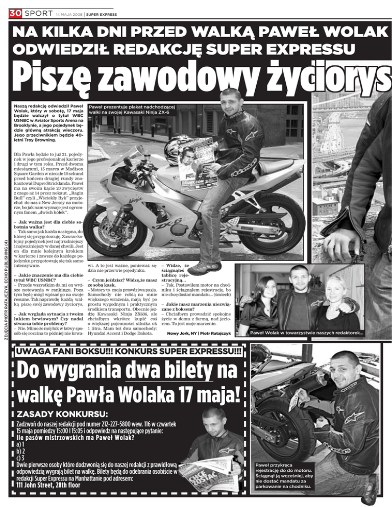 30 SPORT 14 MAJA 2008 SUPER EXPRESS NA KILKA DNI PRZED WALKĄ PAWEŁ WOLAK ODWIEDZIŁ REDAKCJĘ SUPER EXPRESSU Piszę zawodowy życiorys Naszą redakcję odwiedził Paweł Wolak, który w sobotę, 17 maja będzie walczył o tytuł WBC USNBC w Aviator Sports Arena na Brooklynie, a jego pojedynek będzie główną atrakcją wieczoru. Jego przeciwnikiem będzie 40letni Troy Browning. Paweł prezentuje plakat nadchodzącej walki na swojej Kawasaki Ninja ZX-6 ZDJĘCIA PIOTR RATAJCZYK, ECHO PUBLISHING (4) Dla Pawła będzie to już 21. pojedynek w jego profesjonalnej karierze i drugi w tym roku. Przed dwoma miesiącami, 15 marca w Madison Square Garden w niecałe 10 sekund przed końcem drugiej rundy znokautował Dupre Stricklanda. Paweł ma na swoim kącie 20 zwycięstw z czego aż 14 przez nokaut. „Ragin Bull” czyli „Wściekły Byk” przyjechał do nas z New Jersey na motorze, bo jak nam wyznaje jest ogromnym fanem „dwóch kółek”. – Jak ważna jest dla ciebie sobotnia walka? – Tak samo jak każda następna, do której się przygotowuję. Zawsze kolejny pojedynek jest najtrudniejszy i najważniejszy w danej chwili. Jest on dla mnie kolejnym krokiem w karierze i zawsze do każdego pojedynku przygotowuję się tak samo intensywnie. – Jakie znaczenie ma dla ciebie tytuł WBC USNBC? – Przede wszystkim da mi on wyższe notowania w rankingu. Poza tym będę mógł wpisać go na swoje resume. Tak naprawdę każdą walką piszę swój zawodowy życiorys. – Jak wygląda sytuacja z twoim łukiem brwiowym? Czy nadal stwarza tobie problemy? – Nie. Mimo że mój łuk w łatwy sposób się rozcina to później nie krwa- wi. A to jest ważne, ponieważ sędzia nie przerwie pojedynku. – Czym jeździsz? Widzę,że masz ze sobą kask. – Motory to moja prawdziwa pasja. Samochody nie robią na mnie większego wrażenia, mają być po prostu wygodnym i praktycznym środkiem transportu. Obecnie jeżdżę Kawasaki Ninja ZX636, ale chciałbym wkrótce kupić coś o większej pojemności silnika ok 1 litra. Mam też dwa samochody: Hyundai Accent i Dodge Dakota. – Widze, że ściągnąłeś tablicę rejestracyjną... – Tak. Postawiłem motor na chodniku i ściągnąłem rejestrację, bo nie chcę dostać mandatu... (śmiech) – Jakie masz marzenia niezwiązane z boksem? – Chciałbym prowadzić spokojne życie w domu z farmą, nad jeziorem. To jest moje marzenie. Nowy Jork, NY | Piotr Ratajczyk Paweł Wolak w towarzystwie naszych redaktorek... UWAGA FANI BOKSU!!! KONKURS SUPER EXPRESSU!!! Do wygrania dwa bilety na walkę Pawła Wolaka 17 maja! ZASADY KONKURSU: Zadzwoń do naszej redakcji pod numer 212-227-5800 wew. 116 w czwartek 15 maja pomiedzy 15:00 I 15:05 i odpowiedz na następujące pytanie: Ile pasów mistrzowskich ma Paweł Wolak? a) 1 b) 2 c) 3 Dwie pierwsze osoby które dodzwonią się do naszej redakcji z prawidłową odpowiedzią wygrają bilet na walkę. Bilety będą do odebrania osobiście w redakcji Super Expressu na Manhattanie pod adresem: 111 John Street, 28th floor Paweł przykręca rejestrację do do motoru. Ściągnął ją wcześniej, aby nie dostać mandatu za parkowanie na chodniku. SUPER EXPRESS 14 MAJA 2008 SPORT 31 s ... i na „Super Expressowym“ tarasie Reklama TEKST SPONSOROWANY – SAMUEL J. LURIE WYPADKI I ODSZKODOWANIA: CO WARTO WIEDZIEå To si´ mo˝e zdarzyç wsz´dzie! Jak wspomnia∏em ostatnio, niezmiernie wa˝ne dla przyjÊcia na Êwiat zdrowego dziecka jest Êcis∏e monitorowanie przebiegu porodu. Mimo to od czasu do czasu w ka˝dym szpitalu wymóg ten nie jest odpowiednio przestrzegany i rodzi si´ dziecko z uszkodzeniem mózgu. Mo˝e si´ Paƒstwu wydawaç, ˝e przypadki uchybieƒ w tym zakresie cz´Êciej wyst´pujà w szpitalach miejskich, ale musz´ podkreÊliç, ˝e zdarzajà si´ one nawet w najlepszych szpitalach prywatnych. Ka˝de dziecko, które si´ urodzi∏o z uszkodzeniem mózgu, i jego rodzice zas∏ugujà na to, by przeprowadziç w ich sprawie pe∏ne dochodzenie i ustaliç, czy stan dziecka nie jest skutkiem odejÊcia od zasad prawid∏owej opieki medycznej, czyli innymi s∏owy -- wynikiem b∏´du lekarskiego. Rodzice nigdy nie powinni te˝ poprzestaç na wyt∏umaczeniu przyczyn stanu dziecka podanym im przez lekarzy, piel´gniarki czy innych przedstawicieli danego szpitala. Ci bowiem, wyra˝ajàc g∏´bokie wspó∏czucie, stwierdzà, ˝e zrobili wszystko, co mo˝na by∏o zrobiç i ˝e pewne z∏e wyniki sà po prostu nieuniknione. Motywy, jakimi si´ oni kierujà, oddalajàc od siebie odpowiedzialnoÊç, sà oczywiste. Prawdà jest te˝, ˝e w niektórych przypadkach nawet najlepsza opieka medyczna nie jest w stanie uchroniç dziecka przed uszkodzeniem mózgu. Jednak˝e osoba bez odpowiedniego przygotowania, nawet jeÊli jest nià lekarz po∏o˝nik, nie b´dzie w stanie dok∏adnie tego okreÊliç bez wnikliwej analizy ca∏ej nie- zb´dnej dokumentacji medycznej. A nawet korzystanie z pe∏nej dokumentacji nie wystarczy bez wk∏adu ze strony doÊwiadczonego adwokata, który wszystko to umie odnieÊç do kontekstu odpowiedzialnoÊci prawnej szpitala czy lekarza. Bioràc pod uwag´ wspomniane wczeÊniej problemy z pozyskaniem od lekarzy i ze szpitali ich pe∏nych kartotek, pami´tajmy, ˝e im d∏u˝ej rodzice zwlekajà z wynaj´ciem doÊwiadczonego adwokata, tym wi´cej powstaje okazji do tego, by pewne cz´Êci kartoteki zosta∏y zmienione lub „zagin´∏y”. A przecie˝ skutecznie poprowadzona sprawa sàdowa mo˝e zapewniç dziecku optymalne warunki ˝ycia i najlepsza opiek´ medycznà, pozwalajàcà na rozwini´cie jego potencja∏u. Rodzicom zaÊ mo˝e umo˝liwiç zakup domu dostosowanego do potrzeb dziecka i daç im Êrodki na op∏acenie nawet ca∏odobowej opieki nad dzieckiem, jeÊli taka zaistnieje potrzeba. Poprowadzenie tego typu sprawy wymaga od adwokata zaanga˝owania ca∏ego jego doÊwiadczenia, wszystkich jego umiej´tnoÊci i niestrudzonej konsekwencji. Musi on te˝ zapewniç wspó∏prac´ ze