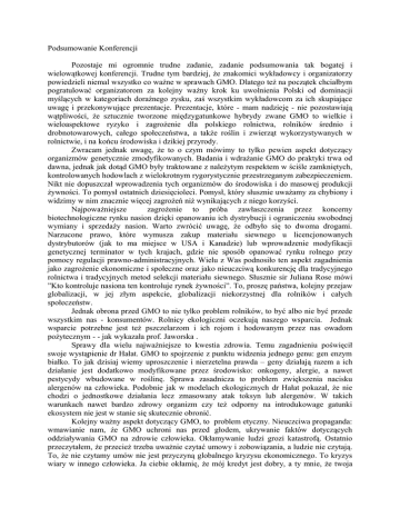 Podsumowanie Konferencji Pozostaje mi ogromnie trudne zadanie, zadanie podsumowania tak bogatej i wielowątkowej konferencji. Trudne tym bardziej, że znakomici wykładowcy i organizatorzy powiedzieli niemal wszystko co ważne w sprawach GMO. Dlatego też na początek chciałbym pogratulować organizatorom za kolejny ważny krok ku uwolnienia Polski od dominacji myślących w kategoriach doraźnego zysku, zaś wszystkim wykładowcom za ich skupiające uwagę i przekonywujące prezentacje. Prezentacje, które - mam nadzieję - nie pozostawiają wątpliwości, że sztucznie tworzone międzygatunkowe hybrydy zwane GMO to wielkie i wieloaspektowe ryzyko i zagrożenie dla polskiego rolnictwa, rolników średnio i drobnotowarowych, całego społeczeństwa, a także roślin i zwierząt wykorzystywanych w rolnictwie, i na końcu środowiska i dzikiej przyrody. Zwracam jednak uwagę, że to o czym mówimy to tylko pewien aspekt dotyczący organizmów genetycznie zmodyfikowanych. Badania i wdrażanie GMO do praktyki trwa od dawna, jednak jak dotąd GMO były traktowane z należytym respektem w ściśle zamkniętych, kontrolowanych hodowlach z wielokrotnym rygorystycznie przestrzeganym zabezpieczeniem. Nikt nie dopuszczał wprowadzenia tych organizmów do środowiska i do masowej produkcji żywności. To pomysł ostatnich dziesięcioleci. Pomysł, który słusznie uważamy za chybiony i widzimy w nim znacznie więcej zagrożeń niż wynikających z niego korzyści. Najpoważniejsze zagrożenie to próba zawłaszczenia przez koncerny biotechnologiczne rynku nasion dzięki opanowaniu ich dystrybucji i ograniczeniu swobodnej wymiany i sprzedaży nasion. Warto zwrócić uwagę, że odbyło się to dwoma drogami. Narzucone prawo, które wymusza zakup materiału siewnego u licencjonowanych dystrybutorów (jak to ma miejsce w USA i Kanadzie) lub wprowadzenie modyfikacji genetycznej terminator w tych krajach, gdzie nie sposób opanować rynku rolnego przy pomocy regulacji prawno-administracyjnych. Wielu z Was podnosiło ten aspekt zagadnienia jako zagrożenie ekonomiczne i społeczne oraz jako nieuczciwą konkurencję dla tradycyjnego rolnictwa i tradycyjnych metod selekcji materiału siewnego. Słusznie sir Juliana Rose mówi ”Kto kontroluje nasiona ten kontroluje rynek żywności”. To, proszę państwa, kolejny przejaw globalizacji, w jej złym aspekcie, globalizacji niekorzystnej dla rolników i całych społeczeństw. Jednak obrona przed GMO to nie tylko problem rolników, to być albo nie być przede wszystkim nas - konsumentów. Rolnicy ekologiczni oczekują naszego wsparcia. Jednak wsparcie potrzebne jest też pszczelarzom i ich rojom i hodowanym przez nas owadom pożytecznym - - jak wykazała prof. Jaworska . Sprawy dla wielu najważniejsze to kwestia zdrowia. Temu zagadnieniu poświęcił swoje wystąpienie dr Hałat. GMO to spojrzenie z punktu widzenia jednego genu: gen enzym białko. To jak dzisiaj wiemy uproszczenie i nierzetelna prawda – geny działają razem a ich działanie jest dodatkowo modyfikowane przez środowisko: onkogeny, alergie, a nawet pestycydy wbudowane w roślinę. Sprawa zasadnicza to problem zwiększenia nacisku alergenów na człowieka. Podobnie jak w modelach ekologicznych dr Hałat pokazał, że nie chodzi o jednostkowe działania lecz zmasowany atak toksyn lub alergenów. W takich warunkach nawet bardzo zdrowy organizm czy też odporny na introdukowage gatunki ekosystem nie jest w stanie się skutecznie obronić. Kolejny ważny aspekt dotyczący GMO, to problem etyczny. Nieuczciwa propaganda: wmawianie nam, że GMO uchroni nas przed głodem, ukrywanie faktów dotyczących oddziaływania GMO na zdrowie człowieka. Okłamywanie ludzi grozi katastrofą. Ostatnio przeczytałem, że przecież trzeba uważnie czytać umowy i zobowiązania, a ludzie nie czytają. To, że nie czytamy umów nie jest przyczyną globalnego kryzysu ekonomicznego. To kryzys wiary w innego człowieka. Ja ciebie okłamię, że mój kredyt jest dobry, a ty mnie, że twoja żywność nikomu nie szkodzi. Chciwość i nieprzeparta chęć zysku łamie nie tylko nasz kręgosłup moralny ale i przysłania zdrowy rozsądek. Brak zaufania kruszy podstawy każdej cywilizacji, też naszej. O tym ciekawie mówił ojciec Jaromi, który odwołał się do xchematu wartości opierającego się o tradycję platońską: Bóg – człowiek - przyroda. W tym miejscu warto przywołać prof. Henryka Skolimowskiego, znakomitego filozofa środowiska, który wskazuje na niebezpieczeństwa redukcjonistycznego sposobu pojmowania świata przez współczesną naukę. W dużym skrócie jego tok rozumowania można przedstawić następująco: wiem więcej - lepiej rozumiem - lepiej zarządzam - przejmuję kontrolę - podporządkowuję sobie świat i innych. To Kartezjański punkt widzenia: duże Ja i mały świat. Jednak to nie cała nauka. My tutaj reprezentujemy przeciwstawny redukcjonizmowi kierunek holistyczny: wiem więcej - lepiej rozumiem – lepiej współpracuję - staram się dostosować i skuteczniej podtrzymywać życie w każdym jego wymiarze. To spojrzenie pokorne: małe ja i duży świat. Trzeci aspekt zagadnienia poruszany na konferencji dotyczył wpływu GMO na środowisko. Tutaj zwracam uwagę na konsekwencje przyrodnicze – mieszanie gatunków, powstanie nowych skrajnie odpornych chwastów oraz owadów odpornych na Bacillus thuringensis (bakterię, której gen wszczepiono do roślin odpornych na owady). Prof. Szyszko, były minister środowiska wykazał, że uwolnione do środowiska uprawy GMO są poważnym zagrożeniem dla wielu gatunków i siedlisk znajdujących się na liście Natura 2000. To zagrożenie wymaga wprowadzania ocen oddziaływania na środowisko w kwestii zagrożeń obszarów Natura 2000 zgodnie z restryktywnie przestrzeganym przez Komisję Europejską prawem Unijnym . Ostatni aspekt zagadnień związanych z GMO to problem co robić i jak się bronić. Otóż - moim zdaniem - należy robić ws