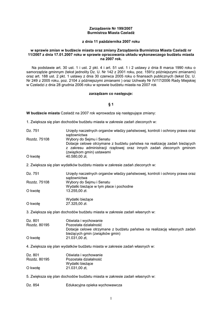 Zarządzenie Nr 199/2007 Burmistrza Miasta Czeladź z dnia 11 października 2007 roku w sprawie zmian w budŜecie miasta oraz zmiany Zarządzenia Burmistrza Miasta Czeladź nr 11/2007 z dnia 17.01.2007 roku w sprawie opracowania układu wykonawczego budŜetu miasta na 2007 rok. Na podstawie art. 30 ust. 1 i ust. 2 pkt. 4 i art. 51 ust. 1 i 2 ustawy z dnia 8 marca 1990 roku o samorządzie gminnym (tekst jednolity Dz. U. Nr 142 z 2001 roku, poz. 1591z późniejszymi zmianami) oraz art. 188 ust. 2 pkt. 1 ustawy z dnia 30 czerwca 2005 roku o finansach publicznych (tekst Dz. U. Nr 249 z 2005 roku, poz. 2104 z późniejszymi zmianami ) oraz Uchwały Nr IV/17/2006 Rady Miejskiej w Czeladzi z dnia 28 grudnia 2006 roku w sprawie budŜetu miasta na 2007 rok zarządzam co następuje: §1 W budŜecie miasta Czeladź na 2007 rok wprowadza się następujące zmiany: 1. Zwiększa się plan dochodów budŜetu miasta w zakresie zadań zleconych w: Dz. 751 Rozdz. 75108 O kwotę Urzędy naczelnych organów władzy państwowej, kontroli i ochrony prawa oraz sądownictwa Wybory do Sejmu i Senatu Dotacje celowe otrzymane z budŜetu państwa na realizację zadań bieŜących z zakresu administracji rządowej oraz innych zadań zleconych gminom (związkom gmin) ustawami 40.580,00 zł, 2. Zwiększa się plan wydatków budŜetu miasta w zakresie zadań zleconych w: Dz. 751 O kwotę Urzędy naczelnych organów władzy państwowej, kontroli i ochrony prawa oraz sądownictwa Wybory do Sejmu i Senatu Wydatki bieŜące w tym płace i pochodne 13.255,00 zł. O kwotę Wydatki bieŜące 27.325,00 zł. Rozdz. 75108 3. Zwiększa się plan dochodów budŜetu miasta w zakresie zadań własnych w: Dz. 801 Rozdz. 80195 O kwotę Oświata i wychowanie Pozostała działalność Dotacje celowe otrzymane z budŜetu państwa na realizację własnych zadań bieŜących gmin (związków gmin) 21.031,00 zł, 4. Zwiększa się plan wydatków budŜetu miasta w zakresie zadań własnych w: Dz. 801 Rozdz. 80195 O kwotę Oświata i wychowanie Pozostała działalność Wydatki bieŜące 21.031,00 zł, 5. Zwiększa się plan dochodów budŜetu miasta w zakresie zadań własnych w: Dz. 854 Edukacyjna opieka wychowawcza 1 Rozdz. 85415 O kwotę Pomoc materialna dla uczniów Dotacje celowe otrzymane z budŜetu państwa na realizację własnych zadań bieŜących gmin (związków gmin) 4.077,00 zł, 6. Zwiększa się plan wydatków budŜetu miasta w zakresie zadań własnych w: Dz. 854 Rozdz. 85415 O kwotę Edukacyjna opieka wychowawcza Pomoc materialna dla uczniów Wydatki bieŜące 4.077,00 zł, §2 W układzie wykonawczym budŜetu miasta Czeladź na 2007 rok dokonuje się zmian wynikających z zapisu § 1 niniejszego zarządzenia. 1. Zwiększa się plan dochodów budŜetu miasta w zakresie zadań zleconych w: Dz. 751 Rozdz. 75108 § 2010 O kwotę Urzędy naczelnych organów władzy państwowej, kontroli i ochrony prawa oraz sądownictwa Wybory do Sejmu i Senatu Dotacje celowe otrzymane z budŜetu państwa na realizację zadań bieŜących z zakresu administracji rządowej oraz innych zadań zleconych gminom (związkom gmin) ustawami 40.580,00 zł, 2. Zwiększa się plan wydatków budŜetu miasta w zakresie zadań zleconych w: Dz. 751 Rozdz. 75108 Urzędy naczelnych organów władzy państwowej, kontroli i ochrony prawa oraz sądownictwa Wybory do Sejmu i Senatu § 3030 O kwotę RóŜne wydatki na rzecz osób fizycznych 26.190,00 zł, § 4110 O kwotę Składki na ubezpieczenia społeczne 1.620,00 zł, § 4120 O kwotę Składki na Fundusz Pracy 221,00 zł, § 4170 O kwotę Wynagrodzenia bezosobowe 11.414,00 zł, § 4210 O kwotę Zakup materiałów i wyposaŜenia 650,00 zł, § 4410 O kwotę PodróŜe słuŜbowe krajowe 500,00 zł. 3. Zmniejsza się plan wydatków budŜetu miasta w zakresie zadań zleconych w: Dz. 751 Rozdz. 75108 § 4300 O kwotę Urzędy naczelnych organów władzy państwowej, kontroli i ochrony prawa oraz sądownictwa Wybory do Sejmu i Senatu Zakup usług pozostałych 15,00 zł. 2 PowyŜszej zmiany dokonuje się w związku z decyzją Krajowego Biura Wyborczego nr DKT-58021/8/2007 z dnia 3 października 2007 roku zwiększającą dotację celową z przeznaczeniem na przygotowanie i przeprowadzenie wyborów do Sejmu i Senatu zarządzonych na dzień 21 października 2007 roku. 4. Zwiększa się plan dochodów budŜetu miasta w zakresie zadań własnych w: Dz. 801 Rozdz. 80195 § 2030 O kwotę Oświata i wychowanie Pozostała działalność Dotacje celowe otrzymane z budŜetu państwa na realizację własnych zadań bieŜących gmin (związków gmin) 21.031,00 zł, 5. Zwiększa się plan wydatków budŜetu miasta w zakresie zadań własnych w: Dz. 801 Rozdz. 80195 § 4300 O kwotę Oświata i wychowanie Pozostała działalność Zakup usług pozostałych 21.031,00 zł, PowyŜszej zmiany dokonuje się w związku z decyzją Wojewody Śląskiego nr FB.I. 3011-226/5/2007 z dnia 20 września 2007 roku zwiększającą dotację celową z przeznaczeniem na dofinansowanie pracodawcom kosztów przygotowania zawodowego młodocianych pracowników. 6. Zwiększa się plan dochodów budŜetu miasta w zakresie zadań własnych w: Dz. 854 Rozdz. 85415 § 2030 O kwotę Edukacyjna opieka wychowawcza Pomoc materialna dla uczniów Dotacje celowe otrzymane z budŜetu państwa na realizację własnych zadań bieŜących gmin (związków gmin) 4.077,00 zł, 7. Zwiększa się plan wydatków budŜetu miasta w zakresie zadań własnych w: Dz. 854 Rozdz. 85415 § 3260 O kwotę Edukacyjna opieka wychowawcza Pomoc materialna dla uczniów Inne formy pomocy dla uczniów 4.077,00 zł, Szkoła Podstawowa nr 1 – 850,00 zł w tym: Podręczniki – 500,00 zł, Mundurki szkolne – 350,00 zł. Szkoła Podstawowa nr 2 – 992,00 zł w tym: Podręczniki – 642,00 zł, Mundurki szkolne – 350,00 zł. Szkoła Podstawowa nr 3 – 515,00 zł w tym: Podręczniki – 370,00 zł, Mundurki szkolne – 145,00 zł. Szkoła Podstawowa nr 7 – 850,00 zł w tym: Podręczniki – 5
