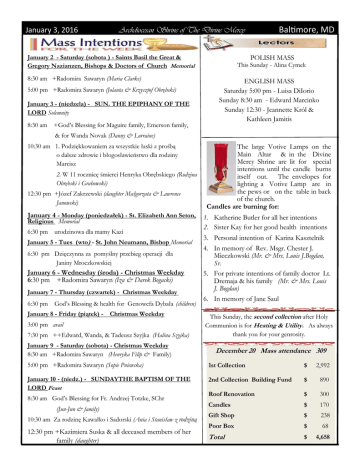 January 3, 2016 Archdiocesan Shrine of The Divine Mercy January 2 - Saturday (sobota ) - Saints Basil the Great & Gregory Nazianzen, Bishops & Doctors of Church Memorial 8:30 am +Radomira Sawaryn (Maria Clarke) 5:00 pm +Radomira Sawaryn (Jolanta & Krzysztof Obrębski) January 3 - (niedzela) - SUN. THE EPIPHANY OF THE LORD Solemnity 8:30 am +God’s Blessing for Maguire family, Emerson family, Baltimore, MD POLISH MASS This Sunday - Alina Cymek ENGLISH MASS Saturday 5:00 pm - Luisa DiIorio Sunday 8:30 am - Edward Marcinko Sunday 12:30 - Jeannette Król & Kathleen Jamitis & for Wanda Novak (Danny & Lorraine) 10:30 am 1. Podziękkowaniem za wszystkie łaski z prośbą o dalsze zdrowie i błogosławieństwo dla rodziny Marcisz 2. W 11 rocznicę śmierci Henryka Obrębskiego (Rodzina Obrębski i Grabowski) 12:30 pm +Józef Zakrzewski (daughter Małgorzata & Lawrence Janowski) January 4 - Monday (poniedzałek) - St. Elizabeth Ann Seton, Religious Memorial J 6:30 pm urodzinowa dla mamy Kazi January 5 - Tues (wto) - St. John Neumann, Bishop Memorial 6:30 pm Dzięczynna za pomyślny przebieg operacji dla Janiny Mroczkowskiej January 6 - Wednesday (środa) - Christmas Weekday 6:30 pm +Radomira Sawaryn (Iza & Darek Bogacki) January 7 - Thursday (czwartek) - Christmas Weekday 6:30 pm God’s Blessing & health for Genowefa Dybała (children) January 8 - Friday (piątek) - Christmas Weekday 3:00 pm avail 7:30 pm ++Edward, Wanda, & Tadeusz Szyjka (Halina Szyjka) January 9 - Saturday (sobota) - Christmas Weekday 8:30 am +Radomira Sawaryn (Henryka Filip & Family) The large Votive Lamps on the Main Altar & in the Divine Mercy Shrine are lit for special intentions until the candle burns itself out. The envelopes for lighting a Votive Lamp are in the pews or on the table in back of the church. Candles are burning for: 1. Katherine Butler for all her intentions 2. Sister Kay for her good health intentions 3. Personal intention of Karina Kasztelnik 4. In memory of Rev. Msgr. Chester J. Mieczkowski (Mr. & Mrs. Louis J.Bogdan, Sr. 5. For private intentions of family doctor Lt. Dremaja & his family (Mr. & Mrs. Louis J. Bogdan) 6. In memory of Jane Saul This Sunday, the second collection after Holy Communion is for Heating & Utility. As always thank you for your genrosity. December 20 Mass attendance 309 5:00 pm +Radomira Sawaryn (Sopie Pniewska) 1st Collection $ 2,992 January 10 - (niedz.) - SUNDAYTHE BAPTISM OF THE LORD Feast 2nd Collection Building Fund $ 890 Roof Renovation $ 300 Candles $ 170 Gift Shop $ 238 Poor Box $ 68 Total $ 4,658 8:30 am God’s Blessing for Fr. Andrzej Totzke, SChr (Jun-Jun & family) 10:30 am Za rodzinę Kawałko i Sadorski (Ania i Stanisław z rodziną 12:30 pm +Kazimiera Suska & all deceased members of her family (daughter) January 3, 2016 Archdiocesan Shrine of The Divine Mercy FEAST OF THE EPIPHANY OF THE LORD This feast touches me deeply. This is the feast of the epiphany - the showing or manifestation - of Jesus to the rest of the world. The promises of God to the people of the first covenant always included the promise that their special and gifted relationship with God would extend to the ends of the earth. No one could have imagined how that would happen. We all love the Nativity story through the eyes of Luke. This story, through the eyes of Matthew, introduces us to Magi - astrologer types, who are really seers, or "wise men" in the sense that they are seeking wisdom with open minds and hearts. They are clearly non-Jews. They follow what catches their attention and learn from it. And, we are introduced to the first Herod - the bad leader, who is the father of the Herod we will meet in the Passion story. The Magi pay attention to the stars and when they see something special, they sense there is meaning in that event. Too often we aren't that open to see a new light, a new message, a clear call, to pay attention. The Magi follow the light. Their following leads them to an encounter with Herod. Their consulting with him leads them to Bethlehem, where the light has settled. We sometimes fail to consult the tradition and learn where to go to find the light. Unfortunately, the Herod they meet is also very duplicitous. He's two-faced, with a divided, selfish, jealous heart. He isn't interested in finding the new light. He wants to surpress it - to destroy it. At times, we are guilty of duplicity ourselves - or at least our hearts can be divided. We want to follow, but we are something threatened or fearful of losing something we want to hold on to. At our worst, we can even surpress or destroy the light. Baltimore, MD The Magi find the Holy Family. They come prepared to do this newborn homage. They bring gifts for a king, for a God, for someone who will suffer. They thought about this. Too often, we don't come to this invitation to see the light with any gifts which represent our faith. And, so we don't proclaim with our lives that we believe Jesus is our Lord and God, that he is the one who, in this gospel story, will die for our sins. We can only imagine what Mary and Joseph experienced in this revelation to those far away Magi and to the gifts they bring to honor this child of theirs. The wise Magi have it revealed to them not to go back to Herod to report that they found the newborn king. Even without help, they must have sensed Herod's insincerity - and the danger that was hidden behind his pseudo piety. They went back home by a different route - so often the result of a transformative experience. Our encounter with Jesus these days - with the light he shines into our darkness - can lead us to continue on our life journey by a different and new path. When we seek, find and honor Jesus' gift to us, our gratitude fills us with joy. And, that joy, and our way home, is different. It is new. It is renewed with a deep trust that God is with us. God can redeem, bring mercy and healing, reconciliation and redemption, to every evil light to every darkness. This year's epiphany of his