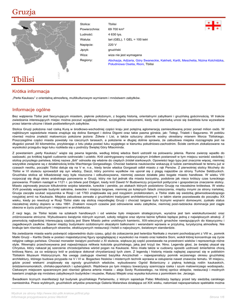 Gruzja Stolica: Tbilisi Powierzchnia: 69 700 km² Ludność: 4 630 tys. Waluta: lari (GEL), 1 GEL = 100 tetri Napięcie: 220 V Język: gruziński Wiza: wiza nie jest wymagana Regiony: Abchazja, Adżaria, Góry Swaneckie, Kakheti, Kartli, Meschetia, Nizina Kolchidzka, Południowa Osetia, Rioni, Tbilisi Tbilisi Krótka informacja „Perła Kaukazu” z orientalną atmosferą, multikulturowym wymiarem i mnóstwem zabytków. Informacje ogólne Bez wątpienia Tbilisi jest fascynującym miastem, pięknie położonym, z bogatą historią, orientalnymi zabytkami i gruzińską gościnnością. W trakcie zwiedzania interesujących miejsc można poczuć wyjątkowy klimat, szczególnie wieczorami, kiedy nad starówką unosi się świetlista łuna wyzwalana przez latarnie uliczne i blask podświetlonych zabytków. Stolica Gruzji położona nad rzeką Kurą w środkowo-wschodniej części kraju jest potężną aglomeracją zamieszkiwaną przez ponad milion osób. W najbliższym sąsiedztwie miasta znajduje się dolina Samgori i dolina Digomi oraz takie pasma górskie, jak: Telegi, Trialeti i Saguramo. W pobliżu również można znaleźć malowniczo położone jeziora: Żółwie i Lisi, a także sztuczny zbiornik wodny określany mianem Morza Tbiliskiego. Poszczególne części miasta powstały na rzecznych tarasach, a położenie w długiej dolinie sprawia, że zabudowa miejska rozciągnięta jest na długości ponad 30 kilometrów, przybierając z lotu ptaka postać łuku wygiętego w kierunku południowo-zachodnim. Ścisłe centrum zlokalizowane na wysokości przegubu tego łuku rozkłada się u podnóży Świętej Góry Mtacminda. Z powstaniem „perły Kaukazu” wiąże się pewna legenda, według której władca Iberii ustrzelił na polowaniu jelenia. Ranne zwierzę wpadło do sadzawki, po krótkiej kąpieli cudownie ozdrowiało i uciekło. Król zaintrygowany nadzwyczajnym źródłem postanowił w tym miejscu wznieść siedzibę i stolicę przyszłego państwa, której nazwa „tbili” odnosiła się właśnie do ciepłych źródeł siarkowych. Opowieści tego typu jest znacznie więcej, niemniej wszystkie związane są z działalnością króla Wachtanga Gorgasaliego. Chociaż badania naukowców wskazują iż ludzie zamieszkiwali te terenu już w czasach neolitu, początki Tbilisi datuje się na V w. n.e., kiedy tenże władca Gorgasali odbił miasto z rąk Persów. Z pierwotniej stolicy Mcchety do Tbilisi w VI stuleciu sprowadził się syn władcy, Daczi, który pomimo wysiłków nie uporał się z plagą najazdów ze strony Turków Seldżuckich. Gruzińska stolica aż kilkadziesiąt razy była niszczona i odbudowywana, niemniej zawsze działała jako bogate miasto handlowe. W wieku VIII rozpoczął się długi okres arabskiego panowania w Gruzji, który nie był jednak dla miasta korzystny, podobnie jak nieco krótszy czas tureckiego panowania. Przełom nastąpił w 1121 r. po bitwie pod Didgori, kiedy król Dawid IV Budowniczy przywrócił polityczne i gospodarcze znaczenie stolicy. Miasto zajmowały jeszcze kilkukrotnie wojska tatarskie, tureckie i perskie, po atakach których podzielono Gruzję na niezależne królestwa. W wieku XVII powstały wspaniałe budynki sakralne, świeckie i miejsca targowe, niemniej po kolejnych falach zniszczenia, między innymi ze strony irańskiej, Gruzja zaczęła szukać sojusznika w Rosji i od 1783 znajdowała się pod rosyjskim protektoratem, a Tbilisi stało się siedzibą głównodowodzącego rosyjskiej armii na Kaukazie. Miejska zabudowa zerwała z gruzińskimi tradycjami architektonicznymi i w takim stanie pozostawała do początku XX wieku, kiedy po rewolucji w Rosji Tbilisi stało się stolicą niepodległej Gruzji i chociaż targane było licznymi wojnami domowymi, zyskało status niezależnej stolicy dopiero w roku 1991. Znakiem nowych czasów jest odnowienie wielu zabytków, niemniej post-radziecka dominacja jest ciągle obecna w życiu publicznym i miejscami w architekturze. Z racji tego, że Tbilisi leżało na szlakach handlowych i od wieków było miejscem strategicznym, wyraźna jest tam wielokulturowość oraz zróżnicowanie etniczne. Wybudowano świątynie różnych wyznań, szkoły religijne oraz słynne łaźnie tyfliskie będące jedną z największych atrakcji. Z pewnością najbardziej interesującą częścią jest Stare Miasto pełne urokliwych kamienic, XIX-wiecznych gmachów nawiązujących do klasycyzmu i zagadkowych zaułków. Spacer między budynkami ozdobionymi okazałymi balkonami i werandami wprawia w przytulną, turystyczną atmosferę. Nie brakuje tam również zadbanych skwerów, ekskluzywnych restauracji i hoteli o najwyższym, światowym standardzie. Na zwiedzanie miasta warto poświęcić odpowiednio dużo czasu, gdyż do zobaczenia jest twierdza Narikała z murami pochodzącymi z VIII w., pomnik Matki Gruzji – Kartlis Deda w postaci majestatycznej figury spoglądającej z wysokości na miasto oraz katedra Sioni, wokół której koncentruje się życie religijne całego państwa. Chociaż monaster świątyni pochodzi z XI stulecia, większa jej część powstawała na przestrzeni wieków i reprezentuje różne style. Wewnątrz przechowywana jest najważniejsza relikwia kościoła gruzińskiego, jaką jest krzyż św. Nino. Legenda głosi, że świętej ukazał się Chrystus, który nakazał jej szerzenie chrześcijaństwa wśród pogan na Kaukazie. Nino miała także w cudowny sposób uzdrowić śmiertelnie chorą królową Nano, za co wdzięczy król w podzięce dokonał chrystianizacji tych ziem. Z legendą i historią miasta najlepiej zapoznać się w pobliskim Tbiliskim Muzeum Historycznym. Na uwagę zasługuje również bazylika Anczischati – najwspanialszy pomnik wczesnego okresu gruzińskiej architektury, którego budowa przypada na V i VI w. Bogactwo fresków i misternych technik wprawia w osłupienie nawet znawców tematu. W miejscu, gdzie przed wiekami znajdowały się ogrody gruzińskich władców, wy