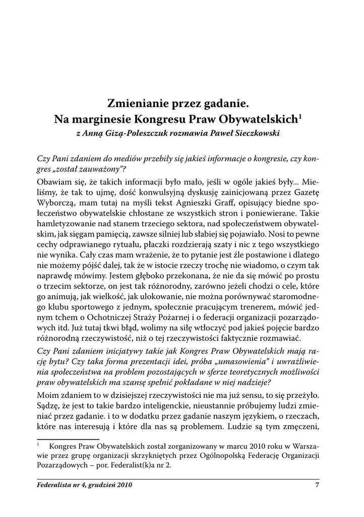 Zmienianie przez gadanie. Na marginesie Kongresu Praw Obywatelskich1 z Anną Gizą-Poleszczuk rozmawia Paweł Sieczkowski Czy Pani zdaniem do mediów przebiły się jakieś informacje o kongresie, czy kongres „został zauważony”? Obawiam się, że takich informacji było mało, jeśli w ogóle jakieś były... Mieliśmy, że tak to ujmę, dość konwulsyjną dyskusję zainicjowaną przez Gazetę Wyborczą, mam tutaj na myśli tekst Agnieszki Graff, opisujący biedne społeczeństwo obywatelskie chłostane ze wszystkich stron i poniewierane. Takie hamletyzowanie nad stanem trzeciego sektora, nad społeczeństwem obywatelskim, jak sięgam pamięcią, zawsze silniej lub słabiej się pojawiało. Nosi to pewne cechy odprawianego rytuału, płaczki rozdzierają szaty i nic z tego wszystkiego nie wynika. Cały czas mam wrażenie, że to pytanie jest źle postawione i dlatego nie możemy pójść dalej, tak że w istocie rzeczy trochę nie wiadomo, o czym tak naprawdę mówimy. Jestem głęboko przekonana, że nie da się mówić po prostu o trzecim sektorze, on jest tak różnorodny, zarówno jeżeli chodzi o cele, które go animują, jak wielkość, jak ulokowanie, nie można porównywać staromodnego klubu sportowego z jednym, społecznie pracującym trenerem, mówić jednym tchem o Ochotniczej Straży Pożarnej i o federacji organizacji pozarządowych itd. Już tutaj tkwi błąd, wolimy na siłę wtłoczyć pod jakieś pojęcie bardzo różnorodną rzeczywistość, niż o tej rzeczywistości faktycznie rozmawiać. Czy Pani zdaniem inicjatywy takie jak Kongres Praw Obywatelskich mają rację bytu? Czy taka forma prezentacji idei, próba „umasowienia” i uwrażliwienia społeczeństwa na problem pozostających w sferze teoretycznych możliwości praw obywatelskich ma szansę spełnić pokładane w niej nadzieje? Moim zdaniem to w dzisiejszej rzeczywistości nie ma już sensu, to się przeżyło. Sądzę, że jest to takie bardzo inteligenckie, nieustannie próbujemy ludzi zmieniać przez gadanie. i to w dodatku przez gadanie naszym językiem, o rzeczach, które nas interesują i które dla nas są problemem. Ludzie są tym zmęczeni, 1 Kongres Praw Obywatelskich został zorganizowany w marcu 2010 roku w Warszawie przez grupę organizacji skrzykniętych przez Ogólnopolską Federację Organizacji Pozarządowych – por. Federalist(k)a nr 2. Federalista nr 4, grudzień 2010 7 zachowują cały czas pokorę, tzn. nie kontestują tego, co my im bez przerwy staramy się powiedzieć, wysłuchują tego uprzejmie i myślą „no dobrze, może ja jestem głupi, ja to inaczej widzę”. Powinniśmy sobie uzmysłowić, że tak naprawdę ludzi się zmienia, (w zasadzie ich nawyki, nie bądźmy tacy ambitni...) przez doświadczenie i poprzez działanie. Jeszcze nikt się nie nauczył jeździć samochodem na zajęciach teoretycznych. Co więcej, tylko ten się nauczy, kto autentycznie tego chce. Z tego wynika, że jeśli chcemy coś zbudować, to musimy wiedzieć, czego ludzie naprawdę chcą, i współkreować z nimi doświadczenie, które rzeczywiście może im otworzyć nową perspektywę działania, zamiast ich ciągle pouczać i toczyć debaty o odpowiedzialności, o wolności itd. Mówimy sami do siebie swoim językiem i już sami nie mamy czasu tego słuchać. Jaką w takim razie rolę do wypełnienia ma, Pani zdaniem, ten uogólniony trzeci sektor? Sądzę, że rola trzeciego sektora jest bardzo ważna, być może zbyt śmiało nazwałabym ją budowaniem „alternatywnej demokracji”. Demokracją społeczną, a nie polityczną, inną niż przedstawicielska. Największą bolączką naszego kraju jest zupełne zablokowanie kanałów komunikowania spraw ważnych dla ludzi. Dzieje się tak na każdej płaszczyźnie, choćby szkoła, gdzie istnieją samorządy uczniowskie i rady rodziców, ale to nie działa tak, jak powinno. Obywatel nie ma pojęcia o sprawach publicznych, które go bezpośrednio dotyczą, tych informacji nie ma albo są sformułowane niejasnym językiem. To pierwsza bariera. Drugą jest nieznajomość map kompetencyjnych związanych z funkcjonowaniem obywatela w świecie. Ludzie nie wiedzą, kto odpowiada np. za hydrant, za plac zabaw itp... Moja „pretensja” do organizacji pozarządowych odnosi się do ich sposobu identyfikowania praw człowieka. Należy zacząć od spraw podstawowych, przykładowo – jak poradzić sobie z urzędem, jak być rodzicem w szkole? To mam na myśli, mówiąc o alternatywnej demokracji. Widzę rolę organizacji pozarządowych jako tych, które autentycznie towarzyszą ludziom, szanują ich, słuchają i pomagają im artykułować ich postulaty. Widzę ogromną rolę trzeciego sektora np. w animowaniu konsultacji lub nadzorze nad ich poprawnością. NGO nie powinny być jedynie stroną w sporze, zresztą bardzo często nie mają mandatu społecznego. To prawda, z mandatem społecznym jest problem, niejako z automatu nazywamy siebie stroną partnerów społecznych. W końcu ktoś musi wziąć na siebie odpowiedzialność za próbę wyrażania tzw. głosu społeczeństwa, organizacje zdają się być najbliżej tego, co nazywamy zorganizowanym społeczeństwem obywatelskim... Tak, ale pytanie brzmi – w jaki sposób bierze tę odpowiedzialność? Znam organizacje, które mają ogromny mandat społeczny. Nie chcę generalizować, 8 Federalista nr 4, grudzień 2010 ale problem z mandatem mają choćby organizacje ekologiczne, które nie chcą przyjąć do wiadomości, że są np. ludzie, którzy chcieliby gdzieś parkować samochody. To trzeba uznać, oni też mają prawo do tego, żeby budować swoje życie tak, jak chcą. Wszystko sprowadza się do sposobu funkcjonowania i pewnej pokory. Jest wiele organizacji w sektorze, w szczególności w tym „starym” trzecim sektorze, które są potwornie inteligenckie, tzn. wiedzą lepiej niż sami ludzie, z ludźmi się nie komunikują, tylko próbują ich wychowywać i edukować – „przyjedziemy, wy