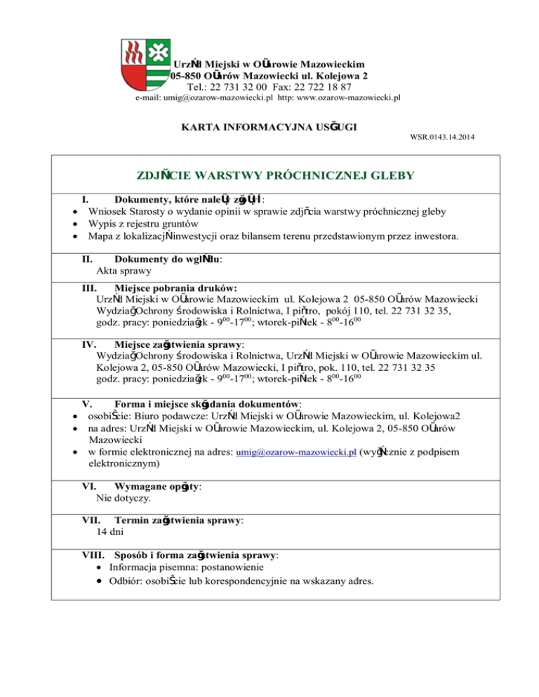 Urząd Miejski w Ożarowie Mazowieckim 05-850 Ożarów Mazowiecki ul. Kolejowa 2 Tel.: 22 731 32 00 Fax: 22 722 18 87 e-mail: [email protected] http: www.ozarow-mazowiecki.pl KARTA INFORMACYJNA USŁUGI WSR.0143.14.2014 ZDJĘCIE WARSTWY PRÓCHNICZNEJ GLEBY I. Dokumenty, które należy złożyć: · Wniosek Starosty o wydanie opinii w sprawie zdjęcia warstwy próchnicznej gleby · Wypis z rejestru gruntów · Mapa z lokalizacją inwestycji oraz bilansem terenu przedstawionym przez inwestora. II. Dokumenty do wglądu: Akta sprawy III. Miejsce pobrania druków: Urząd Miejski w Ożarowie Mazowieckim ul. Kolejowa 2 05-850 Ożarów Mazowiecki Wydział Ochrony Środowiska i Rolnictwa, I piętro, pokój 110, tel. 22 731 32 35, godz. pracy: poniedziałek - 900-1700; wtorek-piątek - 800-1600 IV. Miejsce załatwienia sprawy: Wydział Ochrony Środowiska i Rolnictwa, Urząd Miejski w Ożarowie Mazowieckim ul. Kolejowa 2, 05-850 Ożarów Mazowiecki, I piętro, pok. 110, tel. 22 731 32 35 godz. pracy: poniedziałek - 900-1700; wtorek-piątek - 800-1600 V. Forma i miejsce składania dokumentów: · osobiście: Biuro podawcze: Urząd Miejski w Ożarowie Mazowieckim, ul. Kolejowa2 · na adres: Urząd Miejski w Ożarowie Mazowieckim, ul. Kolejowa 2, 05-850 Ożarów Mazowiecki · w formie elektronicznej na adres: [email protected] (wyłącznie z podpisem elektronicznym) VI. Wymagane opłaty: Nie dotyczy. VII. Termin załatwienia sprawy: 14 dni VIII. Sposób i forma załatwienia sprawy: · Informacja pisemna: postanowienie · Odbiór: osobiście lub korespondencyjnie na wskazany adres. IX. Tryb odwoławczy: Odwołanie od decyzji składa się w ciągu 14 dni od daty jej doręczenia do Samorządowego Kolegium Odwoławczego w Warszawie, ul. Kielecka 44 za pośrednictwem Burmistrza Ożarowa Mazowieckiego. X. Dodatkowe informacje: W przypadku braków formalnych w wymaganych dokumentach składający wniosek zostanie wezwany do ich uzupełnienia. XI. Podstawa prawna: Ustawa z dnia 3 lutego 1995r., o ochronie gruntów rolnych i leśnych, (Dz.U.2013.1205 j.t. ze zm.). 1. Opracował: Katarzyna Rykowska 2. Zatwierdził: Robert Głazowski