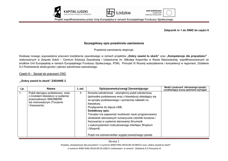 Projekt współfinansowany przez Unię Europejską w ramach Europejskiego Funduszu Społecznego Załącznik nr 1 do SIWZ do części 6 Szczegółowy opis przedmiotu zamówienia Przedmiot zamówienia obejmuje: Dostawę nowego wyposażenia pracowni kształcenia zawodowego w ramach projektów „Dobry zawód to skarb” oraz „Kompetencje dla przyszłości” , realizowanych w Zespole Szkół – Centrum Edukacji Zawodowej i Ustawicznej im. Mikołaja Kopernika w Rawie Mazowieckiej, współfinansowanych ze środków Unii Europejskiej w ramach Europejskiego Funduszu Społecznego, POKL Priorytet IX Rozwój wykształcenia i kompetencji w regionach, Działanie 9.2 Podniesienie atrakcyjności i jakości szkolnictwa zawodowego. Cześć 6 - Sprzęt do pracowni CNC „Dobry zawód to skarb” ZADANIE 2 Lp. 1. Nazwa L.szt. Pulpit sterujący podstawowy wraz z modułem klawiatury w systemie przemysłowym SINUMERIK lub równoważnym (Toczenie i frezowanie) 3 Opis/parametry/uwagi Zamawiającego Model i producent oferowanego sprzętu umożliwiający ocenę spełnienia wymagań Konsola szkoleniowa - zewnętrzny pulpit szkoleniowy (jednostka podstawowa wraz z klawiaturą) składający się ze sprzętu podstawowego i wymiennej nakładki na klawiaturę. Przyłączenie do złącza USB. Dodatkowy opis: Trenażer ma zapewniać możliwość nauki programowania obrabiarek sterowanych numerycznie (obróbki toczenia i frezowania) w systemie sterowania Sinumerik z wykorzystaniem rozbudowanego interfejsu Shopturn i Shopmill. Pulpit ma odzwierciedlać wygląd prawdziwego panela Strona 1 Projekty „Kompetencje dla przyszłości” o numerze WND-POKL.09.02.00-10-094/11 oraz „Dobry zawód to skarb” o numerze WND-POKL.09.02.00-10-228/11 realizowane w ramach Działania 9.2 Priorytetu IX Projekt współfinansowany przez Unię Europejską w ramach Europejskiego Funduszu Społecznego operatorskiego tzn. układ klawiatury systemu sterowania Sinumerik 810/840d lub równoważnym Klawiatura: 150 klawiszy, w tym klawiatura alfanumeryczna. Klawisze odpowiedzialne za zmianę zakładek sterowania oraz klawisze: Machine, Menu Select, Insert, Input, Select, Next Window, Page UP, Page Down, End, klawisze kierunkowe ułatwiające poruszanie się po sterowaniu, Offset, Custom, Program, Alarm, Program Manager, Help, Channel, Alarm Cancel, wybór trybu pracy "JOG" (reczny), wybór trybu "Teach In", wybór trybu pracy "MDA" (półautomatyczny), wybór trybu pracy "AUTO" (automatyczny), powrót do pozycji, ponowne dosunięcie narzędzia do konturu, bazowanie do punktu referencyjnego, klawisz zmiany cyklu pracy, klawisz zatrzymania posuwu, załączenia i wyłączenia programu, zwiększenie procentowe prędkości obrotowej, zmniejszenie procentowe prędkości obrotowej, włączenie i wyłączenie chłodziwa, klawisz zatrzymania wrzeciona, klawisze zmiany kierunku obrotów, klawisz awaryjnego zatrzymania maszyny. Pulpit wyposażony w złącze USB pozwalające na jego mobilność i uniwersalność. Posiadający jednolitą wymienna klawiaturę, przez co jest przystosowany do ewentualnej zmiany języka programowania na sterowania firmy Heidenhain lub Fanuc. Kompatybilny z systemem operacyjnym Windows XP i Windows7 2. Oprogramowanie sterujące 1 Oprogramowanie treningowe – symulator na komputerze Strona 2 Projekty „Kompetencje dla przyszłości” o numerze WND-POKL.09.02.00-10-094/11 oraz „Dobry zawód to skarb” o numerze WND-POKL.09.02.00-10-228/11 realizowane w ramach Działania 9.2 Priorytetu IX Projekt współfinansowany przez Unię Europejską w ramach Europejskiego Funduszu Społecznego SINUMERIK , (toczenie i frezowanie) 840d PC o funkcjach układu sterowania zainstalowanego na obrabiarce CNC, Program do nauki obsługi i programowania sterowań SINUMERIK 840D Operate Polski interfejs użytkownika symulatora oraz podręczniki w języku polskim, Wersja klasowa programu Oprogramowania Programowanie/Szkolenie dla Siemens Sinutrain Operate Program przygotowywany, testowany i symulowany w Taki sam sposób jak na samym sterowaniu. Te same funkcje, jak i obsługa na sterowaniu maszyną zapewniają, że program CNC generowany za pomocą tego programu można uruchomić na maszynie. Licencja min. 16 stanowiskowa Sprzęt musi być fabrycznie nowy, wyprodukowany nie wcześniej niż w 2012r., oraz nieeksponowany na konferencjach lub imprezach targowych Wykonawca na urządzenie udzieli min. 12 miesięcznej gwarancji. Zamawiający nie dopuszcza składania ofert wariantowych. Zamawiający dopuszcza składanie ofert równoważnych W cenie oferty musi znaleźć się dostawa sprzętu do siedziby Zamawiającego oraz szkolenie jednodniowe dla 4-osób w zakresie zapoznania i użytkowania sprzętu. .......................... …………………….dnia.......................... ............................................................ podpis wraz z pieczątką osoby upoważnionej do reprezentowania Wykonawcy Strona 3 Projekty „Kompetencje dla przyszłości” o numerze WND-POKL.09.02.00-10-094/11 oraz „Dobry zawód to skarb” o numerze WND-POKL.09.02.00-10-228/11 realizowane w ramach Działania 9.2 Priorytetu IX