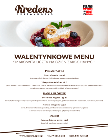 Walentynkowe Menu Smakowita uczta na Dzień Zakochanych Przystawki Tatar z łososia - 26 zł (czerwona cebula, kapary, chilli, pieczona papryka, musztarda dijon) Hiszpańska Sałatka - 28 zł (pełna smaków i aromatów sałatka z krewetkami, chorizo, pieczonymi francuskimi ziemniaczkami, cebula i papryką, pomidorkami cherry, avocado, szafranowo-czosnkowym aioli, redukcją balsamiczną, sałatą) Dania główne Polędwica Mignon - 55 zł (soczysty kawałek polędwicy wołowej, masło parmezanowe, fasolka szparagowa, grillowane francuskie ziemniaczki, sos bernaise, mix sałat) Morska przygoda - 39 zł (łosoś, dorsz, krewetki, małże, pomidory, cebula czerwona, seler naciowy - pieczone w papilocie z masłem ziołowo-czosnkowym; chlebek pita, cytrynowy creme fraiche) Deser Bezowo-lodowe serce - 15 zł (Beza, lody waniliowe, mango, maliny) www.kredens.opole.pl tel. 77 551 61 51 kom. 537 975 105