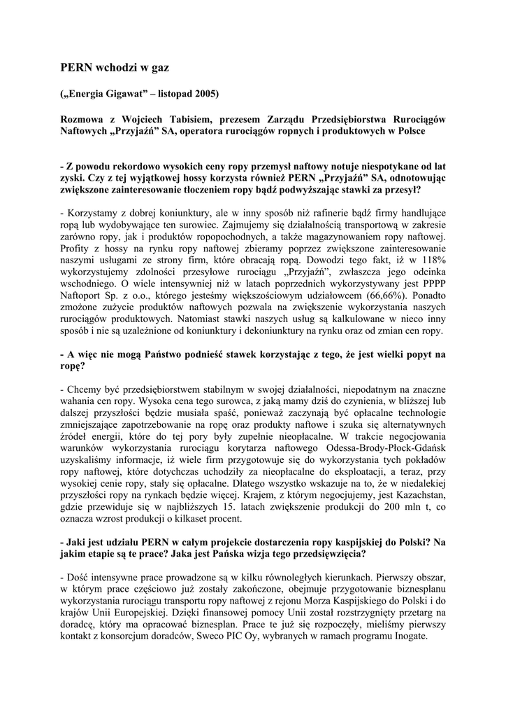PERN wchodzi w gaz („Energia Gigawat” – listopad 2005) Rozmowa z Wojciech Tabisiem, prezesem Zarządu Przedsiębiorstwa Rurociągów Naftowych „Przyjaźń” SA, operatora rurociągów ropnych i produktowych w Polsce - Z powodu rekordowo wysokich ceny ropy przemysł naftowy notuje niespotykane od lat zyski. Czy z tej wyjątkowej hossy korzysta również PERN „Przyjaźń” SA, odnotowując zwiększone zainteresowanie tłoczeniem ropy bądź podwyższając stawki za przesył? - Korzystamy z dobrej koniunktury, ale w inny sposób niż rafinerie bądź firmy handlujące ropą lub wydobywające ten surowiec. Zajmujemy się działalnością transportową w zakresie zarówno ropy, jak i produktów ropopochodnych, a także magazynowaniem ropy naftowej. Profity z hossy na rynku ropy naftowej zbieramy poprzez zwiększone zainteresowanie naszymi usługami ze strony firm, które obracają ropą. Dowodzi tego fakt, iż w 118% wykorzystujemy zdolności przesyłowe rurociągu „Przyjaźń”, zwłaszcza jego odcinka wschodniego. O wiele intensywniej niż w latach poprzednich wykorzystywany jest PPPP Naftoport Sp. z o.o., którego jesteśmy większościowym udziałowcem (66,66%). Ponadto zmożone zużycie produktów naftowych pozwala na zwiększenie wykorzystania naszych rurociągów produktowych. Natomiast stawki naszych usług są kalkulowane w nieco inny sposób i nie są uzależnione od koniunktury i dekoniunktury na rynku oraz od zmian cen ropy. - A więc nie mogą Państwo podnieść stawek korzystając z tego, że jest wielki popyt na ropę? - Chcemy być przedsiębiorstwem stabilnym w swojej działalności, niepodatnym na znaczne wahania cen ropy. Wysoka cena tego surowca, z jaką mamy dziś do czynienia, w bliższej lub dalszej przyszłości będzie musiała spaść, ponieważ zaczynają być opłacalne technologie zmniejszające zapotrzebowanie na ropę oraz produkty naftowe i szuka się alternatywnych źródeł energii, które do tej pory były zupełnie nieopłacalne. W trakcie negocjowania warunków wykorzystania rurociągu korytarza naftowego Odessa-Brody-Płock-Gdańsk uzyskaliśmy informacje, iż wiele firm przygotowuje się do wykorzystania tych pokładów ropy naftowej, które dotychczas uchodziły za nieopłacalne do eksploatacji, a teraz, przy wysokiej cenie ropy, stały się opłacalne. Dlatego wszystko wskazuje na to, że w niedalekiej przyszłości ropy na rynkach będzie więcej. Krajem, z którym negocjujemy, jest Kazachstan, gdzie przewiduje się w najbliższych 15. latach zwiększenie produkcji do 200 mln t, co oznacza wzrost produkcji o kilkaset procent. - Jaki jest udziału PERN w całym projekcie dostarczenia ropy kaspijskiej do Polski? Na jakim etapie są te prace? Jaka jest Pańska wizja tego przedsięwzięcia? - Dość intensywne prace prowadzone są w kilku równoległych kierunkach. Pierwszy obszar, w którym prace częściowo już zostały zakończone, obejmuje przygotowanie biznesplanu wykorzystania rurociągu transportu ropy naftowej z rejonu Morza Kaspijskiego do Polski i do krajów Unii Europejskiej. Dzięki finansowej pomocy Unii został rozstrzygnięty przetarg na doradcę, który ma opracować biznesplan. Prace te już się rozpoczęły, mieliśmy pierwszy kontakt z konsorcjum doradców, Sweco PIC Oy, wybranych w ramach programu Inogate. Drugi obszar dotyczy poszukiwania odbiorców tej ropy. Ponieważ chcemy, aby było to przedsięwzięcie komercyjne, szukamy udziałowców, którzy byliby zainteresowani wykorzystywaniem tej drogi transportu ropy naftowej. Takie rozmowy przeprowadziliśmy w Kazachstanie: został podpisany list intencyjny z KazMunaiGazem, w najbliższym czasie spodziewamy się delegacji tej firmy w Polsce. Będziemy rozmawiać na temat szczegółów dotyczących stopnia zainteresowania projektem strony kazaskiej, w tym roli Międzynarodowego Przedsiębiorstwo Rurociągowego Sarmatia Sp. z o.o., którego PERN jest 50% udziałowcem (drugie 50% udziałów posiada O.S.A. Ukrtransnafta, ukraińskie przedsiębiorstwo rurociągowe), w wykorzystaniu tego rurociągu. Oczywiście, poza rozmowami na temat korytarza naftowego Brody-Płock-Gdańsk, toczone są rozmowy dotyczące ogółu zagadnień związanych z transportem ropy z Kazachstanu, czyli nie tylko złóż pochodzących z basenu Morza kaspijskiego, ale również ze złóż leżących w głębi tego kraju. Odmienny kierunek naszych działań wyznaczają rozmowy z potencjalnymi odbiorcami kaspijskiej ropy. Nasza uwaga jest skierowana na rynek amerykański i rynek UE, gdzie firmy takie jak ChevronTexaco, Conaco Philips wykazują zainteresowanie jej odbiorem. Ponadto nowy obszar potencjalnego zbytu pojawił się w momencie, gdy PKN Orlen SA wykupił czeski Unipetrol, który w większości wykorzystuje ropę lekką, zbliżoną w swych parametrach do ropy kaspijskiej. Również w tym obszarze prowadzimy rozmowy, aby stwierdzić, jaką część strumienia ropy można by skierować do Unipetrolu. - Czy to wyczerpuje listę problemów związanych z tą inwestycją? - Odrębnym zagadnieniem jest kwestia uzgodnień z samorządami dotyczących przebiegu rurociągu. Te rozmowy z punktu widzenia całego procesu inwestycyjnego są najbardziej długotrwałe i wymagają wzmożonego wysiłku negocjacyjnego zarówno w kontaktach z samorządami, jak i z właścicielami poszczególnych działek. Bardzo mocno doświadczyliśmy tych problemów podczas realizacji inwestycji na wschodnim odcinku rurociągu „Przyjaźń”. Przewidujemy, i pod tym kątem wykonujemy także odpowiednie analizy, że wzdłuż rurociągu Odessa-Brody-Płock-Gdańsk będzie poprowadzony rurociąg produktowy. Rozmowy z Polskim Górnictwem Naftowym i Gazownictwem SA i Gaz Systemem Sp. z o.o., operatorem gazociągów przesyłowych pokazują, że istnieje zainteresowanie wykorzystaniem przebiegu tego rurociągu dla przesyłu gazu ziemnego. To jest cały kompleks zagadnień, który musimy połączyć w jeden proces inwestycyjny. Pracuje na