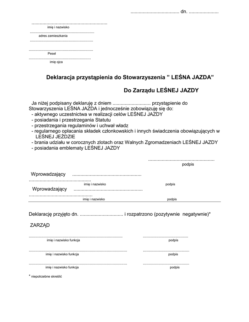 .................................... dn. ...................... ........................................................ imię i nazwisko ......................................................... adres zamieszkania ........................................................ ......................................................... Pesel ....................................................... imię ojca Deklaracja przystąpienia do Stowarzyszenia ” LEŚNA JAZDA” Do Zarządu LEŚNEJ JAZDY Ja niżej podpisany deklaruję z dniem ............................ przystąpienie do Stowarzyszenia LEŚNA JAZDA i jednocześnie zobowiązuję się do: - aktywnego uczestnictwa w realizacji celów LEŚNEJ JAZDY - posiadania i przestrzegania Statutu - przestrzegania regulaminów i uchwał władz - regularnego opłacania składek członkowskich i innych świadczenia obowiązujących w LEŚNEJ JEŹDZIE - brania udziału w corocznych zlotach oraz Walnych Zgromadzeniach LEŚNEJ JAZDY - posiadania emblematy LEŚNEJ JAZDY ................................................. podpis Wprowadzający ................................................... .............................................. imię i nazwisko podpis Wprowadzający ................................................... ............................................... imię i nazwisko podpis Deklarację przyjęto dn. ................................ i rozpatrzono (pozytywnie negatywnie)* ZARZĄD ................................................................................... imię i nazwisko funkcja ....................................................................................... imię i nazwisko funkcja ....................................................................................... imię i nazwisko funkcja * niepotrzebne skreślić ........................................ podpis ......................................... podpis ......................................... podpis