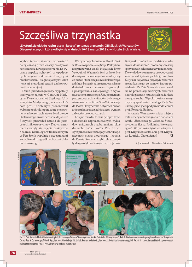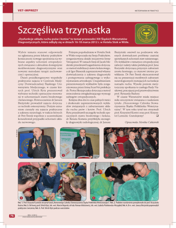 VETIMPREZY WETERYNARIA W PRAKTYCE Szczęśliwa trzynastka „Dysfunkcje układu ruchu psów i kotów” to temat przewodni XIII Śląskich Warsztatów Diagnostycznych, które odbyły się w dniach 16-18 marca 2012 r. w Hotelu Stok w Wiśle. Późnym popołudniem w Hotelu Stok w Wiśle rozpoczęła się Sesja Praktyków, zorganizowana dzięki inicjatywie firmy Vetoquinol. W ramach Sesji dr Jacek Mederski przedstawił zagadnienia dotyczące metod stabilizacji stawu kolanowego, a dr Igor Bissenik zaprezentował własne doświadczenia z zakresu diagnostyki i postępowania zabiegowego z wykorzystaniem artroskopii. Uzupełnieniem prezentowanych wykładów była zorganizowana przez firmę ScanVet prelekcja dr. Piotra Skrzypczaka dotycząca metod znieczulenia uwzględniającego wymogi zabiegów ortopedycznych. Kolejne dwa dni to czas pełnych treści i doskonale zaprezentowanych wykładów związanych z zaburzeniami układu ruchu psów i kotów. Prof. Ulrich Rytz przedstawił szczegóły technik operacyjnych stawu biodrowego i kolana, dr Renata Komsta przybliżyła szczegóły diagnostyki radiologicznej, dr Janusz Bieżyński omówił na podstawie własnych doświadczeń problemy częściej spotykanych schorzeń staw ramiennego. Do wykładów o tematyce ortopedycznej zaliczyć należy także prelekcję prof. Jana Kuryszki dotyczącą przyczyn zaburzeń zrostu kostnego, co stanowi istotne powikłanie. Dr Petr Šrenk skoncentrował się na prezentacji możliwych zaburzeń neurologicznych rzutujących na funkcje narządu ruchu. Wysoki poziom merytoryczny spotkania to zasługa Rady Naukowej, pracującej pod przewodnictwem prof. Ryszarda Badury. W czasie Warsztatów miała miejsce miła uroczystość związana z nadaniem tytułu „Honorowego Członka Stowarzyszenia Śląska Poliklinika Weterynaryjna”. W tym roku tytuł ten otrzymali prof. Krzysztof Kostro oraz prof. Krzysztof Lutnicki. Gratulujemy! Opracowała: Monika Cukiernik fot. M. Cukiernik Wybór tematu stanowi odpowiedź na zgłaszaną przez lekarzy praktyków konieczność nowego spojrzenia na wybrane aspekty schorzeń ortopedycznych związane z aktualnie dostępnymi możliwościami diagnostycznymi oraz nowymi metodami terapii zachowawczej i operacyjnej. Dzień przedkongresowy wypełniły praktyczne zajęcia w Centrum Medycyny Doświadczalnej Śląskiego Uniwersytetu Medycznego, w czasie których prof. Ulrich Rytz prezentował wybrane techniki operacyjne stosowane w schorzeniach stawu biodrowego i kolanowego. Równocześnie dr Janusz Bieżyński prowadził zajęcia dotyczące technik osteosyntezy. Dużym uznaniem cieszyły się zajęcia praktyczne z zakresu neurologii, w trakcie których dr Petr Šrenk wspólnie z uczestnikami konsultował przypadki schorzeń układu nerwowego. 1 2 4 3 5 Fot. 1. Prof. Krzysztof Lutnicki otrzymał tytuł „Honorowego Członka Stowarzyszenia Śląska Poliklinika Weterynaryjna”; Fot. 2. Podobne wyróżnienie powędrowało do prof. Krzysztofa Kostro; Fot. 3. Od lewej: prof. Ulrich Rytz, lek. wet. Marcin Bojarski, dr hab. Roman Aleksiewicz, lek. wet. Izabela Piotrkowska-Mrzygłód; Fot. 4. Dr n. wet. Janusz Bieżyński poprowadził praktyczne ćwiczenia; Fot. 5. Prof. Ulrich Rytz podczas warsztatów 76 MAJ • 5/2012 www.weterynaria.elamed.pl