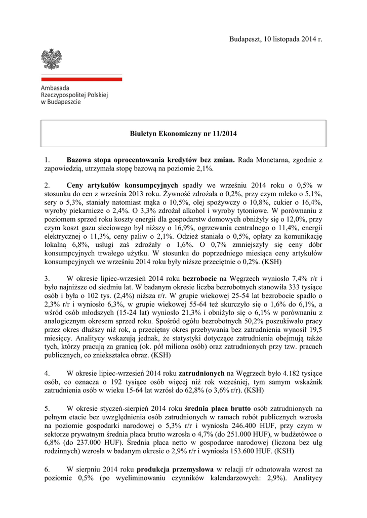 Budapeszt, 10 listopada 2014 r. Biuletyn Ekonomiczny nr 11/2014 1. Bazowa stopa oprocentowania kredytów bez zmian. Rada Monetarna, zgodnie z zapowiedzią, utrzymała stopę bazową na poziomie 2,1%. 2. Ceny artykułów konsumpcyjnych spadły we wrześniu 2014 roku o 0,5% w stosunku do cen z września 2013 roku. Żywność zdrożała o 0,2%, przy czym mleko o 5,1%, sery o 5,3%, staniały natomiast mąka o 10,5%, olej spożywczy o 10,8%, cukier o 16,4%, wyroby piekarnicze o 2,4%. O 3,3% zdrożał alkohol i wyroby tytoniowe. W porównaniu z poziomem sprzed roku koszty energii dla gospodarstw domowych obniżyły się o 12,0%, przy czym koszt gazu sieciowego był niższy o 16,9%, ogrzewania centralnego o 11,4%, energii elektrycznej o 11,3%, ceny paliw o 2,1%. Odzież staniała o 0,5%, opłaty za komunikację lokalną 6,8%, usługi zaś zdrożały o 1,6%. O 0,7% zmniejszyły się ceny dóbr konsumpcyjnych trwałego użytku. W stosunku do poprzedniego miesiąca ceny artykułów konsumpcyjnych we wrześniu 2014 roku były niższe przeciętnie o 0,2%. (KSH) 3. W okresie lipiec-wrzesień 2014 roku bezrobocie na Węgrzech wyniosło 7,4% r/r i było najniższe od siedmiu lat. W badanym okresie liczba bezrobotnych stanowiła 333 tysiące osób i była o 102 tys. (2,4%) niższa r/r. W grupie wiekowej 25-54 lat bezrobocie spadło o 2,3% r/r i wyniosło 6,3%, w grupie wiekowej 55-64 też skurczyło się o 1,6% do 6,1%, a wśród osób młodszych (15-24 lat) wyniosło 21,3% i obniżyło się o 6,1% w porównaniu z analogicznym okresem sprzed roku. Spośród ogółu bezrobotnych 50,2% poszukiwało pracy przez okres dłuższy niż rok, a przeciętny okres przebywania bez zatrudnienia wynosił 19,5 miesięcy. Analitycy wskazują jednak, że statystyki dotyczące zatrudnienia obejmują także tych, którzy pracują za granicą (ok. pół miliona osób) oraz zatrudnionych przy tzw. pracach publicznych, co zniekształca obraz. (KSH) 4. W okresie lipiec-wrzesień 2014 roku zatrudnionych na Węgrzech było 4.182 tysiące osób, co oznacza o 192 tysiące osób więcej niż rok wcześniej, tym samym wskaźnik zatrudnienia osób w wieku 15-64 lat wzrósł do 62,8% (o 3,6% r/r). (KSH) 5. W okresie styczeń-sierpień 2014 roku średnia płaca brutto osób zatrudnionych na pełnym etacie bez uwzględnienia osób zatrudnionych w ramach robót publicznych wzrosła na poziomie gospodarki narodowej o 5,3% r/r i wyniosła 246.400 HUF, przy czym w sektorze prywatnym średnia płaca brutto wzrosła o 4,7% (do 251.000 HUF), w budżetówce o 6,8% (do 237.000 HUF). Średnia płaca netto w gospodarce narodowej (liczona bez ulg rodzinnych) wzrosła w badanym okresie o 2,9% r/r i wyniosła 153.600 HUF. (KSH) 6. W sierpniu 2014 roku produkcja przemysłowa w relacji r/r odnotowała wzrost na poziomie 0,5% (po wyeliminowaniu czynników kalendarzowych: 2,9%). Analitycy wskazują, że głównym powodem była miesięczna przerwa wakacyjna prducenów samochodów (przede wszystkim Audi). W stosunku do poprzedniego miesiąca, po wyeliminowaniu czynników sezonowych i kalendarzowych, wskaźnik produkcji spadł w sierpniu 2014 roku o 5,7%. Produkcja w okresie styczeń-sierpień była wyższa o 8,7% r/r. Eksport produktów przemysłowych wzrósł w sierpniu o 2,5%, w okresie styczeń-sierpień o 11,4% r/r, sprzedaż krajowa produktów przemysłowych odpowiednio o 0,3% i 1,4% r/r. (KSH) 7. W sierpniu 2014 roku ceny produkcji sprzedanej przemysłu były niższe o 0,4% w stosunku do sierpnia 2013 roku, od początku roku kumulowany spadek wyniósł 0,7%, a w stosunku do poprzedniego miesiąca ceny wzrosły o 0,7%, przy czym ceny sprzedaży krajowej w sierpniu skurczyły się o 2,9% r/r, a sprzedaży na eksport wzrosły o 1,2% r/r. (KSH) 8. Węgierski przemysł budowlany odnotował w sierpniu 2014 roku wzrost o 13,1% w porównaniu z sierpniem 2013 roku, przy czym produkcja budynków wzrosła o 4,1% r/r, zaś wykonanie robót budowlanych innego typu było wyższe o 22,5% r/r. W stosunku do sierpnia 2013 roku w sierpniu 2014 roku portfel nowych zamówień na roboty budowlane był niższy o 31,4%, a skumulowana liczba zamówień była wyższa o 35,8%. r/r (KSH) 9. W okresie styczeń-sierpień 2014 roku wartość węgierskiego eksportu wyniosła 55.149,5 mln EUR (wzrost o 4,0% r/r), a importu 51.105,1 mln EUR (wzrost o 4,3% r/r), co oznacza, że - dodatnie dla Węgier - saldo obrotów handlowych ukształtowało się na poziomie 4.044,4 mln EUR. W sierpniu nadwyżka obrotów handlowych stanowiła 279 mln EUR. (KSH) 10. W sierpniu 2014 roku wolumen obrotów handlu detalicznego po wyeliminowaniu czynników kalendarzowych - wzrósł o 2,0% r/r. W stosunku do poprzedniego miesiąca, po wyeliminowaniu czynników sezonowych i kalendarzowych, wolumen obrotów handlu detalicznego wzrósł o 0,3%. Wartość obrotów handlu detalicznego (w tym również internetowego i wysyłkowego) w sierpniu 2014 roku wyniosła 793,0 mld HUF. (KSH) 11. W stosunku do sierpnia 2013 roku ceny produktów rolnych spadły w sierpniu 2014 roku o 3,3%, przy czym ceny upraw roślinnych skurczyły się o 4,49% r/r, a zwierząt żywych i produktów pochodzenia zwierzęcego o 0,8%. (KSH) 12. Międzynarodowe rezerwy węgierskiego banku centralnego MNB wyniosły na koniec września 2014 roku 35.684,0 mln EUR (w analogicznym okresie 2013 roku rezerwy wynosiły 30.815,0 mln EUR). 13. W październiku 2014 roku obroty na Budapeszteńskiej Giełdzie Papierów Wartościowych (BÉT) wyniosły 123.277,2 mln HUF (spadek o 28,6% w stosunku do poprzedniego miesiąca; spadek o 47,5% w stosunku do października 2013 roku), a średnia wartość dziennej transakcji wyniosła 5.870,3 mln HUF. 14. Deficyt budżetowy. Według resortu gospodarki deficyt w pierwszych dziesięciu miesiącach 2014 roku wyniósł 809,6 mld HUF, czyli 82,2% całego deficytu założonego na rok bieżący (984,6 mld HUF). W samym październiku odnotowano nadwyżkę rzędu 35 mld HUF. 15. Jesienna prognoza Komisji Europejskiej Progn