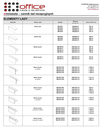 10 OFFICE meble biurowe tel. 22 280 90 10 kom. 885 80 10 10 www.10office.pl minnesota – cennik lad recepcyjnych ELEMENTY LADY Rysunek Nazwa i opis Symbol Wymiary dł. x gł. x h Cena w PLN netto Moduł niski MS-RF1 MS-RF2 MS-RF3 MS-RF4 80x62x74 100x62x74 120x62x74 140x62x74 401 zł 450 zł 503 zł 551 zł Moduł niski MS-RF5 MS-RF6 MS-RF7 160x62x74 180x62x74 200x62x74 594 zł 648 zł 696 zł Moduł wysoki MS-RF10 MS-RF11 MS-RF12 MS-RF13 100x70x115 120x70x115 140x70x115 160x70x115 567 zł 632 zł 690 zł 755 zł Moduł wysoki MS-RF14 MS-RF15 180x70x115 200x70x115 813 zł 878 zł Moduł wysoki ze szkłem MS-RF10/S MS-RF11/S MS-RF12/S MS-RF13/S 100x70x115 120x70x115 140x70x115 160x70x115 1 065 zł 1 158 zł 1 348 zł 1 428 zł Moduł wysoki ze szkłem MS-RF14/S MS-RF15/S 180x70x115 200x70x115 1 511 zł 1 601 zł Moduł wysoki z panelem MS-RF10/P MS-RF11/P MS-RF12/P MS-RF13/P 100x70x115 120x70x115 140x70x115 160x70x115 878 zł 969 zł 1 052 zł 1 140 zł Moduł wysoki z panelem MS-RF14/P MS-RF15/P 180x70x115 200x70x115 1 225 zł 1 343 zł Moduł wysoki z panelem i szkłem MS-RF10/P/S MS-RF11/P/S MS-RF12/P/S MS-RF13/P/S 100x70x115 120x70x115 140x70x115 160x70x115 1 375 zł 1 495 zł 1 710 zł 1 812 zł Moduł wysoki z panelem i szkłem MS-RF14/P/S MS-RF15/P/S 180x70x115 200x70x115 1 923 zł 2 065 zł DODATKI Rysunek Nazwa i opis Symbol Wymiary dł. x gł. x h Cena w PLN netto Element łączący MS-RF20 MS-RF21 70x70x115 70x70x74 1 953 zł 1 883 zł Bok łączący prawy lub lewy MS-RF25 MS-RF26 11x70x115 11x70x74 1 027 zł 974 zł Oświetlenie modułu z panelem przy zamówieniu należy podać index modułu MS-RFO - 883 zł