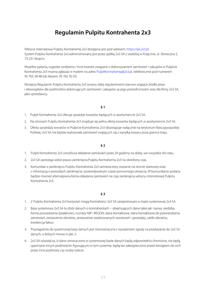 Regulamin Pulpitu Kontrahenta 2x3 Witryna internetowa Pulpitu Kontrahenta 2x3 dostępna jest pod adresem: https://pk.2x3.pl. System Pulpitu Kontrahenta 2x3 administrowany jest przez spółkę 2x3 SA z siedzibą w Krzęcinie, ul. Słoneczna 3, 73-231 Krzęcin. Wszelkie pytania, sugestie, problemy i inne kwestie związane z dokonywaniem zamówień i zakupów w Pulpicie Kontrahenta 2x3 można zgłaszać e-mailem na adres [email protected], telefonicznie pod numerem 95 765 38 48 lub faksem: 95 765 30 50. Niniejszy Regulamin Pulpitu Kontrahenta 2x3 (zwany dalej regulaminem) stanowi wiążące źródło praw i obowiązków dla podmiotów dokonujących zamówień i zakupów za jego pośrednictwem oraz dla firmy 2x3 SA, jako sprzedawcy. §1 1. Pulpit Kontrahenta 2x3 oferuje sprzedaż towarów będących w asortymencie 2x3 SA. 2. Na stronach Pulpitu Kontrahenta 2x3 znajduje się pełna oferta towarów będących w asortymencie 2x3 SA. 3. Oferta sprzedaży towarów w Pulpicie Kontrahenta 2x3 obowiązuje wyłącznie na terytorium Rzeczypospolitej Polskiej. 2x3 SA nie będzie realizowała zamówień wiążących się z wysyłką towaru poza granice kraju. §2 1. Pulpit Kontrahenta 2x3 umożliwia składanie zamówień przez 24 godziny na dobę, we wszystkie dni roku. 2. 2x3 SA zastrzega sobie prawo zamknięcia Pulpitu Kontrahenta 2x3 na określony czas. 3. Komunikat o zamknięciu Pulpitu Kontrahenta 2x3 zamieszczony zostanie na stronie startowej wraz z informacją o powodach zamknięcia i przewidywanym czasie ponownego otwarcia. W komunikacie podana będzie również alternatywna forma składania zamówień na czas zamknięcia witryny internetowej Pulpitu Kontrahenta 2x3. §3 1. Z Pulpitu Kontrahenta 2x3 korzystać mogą Kontrahenci 2x3 SA zarejestrowani w bazie systemowej 2x3 SA. 2. Baza systemowa 2x3 SA to zbiór danych o kontrahentach – obejmujących dane takie jak: nazwa, siedziba, forma prowadzenia działalności, numery NIP i REGON, dane kontaktowe, dane kontaktowe do potwierdzania zamówień, zestawienie obrotów, zestawienie zrealizowanych zamówień i sprzedaży, saldo obrotów, ewidencja faktur. 3. Przystąpienie do systemowej bazy danych jest równoznaczne z wyrażeniem zgody na przekazanie do 2x3 SA danych, o których mowa w pkt. 2. 4. 2x3 SA oświadcza, iż dane umieszczone w systemowej bazie danych będą odpowiednio chronione, nie będą ujawniane innym podmiotom figurującym w tym systemie, będą też zabezpieczone przed dostępem do nich przez inne podmioty czy osoby trzecie. 1/3 5. Kontrahenci 2x3 SA figurujący w systemowej bazie danych celem korzystania z Pulpitu Kontrahenta 2x3, po wyrażeniu woli przystąpienia do niego, otrzymają od 2x3 SA indywidualny login oraz hasło. 6. Login oraz hasło dostępu będą danymi indywidualnie nadanymi. 7. Kontrahenci przystępujący do Pulpitu Kontrahenta 2x3 zobowiązani są we własnym zakresie i na własne ryzyko chronić nadany mi login oraz hasło przed ujawnieniem ich osobom nieuprawnionym. §4 1. Po zalogowaniu się do internetowego systemu składania zamówień, przy użyciu nadanego loginu i hasła, w internetowym systemie składania zamówień Kontrahent będzie widział wykaz pełnego i dostępnego asortymentu jak i pozostałe warunki handlowe takie jak: ewentualne rabaty, ceny towarów, terminy płatności, sposób dostawy. W odpowiednich zakładkach Kontrahent będzie mógł zapoznać się z informacjami o saldzie obrotów z 2x3 SA, należności do zapłaty, limicie kredytowym. 2. W przypadku prawidłowego złożenia zamówienia, zostanie ono przez 2x3 SA potwierdzone. Potwierdzenie następować będzie w formie mailowej w terminie 2 dni od daty jego złożenia. 3. Realizacji będą podlegały wyłącznie zamówienia potwierdzone. 4. W przypadku konieczności weryfikacji zamówienia, jak również uzgodnienia z Kontrahentem innych niezbędnych szczegółów transakcji, 2x3 SA w ciągu 2 dni nawiąże z Klientem kontakt, zgodnie z danymi zamieszczonymi w formularzu. 5. W przypadku braku możliwości weryfikacji, o której mowa w poprzednim punkcie, zamówienie zostanie anulowane. Anulowanie zamówienia może nastąpić, jeżeli w ciągu 4 dni od jego złożenia nie dojdzie do jego weryfikacji z przyczyn leżących po stronie Kontrahenta. 6. Brak potwierdzenia złożonego zamówienie w terminie 2 dni od jego złożenia przez 2x3 SA może oznaczać, iż zamówienie nie dotarło do 2x3 SA z przyczyn od spółki niezależnych. W takiej sytuacji Kontrahent proszony jest o nawiązanie kontaktu celem wyjaśnienia zamówienia. 7. Po potwierdzeniu realizacji zamówienia przez 2x3 SA jego anulowanie przez Kontrahenta nie jest możliwe. W sytuacji takiej 2x3 SA może domagać się zapłaty całej należności. §5 2x3 SA nie ponosi odpowiedzialności za ewentualne nieprawidłowe funkcjonowanie łącz internetowych wykorzystywanych do składania zamówień w Pulpicie Kontrahenta 2x3 i związanych z tym problemów. §6 1. Dostawa następuje wyłącznie w dni robocze. 2. Minimum logistyczne każdego zamówienia wynosi 1000 zł netto i dotyczy jednorazowej wysyłki w jedno miejsce. 3. Jeżeli zamówienie nie będzie spełniało minimum logistycznego, wówczas zostanie doliczony koszt transportu za dostawę, uzależniony od gabarytów zamówionego towaru. 4. Towar dostarczany jest za pośrednictwem firmy spedycyjnej. 5. Wraz z dostawą towaru dostarczane będą również dokumenty WZ (wydanie zewnętrzne). 2/3 §7 4. W przypadku wystąpienia okoliczności uniemożliwiających zrealizowanie zamówienia zgodnie z jego treścią, jak i we wskazanych powyżej terminach, z przyczyn leżących po stronie 2x3 SA, takich jak chwilowy brak towaru, 2x3 SA niezwłocznie nawiąże kontakt z Kontrahentem celem ustalenia późniejszego terminu realizacji. 5. W przypadku niemożności realizacji zamówienia zgodnie z jego warunkami lub brakiem potwierdzenia powyżej 4 dni, Kontrahent uprawniony jest do odstąpienia od zamówienia. 6. Odstąpienie od zamówi