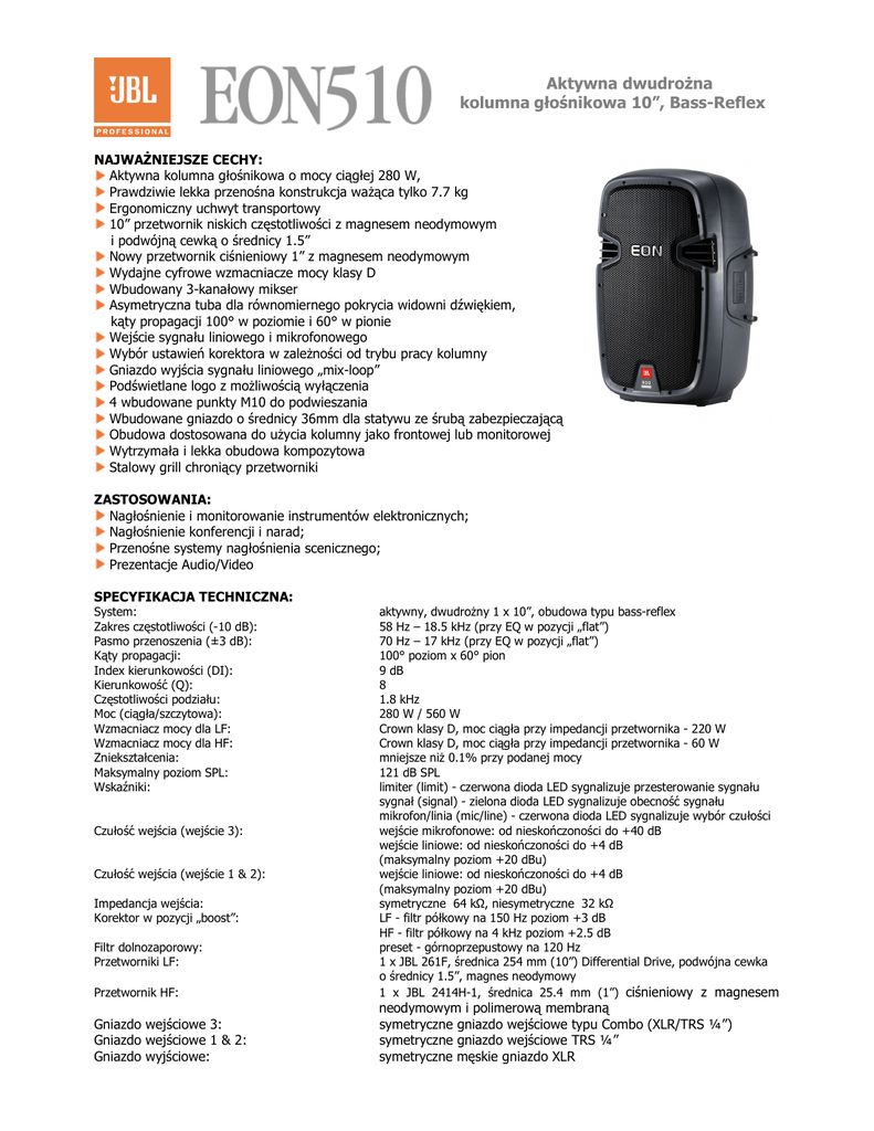 Aktywna dwudrożna kolumna głośnikowa 10”, Bass-Reflex NAJWAŻNIEJSZE CECHY: Aktywna kolumna głośnikowa o mocy ciągłej 280 W, Prawdziwie lekka przenośna konstrukcja ważąca tylko 7.7 kg Ergonomiczny uchwyt transportowy 10” przetwornik niskich częstotliwości z magnesem neodymowym i podwójną cewką o średnicy 1.5” Nowy przetwornik ciśnieniowy 1” z magnesem neodymowym Wydajne cyfrowe wzmacniacze mocy klasy D Wbudowany 3-kanałowy mikser Asymetryczna tuba dla równomiernego pokrycia widowni dźwiękiem, kąty propagacji 100° w poziomie i 60° w pionie Wejście sygnału liniowego i mikrofonowego Wybór ustawień korektora w zależności od trybu pracy kolumny Gniazdo wyjścia sygnału liniowego „mix-loop” Podświetlane logo z możliwością wyłączenia 4 wbudowane punkty M10 do podwieszania Wbudowane gniazdo o średnicy 36mm dla statywu ze śrubą zabezpieczającą Obudowa dostosowana do użycia kolumny jako frontowej lub monitorowej Wytrzymała i lekka obudowa kompozytowa Stalowy grill chroniący przetworniki ZASTOSOWANIA: Nagłośnienie i monitorowanie instrumentów elektronicznych; Nagłośnienie konferencji i narad; Przenośne systemy nagłośnienia scenicznego; Prezentacje Audio/Video SPECYFIKACJA TECHNICZNA: System: Zakres częstotliwości (-10 dB): Pasmo przenoszenia (±3 dB): Kąty propagacji: Index kierunkowości (DI): Kierunkowość (Q): Częstotliwości podziału: Moc (ciągła/szczytowa): Wzmacniacz mocy dla LF: Wzmacniacz mocy dla HF: Zniekształcenia: Maksymalny poziom SPL: Wskaźniki: Przetwornik HF: aktywny, dwudrożny 1 x 10”, obudowa typu bass-reflex 58 Hz – 18.5 kHz (przy EQ w pozycji „flat”) 70 Hz – 17 kHz (przy EQ w pozycji „flat”) 100° poziom x 60° pion 9 dB 8 1.8 kHz 280 W / 560 W Crown klasy D, moc ciągła przy impedancji przetwornika - 220 W Crown klasy D, moc ciągła przy impedancji przetwornika - 60 W mniejsze niż 0.1% przy podanej mocy 121 dB SPL limiter (limit) - czerwona dioda LED sygnalizuje przesterowanie sygnału sygnał (signal) - zielona dioda LED sygnalizuje obecność sygnału mikrofon/linia (mic/line) - czerwona dioda LED sygnalizuje wybór czułości wejście mikrofonowe: od nieskończoności do +40 dB wejście liniowe: od nieskończoności do +4 dB (maksymalny poziom +20 dBu) wejście liniowe: od nieskończoności do +4 dB (maksymalny poziom +20 dBu) symetryczne 64 kΩ, niesymetryczne 32 kΩ LF - filtr półkowy na 150 Hz poziom +3 dB HF - filtr półkowy na 4 kHz poziom +2.5 dB preset - górnoprzepustowy na 120 Hz 1 x JBL 261F, średnica 254 mm (10”) Differential Drive, podwójna cewka o średnicy 1.5”, magnes neodymowy 1 x JBL 2414H-1, średnica 25.4 mm (1”) ciśnieniowy z magnesem Gniazdo wejściowe 3: Gniazdo wejściowe 1 & 2: Gniazdo wyjściowe: neodymowym i polimerową membraną symetryczne gniazdo wejściowe typu Combo (XLR/TRS ¼”) symetryczne gniazdo wejściowe TRS ¼” symetryczne męskie gniazdo XLR Czułość wejścia (wejście 3): Czułość wejścia (wejście 1 & 2): Impedancja wejścia: Korektor w pozycji „boost”: Filtr dolnozaporowy: Przetworniki LF: Styki XLR: pin 2 (+), pin 3 (-), pin 1 (ekran) Zabezpieczenie: Obudowa: Transport: Podwieszanie/montaż: układ dynamicznego limitera wykonana z tworzywa polimerowego, zastosowanie frontowe i monitorowe ergonomiczny górny uchwyt gniazdo dla statywu o średnicy 36mm ze śrubą zabezpieczającą, 4 punkty M10 do podwieszenia Maskownica: malowana proszkowo stalowa maskownica z otworami, akustycznie neutralna gąbka od wewnątrz 120 - 240 V, 50/60 Hz wysokość 490 mm, szerokość 313 mm, głębokość 262 mm 7.7 kg Wymagane zasilanie: Wymiary kolumny: Waga: Graniczna 17, 05-092 Łomianki-Dąbrowa tel.: +48 22 751 42 46, 751 42 48 fax.: +48 22 751 31 49 www.essaudio.pl