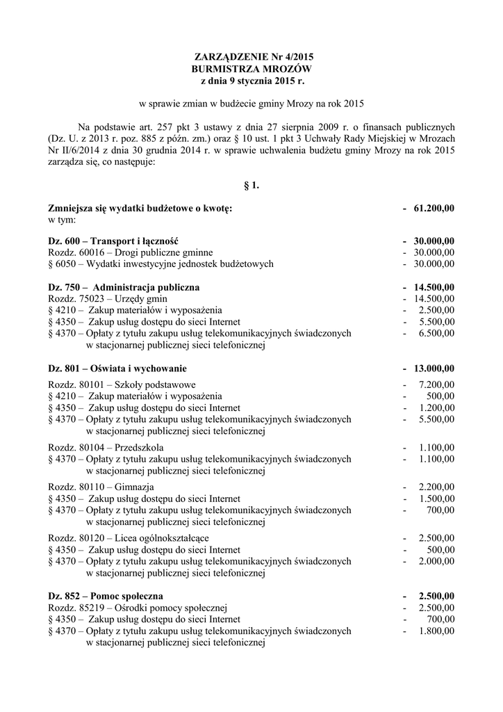 ZARZĄDZENIE Nr 4/2015 BURMISTRZA MROZÓW z dnia 9 stycznia 2015 r. w sprawie zmian w budżecie gminy Mrozy na rok 2015 Na podstawie art. 257 pkt 3 ustawy z dnia 27 sierpnia 2009 r. o finansach publicznych (Dz. U. z 2013 r. poz. 885 z późn. zm.) oraz § 10 ust. 1 pkt 3 Uchwały Rady Miejskiej w Mrozach Nr II/6/2014 z dnia 30 grudnia 2014 r. w sprawie uchwalenia budżetu gminy Mrozy na rok 2015 zarządza się, co następuje: § 1. Zmniejsza się wydatki budżetowe o kwotę: w tym: - 61.200,00 Dz. 600 – Transport i łączność Rozdz. 60016 – Drogi publiczne gminne § 6050 – Wydatki inwestycyjne jednostek budżetowych - 30.000,00 - 30.000,00 - 30.000,00 Dz. 750 – Administracja publiczna Rozdz. 75023 – Urzędy gmin § 4210 – Zakup materiałów i wyposażenia § 4350 – Zakup usług dostępu do sieci Internet § 4370 – Opłaty z tytułu zakupu usług telekomunikacyjnych świadczonych w stacjonarnej publicznej sieci telefonicznej - 14.500,00 - 14.500,00 - 2.500,00 - 5.500,00 - 6.500,00 Dz. 801 – Oświata i wychowanie - 13.000,00 Rozdz. 80101 – Szkoły podstawowe § 4210 – Zakup materiałów i wyposażenia § 4350 – Zakup usług dostępu do sieci Internet § 4370 – Opłaty z tytułu zakupu usług telekomunikacyjnych świadczonych w stacjonarnej publicznej sieci telefonicznej - 7.200,00 500,00 1.200,00 5.500,00 Rozdz. 80104 – Przedszkola § 4370 – Opłaty z tytułu zakupu usług telekomunikacyjnych świadczonych w stacjonarnej publicznej sieci telefonicznej - 1.100,00 1.100,00 Rozdz. 80110 – Gimnazja § 4350 – Zakup usług dostępu do sieci Internet § 4370 – Opłaty z tytułu zakupu usług telekomunikacyjnych świadczonych w stacjonarnej publicznej sieci telefonicznej - 2.200,00 1.500,00 700,00 Rozdz. 80120 – Licea ogólnokształcące § 4350 – Zakup usług dostępu do sieci Internet § 4370 – Opłaty z tytułu zakupu usług telekomunikacyjnych świadczonych w stacjonarnej publicznej sieci telefonicznej - 2.500,00 500,00 2.000,00 Dz. 852 – Pomoc społeczna Rozdz. 85219 – Ośrodki pomocy społecznej § 4350 – Zakup usług dostępu do sieci Internet § 4370 – Opłaty z tytułu zakupu usług telekomunikacyjnych świadczonych w stacjonarnej publicznej sieci telefonicznej - 2.500,00 2.500,00 700,00 1.800,00 -2- Dz. 926 – Kultura fizyczna Rozdz. 92604 – Instytucje kultury fizycznej § 4370 – Opłaty z tytułu zakupu usług telekomunikacyjnych świadczonych w stacjonarnej publicznej sieci telefonicznej - 1.200,00 1.200,00 1.200,00 Zwiększa się wydatki budżetowe o kwotę: w tym: + 61.200,00 Dz. 600 – Transport i łączność Rozdz. 60016 – Drogi publiczne gminne § 6050 – Wydatki inwestycyjne jednostek budżetowych + 30.000,00 + 30.000,00 + 30.000,00 Dz. 750 – Administracja publiczna Rozdz. 75023 – Urzędy gmin § 4280 – Zakup usług zdrowotnych § 4360 – Opłaty z tytułu zakupu usług telekomunikacyjnych + + + + Dz. 801 – Oświata i wychowanie + 13.000,00 Rozdz. 80101 – Szkoły podstawowe § 4270 – Zakup usług remontowych § 4360 – Opłaty z tytułu zakupu usług telekomunikacyjnych + 7.300,00 + 500,00 + 6.800,00 Rozdz. 80104 – Przedszkola § 4360 – Opłaty z tytułu zakupu usług telekomunikacyjnych + 1.100,00 + 1.100,00 Rozdz. 80110 – Gimnazja § 4360 – Opłaty z tytułu zakupu usług telekomunikacyjnych + 4.600,00 + 4.600,00 Dz. 852 – Pomoc społeczna Rozdz. 85219 – Ośrodki pomocy społecznej § 4360 – Opłaty z tytułu zakupu usług telekomunikacyjnych + 2.500,00 + 2.500,00 + 2.500,00 Dz. 926 – Kultura fizyczna Rozdz. 92604 – Instytucje kultury fizycznej § 4360 – Opłaty z tytułu zakupu usług telekomunikacyjnych + 1.200,00 + 1.200,00 + 1.200,00 14.500,00 14.500,00 2.500,00 12.000,00 § 2. Dokonuje się zmian w tabeli nr 2b ,,Plan wydatków majątkowych w 2015 roku" do Uchwały Nr II/6/2014 Rady Miejskiej w Mrozach z dnia 30 grudnia 2014 r. w sprawie uchwalenia budżetu gminy Mrozy na rok 2015. /tabela nr 1 do niniejszego zarządzenia/ § 3. Zarządzenie wchodzi w życie z dniem podpisania -3- UZASADNIENIE Dokonuje się zmian w planie wydatków bieżących oraz wydatków majątkowych pomiędzy rozdziałami i paragrafami w ramach danego działu budżetu gminy Mrozy, w następujący sposób: – dział 600 rozdział 60016 § 6050 zmniejsza się o kwotę 30.000 zł - zadanie inwestycyjne „Budowa i modernizacja dróg i ulic w gminie Mrozy” na zwiększenie wydatków w § 6050 o 30.000 zł – zadanie inwestycyjne „Budowa chodników i parkingów w gminie Mrozy”; – dział 750 rozdział 75023 zmniejsza się § 4210 o kwotę 2.500 zł., § 4350 o kwotę 5.500 zł., § 4370 o kwotę 6.500 zł. na zwiększenie § 4280 o kwotę 2.500 zł. - badania okresowe pracowników, § 4360 o kwotę 12.000 zł.- zakup usług telekomunikacyjnych – zmiana w związku z Rozporządzeniem Ministra Finansów z 16.12.2014 r. poz. 1952 zmieniające rozporządzenie w sprawie szczegółowej klasyfikacji dochodów, wydatków, przychodów i rozchodów oraz środków pochodzących ze źródeł zagranicznych; – dział 801 zmniejsza się wydatki ogółem o kwotę 13.000 zł. w tym: rozdział 80101 zmniejsza się § 4210 o kwotę 500 zł. (SPG), § 4350 ogółem o kwotę 1.200 zł. (w tym: 100 zł.- SPG, 400 zł. - ZSJ, 700 zł. - SPM), § 4370 ogółem o kwotę 5.500 zł. (w tym: 800 zł. - SPG, 2.700 zł. - ZSJ, 2.000 zł. - SPM), rozdział 80104 zmniejsza się § 4370 o kwotę 1.100 zł. (PM), rozdział 80110 zmniejsza się § 4350 ogółem o kwotę 1.500 zł.(w tym: 1.400 zł. - ZSM, 100 zł. - ZSJ) oraz § 4370 o kwotę 700 zł (ZSM), rozdział 80120 zmniejsza się § 4350 o kwotę 500 zł. oraz § 4370 o kwotę 2.000 zł (ZSM), na zwiększenie wydatków w dziale 801 ogółem o kwotę 13.000 zł. w tym: rozdział 80101 zwiększa się § 4270 o kwotę 500 zł. (SPG), § 4360 ogółem o kwotę 6.800 zł. (w tym: 900 zł. - SPG, 3.200 zł. - ZSJ, 2.700 zł. - SPM) – zakup usług telekomunikacyjnych, rozdział 8010