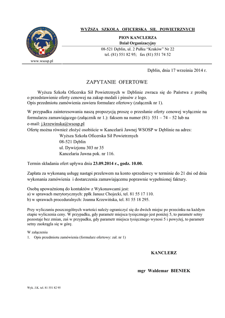 WYŻSZA SZKOŁA OFICERSKA SIŁ POWIETRZNYCH PION KANCLERZA Dział Organizacyjny 08-521 Dęblin, ul. 2 Pułku “Kraków” Nr 22 tel. (81) 551 82 95; fax (81) 551 74 52 www.wsosp.pl Dęblin, dnia 17 września 2014 r. ZAPYTANIE OFERTOWE Wyższa Szkoła Oficerska Sił Powietrznych w Dęblinie zwraca się do Państwa z prośbą o przedstawienie oferty cenowej na zakup medali i pinsów z logo. Opis przedmiotu zamówienia zawiera formularz ofertowy (załącznik nr 1). W przypadku zainteresowania naszą propozycją proszę o przesłanie oferty cenowej wyłącznie na formularzu zamawiającego (załącznik nr 1.): faksem na numer (81) 551 – 74 – 52 lub na e-mail: [email protected] Ofertę można również złożyć osobiście w Kancelarii Jawnej WSOSP w Dęblinie na adres: Wyższa Szkoła Oficerska Sił Powietrznych 08-521 Dęblin ul. Dywizjonu 303 nr 35 Kancelaria Jawna pok. nr 116. Termin składania ofert upływa dnia 23.09.2014 r., godz. 10.00. Zapłata za wykonaną usługę nastąpi przelewem na konto sprzedawcy w terminie do 21 dni od dnia wykonania zamówienia i dostarczenia zamawiającemu poprawnie wypełnionej faktury. Osobą upoważnioną do kontaktów z Wykonawcami jest: a) w sprawach merytorycznych: ppłk Janusz Chojecki, tel. 81 55 17 110. b) w sprawach proceduralnych: Joanna Krzewińska, tel. 81 55 18 295. Przy wyliczaniu poszczególnych wartości należy ograniczyć się do dwóch miejsc po przecinku na każdym etapie wyliczenia ceny. W przypadku, gdy parametr miejsca tysięcznego jest poniżej 5, to parametr setny pozostaje bez zmian, zaś w przypadku, gdy parametr miejsca tysięcznego wynosi 5 i powyżej, to parametr setny zaokrągla się w górę. W załączeniu 1. Opis przedmiotu zamówienia (formularz ofertowy: zał. nr 1) KANCLERZ mgr Waldemar BIENIEK Wyk. J.K. tel. 81 551 82 95 Załącznik nr 1 FORMULARZ OFERTOWY W odpowiedzi na zapytanie składamy ofertę. Szczegółowy opis przedmiotu zamówienia Przedmiotem zamówienia jest: zakup medali okolicznościowych dwustronnych w etui i znaczków (pins) z logo Klubu Uczelnianego WSOSP. Medal w etui dwustronny śr. 50 mm, z logo „KU WSOSP” 40 sztuk Znaczek (pins) śr. 30 mm, z logo „KU WSOSP” 100 szt. Ilość szt. L.p. Nazwa przedmiotu 1. Medal 40 2. Znaczek (pins) 100 Cena jednostkowa netto zł RAZEM Wartość netto (zł) VAT % Kwota VAT (zł) Wartość zamówienia brutto (zł) - Termin dostawy: do 25 września 2014 r. Koszt dostawy po stronie wykonawcy: wliczony w cenę towaru. Dostawa jednorazowa. Termin płatności: płatność w ciągu 21 dni od daty otrzymania faktury. Zobowiązuję się wykonać usługę zgodnie z umową i/lub formularzem ofertowym. Wykonawca: .............................................................................................................................. Siedziba/adres:..................................................................................................................................... ................................................................................................................................................ Nr telefonu:...................................................... Nr NIP: ........................................................ ……………………………….…… Miejscowość , data Nr faksu: …................................................... Nr REGON: ................................................... …………………………….. Podpis i pieczęć Wykonawcy