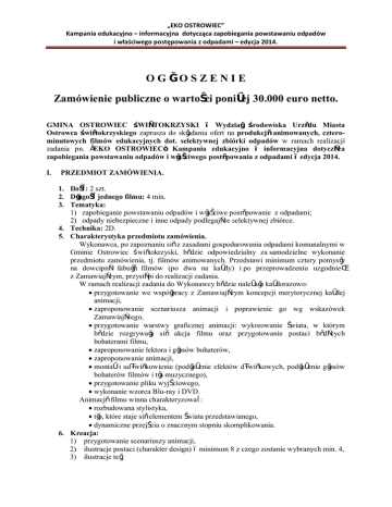 „EKO OSTROWIEC” Kampania edukacyjno – informacyjna dotycząca zapobiegania powstawaniu odpadów i właściwego postępowania z odpadami – edycja 2014. OGŁOSZENIE Zamówienie publiczne o wartości poniżej 30.000 euro netto. GMINA OSTROWIEC ŚWIĘTOKRZYSKI – Wydział Środowiska Urzędu Miasta Ostrowca Świętokrzyskiego zaprasza do składania ofert na produkcję animowanych, czterominutowych filmów edukacyjnych dot. selektywnej zbiórki odpadów w ramach realizacji zadania pn. „EKO OSTROWIEC” Kampania edukacyjno – informacyjna dotycząca zapobiegania powstawaniu odpadów i właściwego postępowania z odpadami – edycja 2014. I. PRZEDMIOT ZAMÓWIENIA. 1. Ilość: 2 szt. 2. Długość jednego filmu: 4 min. 3. Tematyka: 1) zapobieganie powstawaniu odpadów i właściwe postępowanie z odpadami; 2) odpady niebezpieczne i inne odpady podlegające selektywnej zbiórce. 4. Technika: 2D. 5. Charakterystyka przedmiotu zamówienia. Wykonawca, po zapoznaniu się z zasadami gospodarowania odpadami komunalnymi w Gminie Ostrowiec Świętokrzyski, będzie odpowiedzialny za samodzielne wykonanie przedmiotu zamówienia, tj. filmów animowanych. Przedstawi minimum cztery pomysły na dowcipną fabułę filmów (po dwa na każdy) i po przeprowadzeniu uzgodnień z Zamawiającym, przystąpi do realizacji zadania. W ramach realizacji zadania do Wykonawcy będzie należało każdorazowo: · przygotowanie we współpracy z Zamawiającym koncepcji merytorycznej każdej animacji, · zaproponowanie scenariusza animacji i poprawienie go wg wskazówek Zamawiającego, · przygotowanie warstwy graficznej animacji: wykreowanie świata, w którym będzie rozgrywała się akcja filmu oraz przygotowanie postaci będących bohaterami filmu, · zaproponowanie lektora i głosów bohaterów, · zaproponowanie animacji, · montaż i udźwiękowienie (podłożenie efektów dźwiękowych, podłożenie głosów bohaterów filmów i tła muzycznego), · przygotowanie pliku wyjściowego, · wykonanie wzorca Blu-ray i DVD. Animację filmu winna charakteryzować: · rozbudowana stylistyka, · tło, które staje się elementem świata przedstawianego, · dynamiczne przejścia o znacznym stopniu skomplikowania. 6. Kreacja: 1) przygotowanie scenariuszy animacji, 2) ilustracje postaci (charakter design) – minimum 8 z czego zostanie wybranych min. 4, 3) ilustracje teł, 4) przygotowanie scenorysów (storyboardów). 7. Animacja: 1) przygotowanie animatici (animowany storyboard), 2) animacja postaci, 3) animacja teł, 4) motion design, 5) composting, 6) rendering. 8. Udźwiękowienie: 1) studio dźwiękowe, 2) lektor i aktorzy, 3) warstwa muzyczna. 9. Montaż materiałów. 10. Produkcja i nadzór produkcyjny. 11. Specyfikacja video: 1) rozdzielczość: 320x240p, 640x480p, 720x576p, 1920x1080p (Full HD, kodowanie H.264), 2) formaty: MPEG, MPEG-2, AVI, 3GPP. 12. Prawa autorskie: 1) internet, 2) telewizja, 3) outdoor. 13. Filmy muszą ponadto zawierać następujące elementy: 1) podpisany herb Ostrowca Świętokrzyskiego, 2) logo WFOŚiGW – standardowym tłem dla logo jest kolor biały, przy czym dopuszcza się w uzasadnionych przypadkach stosowanie innego koloru tła niż biały, 3) informację o źródle finansowania w brzmieniu: „Dofinansowano ze środków Wojewódzkiego Funduszu Ochrony Środowiska i Gospodarki Wodnej w Kielcach” – rodzaj czcionki: Arial, kolor: czarny. Na stronie internetowej Funduszu (www.wfos.com.pl) dostępne są wzory logo WFOŚiGW wraz z informacją o źródle finansowania. 14. Dostarczenie przedmiotu zamówienia: 18 lipca 2014 r. II. WYMAGANIA WOBEC WYKONAWCÓW. 1. 2. 3. 4. 5. 6. Wykonawca może uzyskać informacje dot. sporządzenia oferty w siedzibie Zamawiającego, tj. w Urzędzie Miasta w Ostrowcu Świętokrzyskim, ul. Jana Głogowskiego 3/5, pok. 301, tel. (041) 26 72 166. Całość prac musi być wykonana zgodnie z zapisami zawartymi w niniejszym ogłoszeniu oraz umową podpisaną z wybranym oferentem. Wzór umowy stanowi Załącznik nr 1 do niniejszego ogłoszenia. Wykonawca jest odpowiedzialny za jakość wykonania przedmiotu zamówienia. O udzielenie zamówienia mogą ubiegać się Wykonawcy, którzy nie podlegają wykluczeniu na podstawie art. 24 ust. 1, 2 oraz spełniają warunki określone w art. 22 ust. 1 Pzp. Ocena spełnienia warunków uczestniczenia w postępowaniu dokonana zostanie w oparciu o informacje zawarte w dokumentach i oświadczeniach. Oświadczenia i dokumenty, jakie mają być dostarczone przez Wykonawcę w celu potwierdzenia spełniania warunków udziału w postępowaniu: 1) oświadczenie, że Wykonawca spełnia warunki określone w art. 22 ust. 1 ustawy Pzp; 2) w celu potwierdzenia, że Wykonawca posiada uprawnienie do wykonywania określonej działalności lub czynności oraz nie podlega wykluczeniu na podstawie art. 24 ustawy Pzp, Zamawiający żąda złożenia aktualnego odpisu z właściwego rejestru lub aktualne 2 7. zaświadczenie o wpisie do ewidencji działalności gospodarczej, jeżeli odrębne przepisy wymagają wpisu do rejestru lub zgłoszenia do ewidencji działalności gospodarczej, wystawionego nie wcześniej niż 6 miesięcy przed upływem terminu składania ofert; 3) proponowaną cenę netto i brutto za realizację całego zamówienia, złożoną na formularzu wg załącznika nr 3. Rozpatrywane będą tylko oferty poniżej równowartości 30.000 euro netto. Po realizacji zamówienia Zamawiający dokona zapłaty na podstawie faktury wystawionej po uprzednim odbiorze przedmiotu zamówienia potwierdzonym protokołem odbioru podpisanym przez obie strony. III. MIEJSCE, TERMIN I SPOSÓB SKŁADANIA OFERT. Termin składania ofert upływa 4 czerwca 2014 r. o godz. 900. Oferty złożone po jego upływie nie będą rozpatrywane. 2. Sposób składania ofert: 1) dostarczenie osobiste: Urząd Miasta w Ostrowcu Świętokrzyskim Biuro Obsługi Interesanta stanowisko nr 14 2) oferty listowne kierowane na adres: Urząd Miasta w Ostrowcu Świętokrzyskim Wydzi