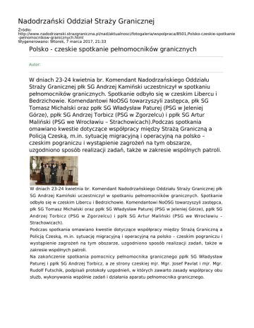 Nadodrzański Oddział Straży Granicznej Źródło: http://www.nadodrzanski.strazgraniczna.pl/nad/aktualnosci/fotogaleria/wspolpraca/8501,Polsko-czeskie-spotkanie -pelnomocnikow-granicznych.html Wygenerowano: Wtorek, 7 marca 2017, 21:33 Polsko - czeskie spotkanie pełnomocników granicznych Autor: W dniach 23-24 kwietnia br. Komendant Nadodrzańskiego Oddziału Straży Granicznej płk SG Andrzej Kamiński uczestniczył w spotkaniu pełnomocników granicznych. Spotkanie odbyło się w czeskim Libercu i Bedrzichowie. Komendantowi NoOSG towarzyszyli zastępca, płk SG Tomasz Michalski oraz ppłk SG Władysław Paturej (PSG w Jeleniej Górze), ppłk SG Andrzej Torbicz (PSG w Zgorzelcu) i ppłk SG Artur Maliński (PSG we Wrocławiu – Strachowicach).Podczas spotkania omawiano kwestie dotyczące współpracy między Strażą Graniczną a Policją Czeską, m.in. sytuację migracyjną i operacyjną na polsko – czeskim pograniczu i wystąpienie zagrożeń na tym obszarze, uzgodniono sposób realizacji zadań, także w zakresie wspólnych patroli. W dniach 23-24 kwietnia br. Komendant Nadodrzańskiego Oddziału Straży Granicznej płk SG Andrzej Kamiński uczestniczył w spotkaniu pełnomocników granicznych. Spotkanie odbyło się w czeskim Libercu i Bedrzichowie. Komendantowi NoOSG towarzyszyli zastępca, płk SG Tomasz Michalski oraz ppłk SG Władysław Paturej (PSG w Jeleniej Górze), ppłk SG Andrzej Torbicz (PSG w Zgorzelcu) i ppłk SG Artur Maliński (PSG we Wrocławiu – Strachowicach). Podczas spotkania omawiano kwestie dotyczące współpracy między Strażą Graniczną a Policją Czeską, m.in. sytuację migracyjną i operacyjną na polsko – czeskim pograniczu i wystąpienie zagrożeń na tym obszarze, uzgodniono sposób realizacji zadań, także w zakresie wspólnych patroli. Na zakończenie spotkania pomocnicy pełnomocnika granicznego ppłk SG Władysław Paturej i ppłk SG Andrzej Torbicz, a ze strony czeskiej mjr. Mgr. Josef Pavlat i mjr. Mgr. Rudolf Futschik, podpisali protokoły uzgodnień, w których zawarto zasady współpracy obu służb, wykonywania wspólnie zadań i działania aparatu pełnomocnika granicznego.
