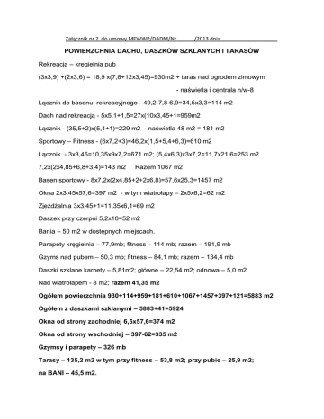 Załącznik nr 2 do umowy MFWWP/DADM/Nr .........../2013 dnia …………………………………. POWIERZCHNIA DACHU, DASZKÓW SZKLANYCH I TARASÓW Rekreacja – kręgielnia pub (3x3,9) +(2x3,6) = 18,9 x(7,8+12x3,45)=930m2 + taras nad ogrodem zimowym - naświetla i centrala n/w-8 Łącznik do basenu rekreacyjnego - 49,2-7,8-6,9=34,5x3,3=114 m2 Dach nad rekreacją - 5x5,1+1,5=27x(10x3,45+1=959m2 Łącznik - (35,5+2)x(5,1+1)=229 m2 - naświetla 48 m2 = 181 m2 Sportowy – Fitness - (6x7,2+3)=46,2x(1,5+5,4+6,3)=610 m2 Łącznik - 3x3,45=10,35x9x7,2=671 m2; (5,4x6,3)x3x7,2=11,7x21,6=253 m2 7,2x(2x4,85+6,8+3,4)=143 m2 Razem 1067 m2 Basen sportowy - 8x7,2x(2x4,85+2+2x6,8)=57,6x25,3=1457 m2 Okna 2x3,45x57,6=397 m2 - w tym wiatrołapy – 2x5x6,2=62 m2 Zjeżdżalnia 3x3,45+1=11,35x6,1=69 m2 Daszek przy czerpni 5,2x10=52 m2 Bania – 50 m2 w dostępnych miejscach. Parapety kręgielnia – 77,9mb; fitness – 114 mb; razem – 191,9 mb Gzyms nad pubem – 50,3 mb; fitness – 84,1 mb; razem – 134,4 mb Daszki szklane karnety – 5,81m2; główne – 22,54 m2; odnowa – 5,0 m2 Nad wiatrołapem - 8 m2; razem 41,35 m2 Ogółem powierzchnia 930+114+959+181+610+1067+1457+397+121=5883 m2 Ogółem z daszkami szklanymi – 5883+41=5924 Okna od strony zachodniej 6,5x57,6=374 m2 Okna od strony wschodniej – 397-62=335 m2 Gzymsy i parapety – 326 mb Tarasy – 135,2 m2 w tym przy fitness – 53,8 m2; przy pubie – 25,9 m2; na BANI – 45,5 m2.