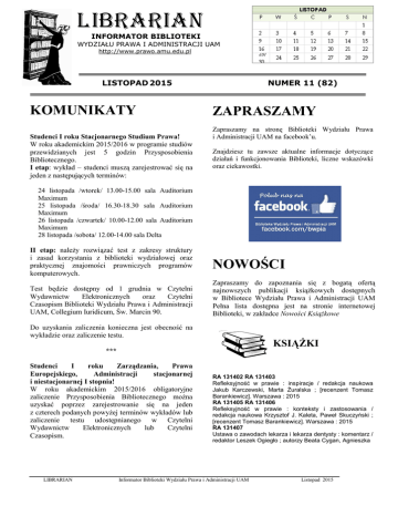 LIBRARIAN INFORMATOR BIBLIOTEKI WYDZIAŁU PRAWA I ADMINISTRACJI UAM http://www.prawo.amu.edu.pl LISTOPAD 2015 KOMUNIKATY Studenci I roku Stacjonarnego Studium Prawa! W roku akademickim 2015/2016 w programie studiów przewidzianych jest 5 godzin Przysposobienia Bibliotecznego. I etap: wykład – studenci muszą zarejestrować się na jeden z następujących terminów: NUMER 11 (82) ZAPRASZAMY Zapraszamy na stronę Biblioteki Wydziału Prawa i Administracji UAM na facebook’u. Znajdziesz tu zawsze aktualne informacje dotyczące działań i funkcjonowania Biblioteki, liczne wskazówki oraz ciekawostki. 24 listopada /wtorek/ 13.00-15.00 sala Auditorium Maximum 25 listopada /środa/ 16.30-18.30 sala Auditorium Maximum 26 listopada /czwartek/ 10.00-12.00 sala Auditorium Maximum 28 listopada /sobota/ 12.00-14.00 sala Delta II etap: należy rozwiązać test z zakresy struktury i zasad korzystania z biblioteki wydziałowej oraz praktycznej znajomości prawniczych programów komputerowych. NOWOŚCI Test będzie dostępny od 1 grudnia w Czytelni Wydawnictw Elektronicznych oraz Czytelni Czasopism Biblioteki Wydziału Prawa i Administracji UAM, Collegium Iuridicum, Św. Marcin 90. Zapraszamy do zapoznania się z bogatą ofertą najnowszych publikacji książkowych dostępnych w Bibliotece Wydziału Prawa i Administracji UAM Pełna lista dostępna jest na stronie internetowej Biblioteki, w zakładce Nowości Książkowe Do uzyskania zaliczenia konieczna jest obecność na wykładzie oraz zaliczenie testu. KSIĄŻKI *** Studenci I roku Zarządzania, Prawa Europejskiego, Administracji stacjonarnej i niestacjonarnej I stopnia! W roku akademickim 2015/2016 obligatoryjne zaliczenie Przysposobienia Bibliotecznego można uzyskać poprzez zarejestrowanie się na jeden z czterech podanych powyżej terminów wykładów lub zaliczenie testu udostępnianego w Czytelni Wydawnictw Elektronicznych lub Czytelni Czasopism. LIBRARIAN RA 131402 RA 131403 Refleksyjność w prawie : inspiracje / redakcja naukowa Jakub Karczewski, Marta Żuralska ; [recenzent Tomasz Barankiewicz]. Warszawa : 2015 RA 131405 RA 131406 Refleksyjność w prawie : konteksty i zastosowania / redakcja naukowa Krzysztof J. Kaleta, Paweł Skuczyński ; [recenzent Tomasz Barankiewicz]. Warszawa : 2015 RA 131407 Ustawa o zawodach lekarza i lekarza dentysty : komentarz / redaktor Leszek Ogiegło ; autorzy Beata Cygan, Agnieszka Informator Biblioteki Wydziału Prawa i Administracji UAM Listopad 2015 Dyszlewska-Tarnawska, Leszek Ogiegło, Gabriela Rączka, Kazimierz Zgryzek. Warszawa : 2015 - 2. wyd., zm. RA 131408 Umowy, pisma i pisma procesowe w sprawach handlowych : z objaśnieniami i płytą CD / Robert Pabis. Warszawa : 2015 - 2. wyd. RA 131409 Kodeks spółek handlowych : orzecznictwo / Aleksandra Gawrysiak-Zabłocka, Ewa Skibińska. Warszawa : 2015 3. wyd. RA 131410 Problemy prawne na styku sportu i medycyny / redaktorzy Teresa Gardocka, Dariusz Jagiełło. Warszawa : 2015 RA 131411 Prawo pracy i ubezpieczeń społecznych w pytaniach i odpowiedziach / B. Dziliński, K. Dzilińska. Warszawa : 2015 - 2. wyd., stan prawny: sierpień 2015 r. RA 131412 RA 131413 Prawo spadkowe / redaktor Bogudar Kordasiewicz ; autorzy Witold Borysiak, Agnieszka Kawałko, Michał Kłos, Bogurad Kordasiewicz, Józef Kremis, Maksymilian Pazdan, Józef S. Piątowski, Elżbieta Skowrońska-Bocian, Jacek Wierciński, Hanna Witczak, Sylwester Wójcik, Fryderyk Zoll. Warszawa : 2015 - 3. wyd. zm. i uzup. RA 131414 Polish financial system in the age of financialisation / Alfred Janc, Michał Jurek, Paweł Marszałek. Warszawa : 2015 RA 131415 RA 131416 Skarga pauliańska : ochrona wierzyciela w razie niewypłacalności dłużnika : komentarz do art. 527-534 KC i przepisów powiązanych (KRO, PrUpad, KPC, KK) / Maria Jasińska. Warszawa : 2015 - 2. wyd. RA 131417 Zbiór Zasad Etyki Adwokackiej i Godności Zawodu : komentarz / Jerzy Naumann ; [przekład Ewa Stawicka]. Warszawa : 2015 - 2. wyd. RA 131418 Prawo pracy dla sędziów i pełnomocników / [redakcja] Walczak, Wojewódka ; autorzy M. Chakowski, P. Ciszek, A. Dobrenko, i in. Warszawa : 2015 - Stan prawny na 1.9.2015 r. z uwaględnieniem zmian wchodzących w życie w 2016 r. RA 131419 RA 131420 Pozycja prawna arbitra w arbitrażu handlowym / Marcin Asłanowicz. Warszawa : 2015 RA 131421 RA 131422 Dowody i postępowanie dowodowe w procesie karnym : komentarz praktyczny z orzecznictwem : wzory pism procesowych / autorzy: Michał Błoński, Monika Zbrojewska ; (redaktor) Piotr Kruszyński. Warszawa : 2015 - Zawiera zmiany obowiązujące od 1 lipca 2015 r. RA 131423 Ochrona dziedzictwa kulturowego i naturalnego : perspektywa prawna i kryminologiczna / redaktorzy Wiesław Pływaczewski, Bartłomiej Gadecki. Warszawa : 2015 RA 131424 RA 131425 Kontrola pracownika przez pracodawcę / Magdalena StępakMiczek. Warszawa : 2015 RA 131426 Zamówienia publiczne : akty wykonawcze : komentarz / Jerzy Pieróg (redaktor), Marzena Jaworska, Joanna PreszKról. Warszawa : 2015 RA 131427 RA 131428 RA 131429 Własność intelektualna w obrocie elektronicznym / redakcja naukowa Marian Kępiński ; redaktorzy tomu: Jakub Kępiński, Katarzyna Klafkowska-Waśniowska, Rafał Sikorski ; autorzy: Witold Chomiczewski, Krzysztof Felchner, Alicja Gniewek, Jakub Kępiński, Katarzyna Klafkowska-Waśniowska, Bartosz Kleban, Dominik Lubasz, Monika Namysłowska, Igor B. Nestoruk, Warszawa : 2015 LIBRARIAN RA 131430 Uprawnienia akcjonariuszy polskich spółek publicznych w świetle dyrektywy 2007/36/WE / Jakub Jan Zięty. Warszawa : 2015 RA 131431 RA 131432 Ochrona tajemnicy przedsiębiorstwa w prawie karnym materialnym i procesowym / Szymon Pawelec. Warszawa : 2015 RA 131433 Apelacje cywilne i karne : 69 wzorów pism z omówieniami / Stefan Jaworski. Warszawa : 2015 - 4. wyd. RA 131434 Apelacje karne : zagadnienia praktyczne, akta i kazusy / [Zbigniew Kapiński]. Warszawa : 2015 - 3. wydanie, stan prawny: wrzesień 2015 r. RA 131435 Odpowiedzialność sp