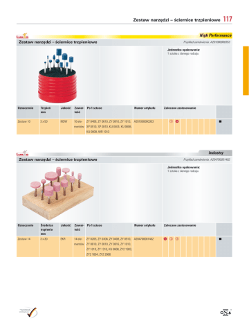 Zestaw narzędzi – ściernice trzpieniowe 117 High Performance Zestaw narzędzi – ściernice trzpieniowe Przykład zamówienia: A201000000353 Jednostka opakowania: 1 sztuka z danego rodzaju Oznaczenie bTrzpień bmm b bJakość bZawar- bPo 1 sztuce b btość b b b b Zestaw 10 a3 x 50 aNDW a10 ele- aZY 0408, ZY 0610, ZY 0810, ZY 1013, aA201000000353 a a햳 a� a a a a a a a ■ a a amentów aSP 0510, SP 0810, KU 0404, KU 0606, a a a a a a a a a a a a a a a a a a a a a a a a aKU 0808, WR 1013 bNumer artykułu b b a bZalecane zastosowanie b b b b b Industry Zestaw narzędzi – ściernice trzpieniowe Przykład zamówienia: A204700001402 Jednostka opakowania: 1 sztuka z danego rodzaju Oznaczenie bŚrednica btrzpienia bmm bJakość bZawar- bPo 1 sztuce b btość b b b b bNumer artykułu b b Zestaw 14 a3 x 30 aEKR a14 ele- aZY 0205, ZY 0306, ZY 0408, ZY 0510, aA204700001402 a� a햳 a햴 a a a a a a a ■ a a amentów aZY 0610, ZY 0810, ZY 0816, ZY 1010, a a a a a a a a a a a a a a aZY 1013, ZY 1313, KU 0808, ZY2 1303, a a a a a a a a a a a a a a aZY2 1604, ZY2 2006 a a a a a a a a a a a bZalecane zastosowanie b b b b b Warunki składania ofert, dostawy i płatności Stan: sierpień 2008 1. Poniższe warunki są ostateczne i stanowią część składową umowy. Obowiązują one w stosunku do wszystkich (także przyszłych) umów i innych usług. Podstawą wszystkich ofert są wyłącznie nasze warunki; uznaje się je za obowiązujące w momencie udzielenia zlecenia lub przyjęcia dostawy. Warunki zamawiającego, które są sprzeczne lub różnią się od naszych warunków umowy, nie są dla nas zobowiązujące, także wtedy, gdy po ich otrzymaniu ponownie nie wyraziliśmy naszego wyraźnego sprzeciwu. 2. Nie ma żadnych dodatkowych uzgodnień ustnych. Dodatkowe uzgodnienia, odstępstwa lub zmiany stają się wiążące dopiero po naszym pisemnym potwierdzeniu. Dotyczy to przede wszystkim uzgodnień dotyczących właściwości wyrobów. 3. Niniejsze warunki obowiązują wyłącznie w stosunku do przedsiębiorstw lub osób prawnych prawa publicznego lub publiczno-prawnego majątku odrębnego. 7. Nasze oferty nie są zobowiązujące. Dokumentacja należąca do oferty, jak np. rysunki, ilustracje, dane techniczne, powoływanie się na normy oraz dane w prospektach, nie stanowi uzgodnień dotyczących właściwości, chyba że zostanie to określone wyraźnie i na piśmie. 2. Nasze wzory, próbki, dane na temat składu i właściwości naszych wyrobów są oparte na naszych doświadczeniach i specjalistycznej wiedzy, nie stanowią jednak żadnej gwarancji ani innych wiążących zapewnień. 3. Do prospektów, ilustracji, rysunków, szkiców i innych dokumentów zastrzegamy sobie prawo własności i prawa autorskie; bez naszej zgody nie wolno ich powielać, kopiować z Internetu lub udostępniać osobom trzecim, a na nasze żądanie należy je nam niezwłocznie odesłać. 2. 3. III. Zawieranie umów 1. Uznaje się, że zlecenie zostało przyjęte, gdy zostanie przez nas potwierdzone na piśmie lub gdy zrealizowano dostawę. 2. Potwierdzenie zlecenia stanowi podstawę treści i zakresu zlecenia. Uzupełnienia, zmiany lub ustne porozumienia wymagają dla swojej ważności naszego pisemnego potwierdzenia. 3. Zamawiający ponosi odpowiedzialność za prawidłowość dostarczanych przez niego dokumentów takich jak rysunki, wzory itp. Ustne dane na temat wymiarów itp. wymagają pisemnego potwierdzenia. IV. Ceny 1. 2. Nasze ceny są cenami w EURO z zakładu w Engelskirchen, z wyłączeniem opakowania, opłat przewozowych, porto, opłat celnych i ubezpieczenia. Narzuty i rabaty naliczane są zawsze od ceny podstawowej. To samo dotyczy przesyłek częściowych lub ekspresowych przygotowanych na życzenie Zamawiającego. Minimalna wartość zlecenia wynosi 130,- € netto. Przy zleceniach poniżej 130,- € naliczamy opłatę manipulacyjną w wysokości 15,- €. 3. Do ceny doliczany jest podatek VAT w aktualnie obowiązującej ustawowej wysokości. 4. W przypadku dostawy do 4 miesięcy obowiązują ceny z dnia potwierdzenia zlecenia; w przypadku dłuższych terminów dostawy obowiązywać będą ceny obowiązujące w dniu dostawy, jeśli zmianie ulegną nasze koszty własne, takie jak koszty materiałowe, płacowe lub inne koszty produkcji. 2. Nasze faktury są płatne w terminie 14 dni od daty wystawienia faktury z uwzględnieniem skonta w wysokości 2 % lub w terminie 30 dni netto. Płatność musi być zrealizowana w taki sposób, aby należna nam kwota była do naszej dyspozycji najpóźniej w dniu wymagalności. Mamy prawo do realizacji części dostawy w możliwym ze względu na okoliczności zakresie. Pierwsze dostawy realizujemy zasadniczo za zapłatą z góry lub za pobraniem. 4. Weksle (przyjęcie wyłącznie po pisemnym uzgodnieniu) i czeki przyjmujemy wyłącznie w celu realizacji zobowiązania. Opłaty dyskontowe i za ściągnięcie należności obciążają Zamawiającego. Nie ponosimy żadnej odpowiedzialności za terminowe przedłożenie. 5. W przypadku uzyskania informacji o przyczynach dających uzasadnione wątpliwości co do dalszej możliwości wywiązywania się przez Zamawiającego z terminowych płatności, np. o złożeniu wniosku o wszczęcie postępowania upadłościowego, mającym nastąpić wkrótce wstrzymaniu płatności lub innym znacznym pogorszeniu się sytuacji majątkowej Zamawiającego, mamy prawo wstrzymać nie zrealizowane dostawy. W takim przypadku możemy, nie zważając na fakt przyjęcia czeków, zażądać natychmiastowej zapłaty pozostałej kwoty i wyznaczyć Zamawiającemu odpowiedni termin wykonania świadczenia „z ręki do ręki” lub po przedłożeniu zabezpieczenia płatności, a po bezskutecznym upływie tego terminu, odstąpić od dalszego wypełniania naszych umownych zobowiązań. Wniosek o wszczęcie postępowania upadłościowego z majątku Zamawiającego upoważnia nas do natychmiastowego odstąpienia od umowy. Nie zwalnia to Zamawiającego 