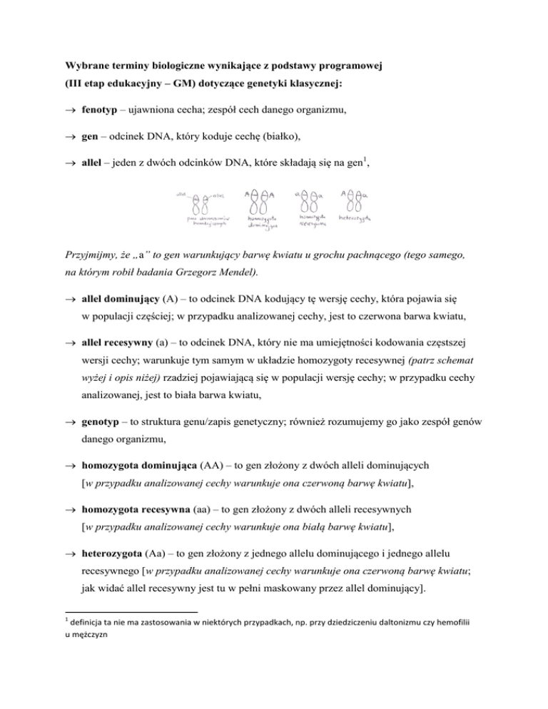 Wybrane terminy biologiczne wynikające z podstawy programowej (III etap edukacyjny – GM) dotyczące genetyki klasycznej: fenotyp – ujawniona cecha; zespół cech danego organizmu, gen – odcinek DNA, który koduje cechę (białko), allel – jeden z dwóch odcinków DNA, które składają się na gen1, Przyjmijmy, że „a” to gen warunkujący barwę kwiatu u grochu pachnącego (tego samego, na którym robił badania Grzegorz Mendel). allel dominujący (A) – to odcinek DNA kodujący tę wersję cechy, która pojawia się w populacji częściej; w przypadku analizowanej cechy, jest to czerwona barwa kwiatu, allel recesywny (a) – to odcinek DNA, który nie ma umiejętności kodowania częstszej wersji cechy; warunkuje tym samym w układzie homozygoty recesywnej (patrz schemat wyżej i opis niżej) rzadziej pojawiającą się w populacji wersję cechy; w przypadku cechy analizowanej, jest to biała barwa kwiatu, genotyp – to struktura genu/zapis genetyczny; również rozumujemy go jako zespół genów danego organizmu, homozygota dominująca (AA) – to gen złożony z dwóch alleli dominujących [w przypadku analizowanej cechy warunkuje ona czerwoną barwę kwiatu], homozygota recesywna (aa) – to gen złożony z dwóch alleli recesywnych [w przypadku analizowanej cechy warunkuje ona białą barwę kwiatu], heterozygota (Aa) – to gen złożony z jednego allelu dominującego i jednego allelu recesywnego [w przypadku analizowanej cechy warunkuje ona czerwoną barwę kwiatu; jak widać allel recesywny jest tu w pełni maskowany przez allel dominujący]. 1 definicja ta nie ma zastosowania w niektórych przypadkach, np. przy dziedziczeniu daltonizmu czy hemofilii u mężczyzn