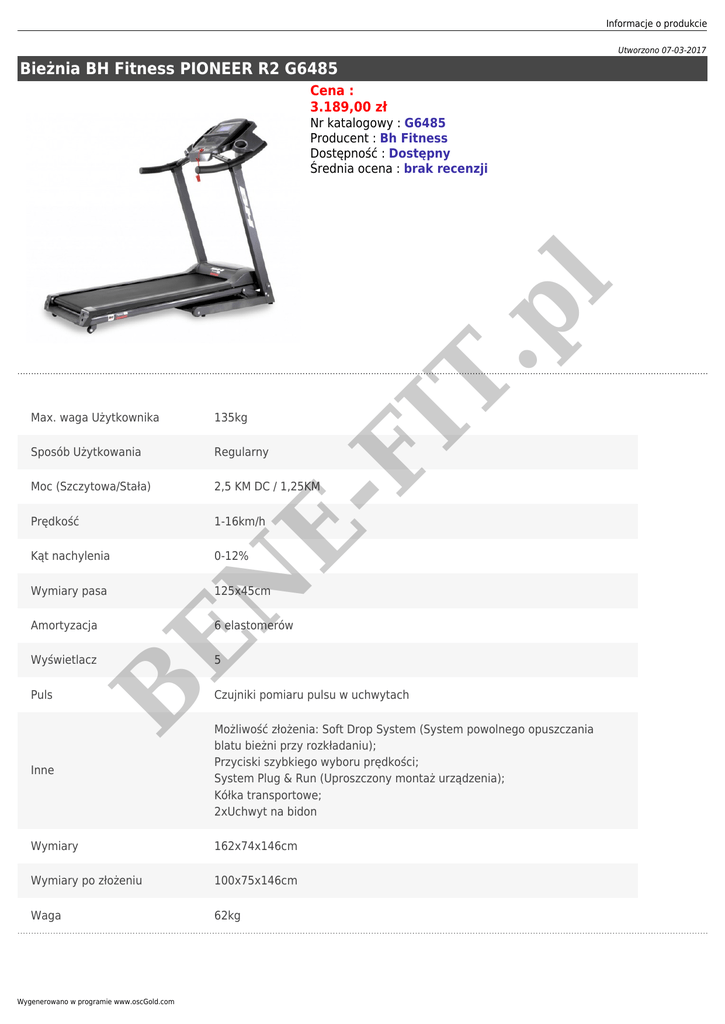 Informacje o produkcie Utworzono 07-03-2017 Bieżnia BH Fitness PIONEER R2 G6485 Cena : 3.189,00 zł FI T .p l Nr katalogowy : G6485 Producent : Bh Fitness Dostępność : Dostępny Średnia ocena : brak recenzji 135kg Sposób Użytkowania Regularny Moc (Szczytowa/Stała) 2,5 KM DC / 1,25KM B EN E- Max. waga Użytkownika Prędkość 1-16km/h Kąt nachylenia 0-12% Wymiary pasa 125x45cm Amortyzacja 6 elastomerów Wyświetlacz 5 Puls Czujniki pomiaru pulsu w uchwytach Inne Możliwość złożenia: Soft Drop System (System powolnego opuszczania blatu bieżni przy rozkładaniu); Przyciski szybkiego wyboru prędkości; System Plug & Run (Uproszczony montaż urządzenia); Kółka transportowe; 2xUchwyt na bidon Wymiary 162x74x146cm Wymiary po złożeniu 100x75x146cm Waga 62kg Wygenerowano w programie www.oscGold.com