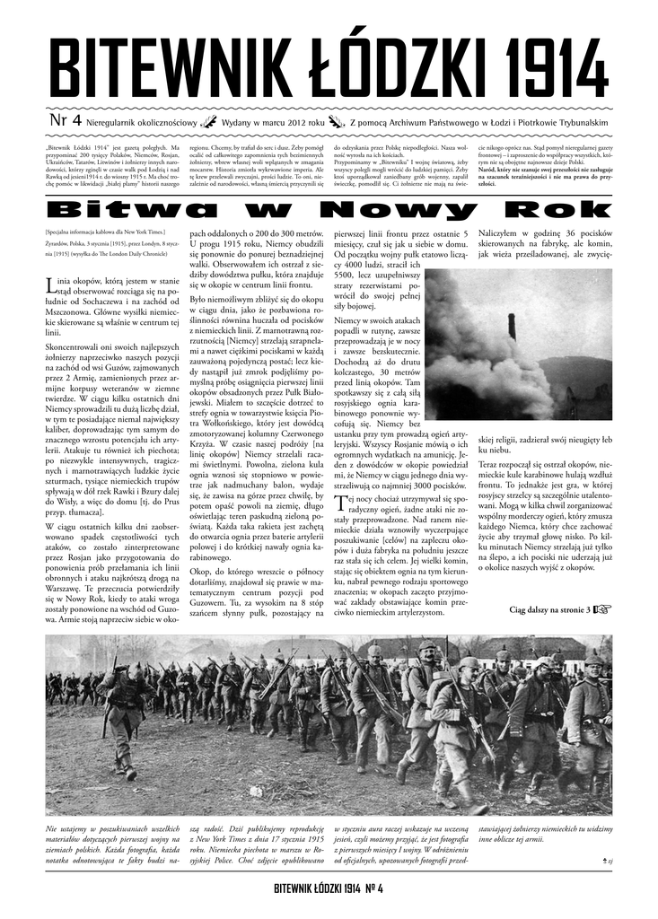 BITEWNIK ŁÓDZKI 1914 Nr 4 Nieregularnik okolicznościowy Wydany w marcu 2012 roku Z pomocą Archiwum Państwowego w Łodzi i Piotrkowie Trybunalskim „Bitewnik Łódzki 1914” jest gazetą poległych. Ma przypominać 200 tysięcy Polaków, Niemców, Rosjan, Ukraińców, Tatarów, Litwinów i żołnierzy innych narodowości, którzy zginęli w czasie walk pod Łodzią i nad Rawką od jesieni1914 r. do wiosny 1915 r. Ma choć trochę pomóc w likwidacji „białej plamy” historii naszego regionu. Chcemy, by trafiał do serc i dusz. Żeby pomógł ocalić od całkowitego zapomnienia tych bezimiennych żołnierzy, wbrew własnej woli wplątanych w zmagania mocarstw. Historia zmiotła wykrwawione imperia. Ale tę krew przelewali zwyczajni, prości ludzie. To oni, niezależnie od narodowości, własną śmiercią przyczynili się Bitwa [Specjalna informacja kablowa dla New York Times.] Żyrardów, Polska, 3 stycznia [1915], przez Londyn, 8 stycznia [1915] (wysyłka do The London Daily Chronicle) L inia okopów, którą jestem w stanie stąd obserwować rozciąga się na południe od Sochaczewa i na zachód od Mszczonowa. Główne wysiłki niemieckie skierowane są właśnie w centrum tej linii. Skoncentrowali oni swoich najlepszych żołnierzy naprzeciwko naszych pozycji na zachód od wsi Guzów, zajmowanych przez 2 Armię, zamienionych przez armijne korpusy weteranów w ziemne twierdze. W ciągu kilku ostatnich dni Niemcy sprowadzili tu dużą liczbę dział, w tym te posiadające niemal największy kaliber, doprowadzając tym samym do znacznego wzrostu potencjału ich artylerii. Atakuje tu również ich piechota; po niezwykle intensywnych, tragicznych i marnotrawiących ludzkie życie szturmach, tysiące niemieckich trupów spływają w dół rzek Rawki i Bzury dalej do Wisły, a więc do domu [tj. do Prus przyp. tłumacza]. W ciągu ostatnich kilku dni zaobserwowano spadek częstotliwości tych ataków, co zostało zinterpretowane przez Rosjan jako przygotowania do ponowienia prób przełamania ich linii obronnych i ataku najkrótszą drogą na Warszawę. Te przeczucia potwierdziły się w Nowy Rok, kiedy to ataki wroga zostały ponowione na wschód od Guzowa. Armie stoją naprzeciw siebie w oko- Nie ustajemy w poszukiwaniach wszelkich materiałów dotyczących pierwszej wojny na ziemiach polskich. Każda fotografia, każda notatka odnotowująca te fakty budzi na- w do odzyskania przez Polskę niepodległości. Nasza wolność wyrosła na ich kościach. Przypominamy w „Bitewniku” I wojnę światową, żeby wszyscy polegli mogli wrócić do ludzkiej pamięci. Żeby ktoś uporządkował zaniedbany grób wojenny, zapalił świeczkę, pomodlił się. Ci żołnierze nie mają na świe- Nowy pach oddalonych o 200 do 300 metrów. U progu 1915 roku, Niemcy obudzili się ponownie do ponurej beznadziejnej walki. Obserwowałem ich ostrzał z siedziby dowództwa pułku, która znajduje się w okopie w centrum linii frontu. Było niemożliwym zbliżyć się do okopu w ciągu dnia, jako że pozbawiona roślinności równina huczała od pocisków z niemieckich linii. Z marnotrawną rozrzutnością [Niemcy] strzelają szrapnelami a nawet ciężkimi pociskami w każdą zauważoną pojedynczą postać; lecz kiedy nastąpił już zmrok podjęliśmy pomyślną próbę osiągnięcia pierwszej linii okopów obsadzonych przez Pułk Białojewski. Miałem to szczęście dotrzeć to strefy ognia w towarzystwie księcia Piotra Wołkońskiego, który jest dowódcą zmotoryzowanej kolumny Czerwonego Krzyża. W czasie naszej podróży [na linię okopów] Niemcy strzelali racami świetlnymi. Powolna, zielona kula ognia wznosi się stopniowo w powietrze jak nadmuchany balon, wydaje się, że zawisa na górze przez chwilę, by potem opaść powoli na ziemię, długo oświetlając teren paskudną zieloną poświatą. Każda taka rakieta jest zachętą do otwarcia ognia przez baterie artylerii polowej i do krótkiej nawały ognia karabinowego. pierwszej linii frontu przez ostatnie 5 miesięcy, czuł się jak u siebie w domu. Od początku wojny pułk etatowo liczący 4000 ludzi, stracił ich 5500, lecz uzupełniwszy straty rezerwistami powrócił do swojej pełnej siły bojowej. Niemcy w swoich atakach popadli w rutynę, zawsze przeprowadzają je w nocy i zawsze bezskutecznie. Dochodzą aż do drutu kolczastego, 30 metrów przed linią okopów. Tam spotkawszy się z całą siłą rosyjskiego ognia karabinowego ponownie wycofują się. Niemcy bez ustanku przy tym prowadzą ogień artyleryjski. Wszyscy Rosjanie mówią o ich ogromnych wydatkach na amunicję. Jeden z dowódców w okopie powiedział mi, że Niemcy w ciągu jednego dnia wystrzeliwują co najmniej 3000 pocisków. T Okop, do którego wreszcie o północy dotarliśmy, znajdował się prawie w matematycznym centrum pozycji pod Guzowem. Tu, za wysokim na 8 stóp szańcem słynny pułk, pozostający na ej nocy chociaż utrzymywał się sporadyczny ogień, żadne ataki nie zostały przeprowadzone. Nad ranem niemieckie działa wznowiły wyczerpujące poszukiwanie [celów] na zapleczu okopów i duża fabryka na południu jeszcze raz stała się ich celem. Jej wielki komin, stając się obiektem ognia na tym kierunku, nabrał pewnego rodzaju sportowego znaczenia; w okopach zaczęto przyjmować zakłady obstawiające komin przeciwko niemieckim artylerzystom. szą radość. Dziś publikujemy reprodukcję z New York Times z dnia 17 stycznia 1915 roku. Niemiecka piechota w marszu w Rosyjskiej Polsce. Choć zdjęcie opublikowano w styczniu aura raczej wskazuje na wczesną jesień, czyli możemy przyjąć, że jest fotografia z pierwszych miesięcy I wojny. W odróżnieniu od oficjalnych, upozowanych fotografii przed- BITEWNIK ŁÓDZKI 1914 Nº 4 cie nikogo oprócz nas. Stąd pomysł nieregularnej gazety frontowej – i zaproszenie do współpracy wszystkich, którym nie są obojętne najnowsze dzieje Polski. Naród, który nie szanuje swej przeszłości nie zasługuje 
