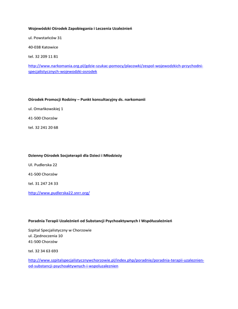 Wojewódzki Ośrodek Zapobiegania i Leczenia Uzależnień ul. Powstańców 31 40-038 Katowice tel. 32 209 11 81 http://www.narkomania.org.pl/gdzie-szukac-pomocy/placowki/zespol-wojewodzkich-przychodnispecjalistycznych-wojewodzki-osrodek Ośrodek Promocji Rodziny – Punkt konsultacyjny ds. narkomanii ul. Omańkowskiej 1 41-500 Chorzów tel. 32 241 20 68 Dzienny Ośrodek Socjoterapii dla Dzieci i Młodzieży Ul. Pudlerska 22 41-500 Chorzów tel. 31 247 24 33 http://www.pudlerska22.snrr.org/ Poradnia Terapii Uzależnień od Substancji Psychoaktywnych I Współuzależnień Szpital Specjalistyczny w Chorzowie ul. Zjednoczenia 10 41-500 Chorzów tel. 32 34 63 693 http://www.szpitalspecjalistycznywchorzowie.pl/index.php/poradnie/poradnia-terapii-uzaleznienod-substancji-psychoaktywnych-i-wspoluzaleznien Ośrodek Profilaktyki i Leczenia Uzależnień ul. Park Hutniczy 6 41-800 Zabrze tel. 32 278 11 99 http://www.opilu.pl/ Zakład Terapii Uzależnień i Współuzależnienia Al. Młodych 16 41-106 Siemianowice Śląskie tel. 32-765-41-38 http://www.uzaleznienia.siemianowice.pl