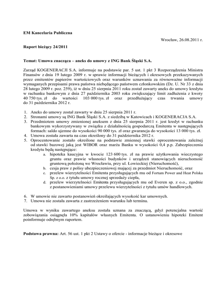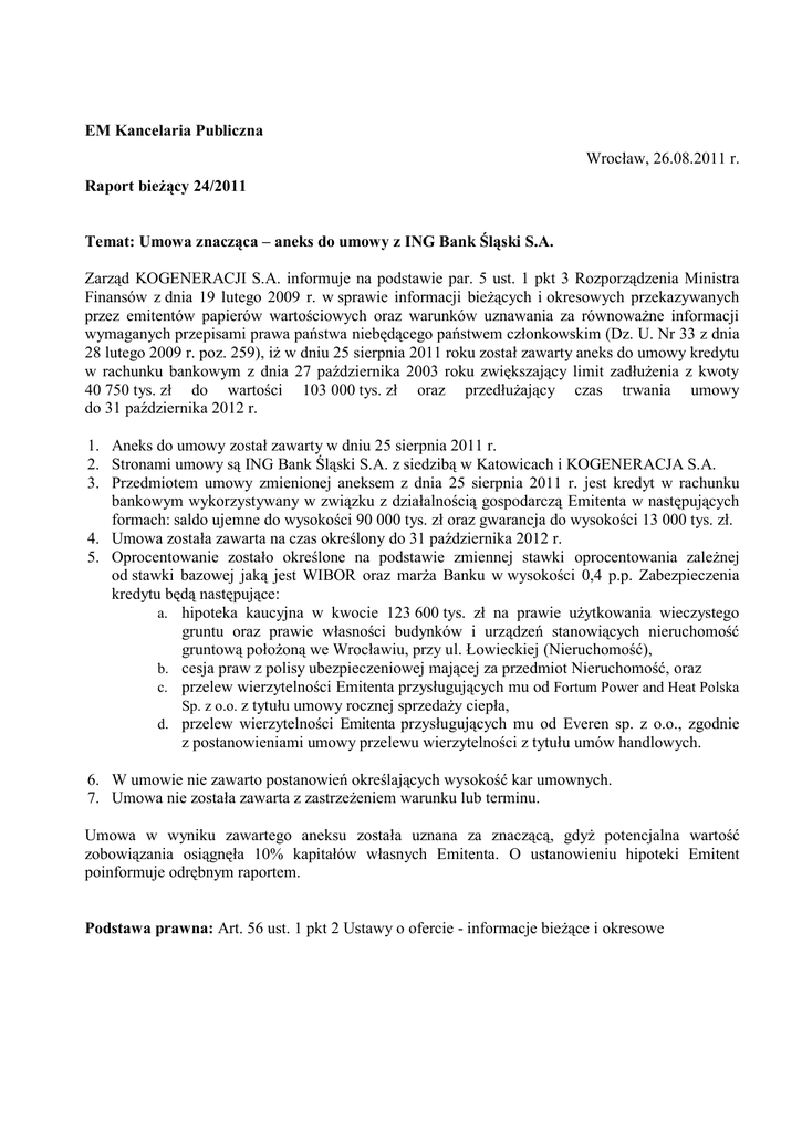 EM Kancelaria Publiczna Wrocław, 26.08.2011 r. Raport bieżący 24/2011 Temat: Umowa znacząca – aneks do umowy z ING Bank Śląski S.A. Zarząd KOGENERACJI S.A. informuje na podstawie par. 5 ust. 1 pkt 3 Rozporządzenia Ministra Finansów z dnia 19 lutego 2009 r. w sprawie informacji bieżących i okresowych przekazywanych przez emitentów papierów wartościowych oraz warunków uznawania za równoważne informacji wymaganych przepisami prawa państwa niebędącego państwem członkowskim (Dz. U. Nr 33 z dnia 28 lutego 2009 r. poz. 259), iż w dniu 25 sierpnia 2011 roku został zawarty aneks do umowy kredytu w rachunku bankowym z dnia 27 października 2003 roku zwiększający limit zadłużenia z kwoty 40 750 tys. zł do wartości 103 000 tys. zł oraz przedłużający czas trwania umowy do 31 października 2012 r. 1. Aneks do umowy został zawarty w dniu 25 sierpnia 2011 r. 2. Stronami umowy są ING Bank Śląski S.A. z siedzibą w Katowicach i KOGENERACJA S.A. 3. Przedmiotem umowy zmienionej aneksem z dnia 25 sierpnia 2011 r. jest kredyt w rachunku bankowym wykorzystywany w związku z działalnością gospodarczą Emitenta w następujących formach: saldo ujemne do wysokości 90 000 tys. zł oraz gwarancja do wysokości 13 000 tys. zł. 4. Umowa została zawarta na czas określony do 31 października 2012 r. 5. Oprocentowanie zostało określone na podstawie zmiennej stawki oprocentowania zależnej od stawki bazowej jaką jest WIBOR oraz marża Banku w wysokości 0,4 p.p. Zabezpieczenia kredytu będą następujące: a. hipoteka kaucyjna w kwocie 123 600 tys. zł na prawie użytkowania wieczystego gruntu oraz prawie własności budynków i urządzeń stanowiących nieruchomość gruntową położoną we Wrocławiu, przy ul. Łowieckiej (Nieruchomość), b. cesja praw z polisy ubezpieczeniowej mającej za przedmiot Nieruchomość, oraz c. przelew wierzytelności Emitenta przysługujących mu od Fortum Power and Heat Polska Sp. z o.o. z tytułu umowy rocznej sprzedaży ciepła, d. przelew wierzytelności Emitenta przysługujących mu od Everen sp. z o.o., zgodnie z postanowieniami umowy przelewu wierzytelności z tytułu umów handlowych. 6. W umowie nie zawarto postanowień określających wysokość kar umownych. 7. Umowa nie została zawarta z zastrzeżeniem warunku lub terminu. Umowa w wyniku zawartego aneksu została uznana za znaczącą, gdyż potencjalna wartość zobowiązania osiągnęła 10% kapitałów własnych Emitenta. O ustanowieniu hipoteki Emitent poinformuje odrębnym raportem. Podstawa prawna: Art. 56 ust. 1 pkt 2 Ustawy o ofercie - informacje bieżące i okresowe