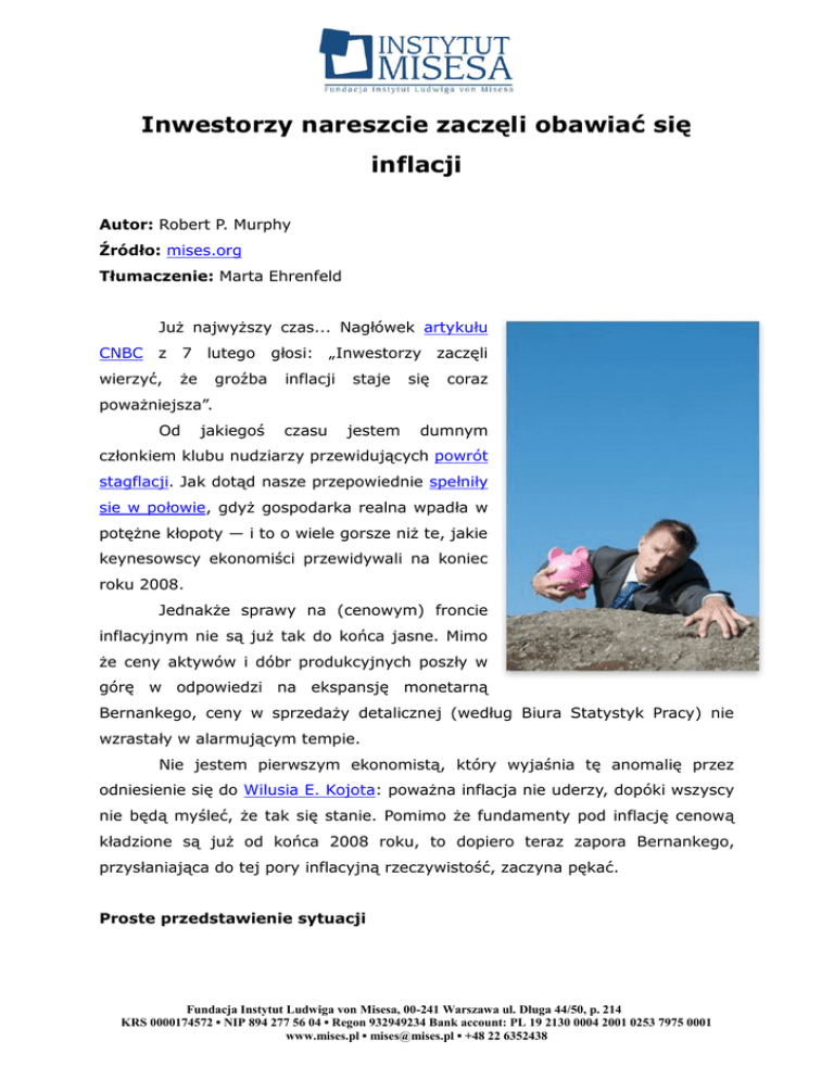 Inwestorzy nareszcie zaczęli obawiać się inflacji Autor: Robert P. Murphy Źródło: mises.org Tłumaczenie: Marta Ehrenfeld Już najwyższy czas... Nagłówek artykułu CNBC z 7 wierzyć, lutego że groźba głosi: „Inwestorzy zaczęli inflacji staje czasu jestem się coraz poważniejsza”. Od jakiegoś dumnym członkiem klubu nudziarzy przewidujących powrót stagflacji. Jak dotąd nasze przepowiednie spełniły sie w połowie, gdyż gospodarka realna wpadła w potężne kłopoty — i to o wiele gorsze niż te, jakie keynesowscy ekonomiści przewidywali na koniec roku 2008. Jednakże sprawy na (cenowym) froncie inflacyjnym nie są już tak do końca jasne. Mimo że ceny aktywów i dóbr produkcyjnych poszły w górę w odpowiedzi na ekspansję monetarną Bernankego, ceny w sprzedaży detalicznej (według Biura Statystyk Pracy) nie wzrastały w alarmującym tempie. Nie jestem pierwszym ekonomistą, który wyjaśnia tę anomalię przez odniesienie się do Wilusia E. Kojota: poważna inflacja nie uderzy, dopóki wszyscy nie będą myśleć, że tak się stanie. Pomimo że fundamenty pod inflację cenową kładzione są już od końca 2008 roku, to dopiero teraz zapora Bernankego, przysłaniająca do tej pory inflacyjną rzeczywistość, zaczyna pękać. Proste przedstawienie sytuacji Fundacja Instytut Ludwiga von Misesa, 00-241 Warszawa ul. Długa 44/50, p. 214 KRS 0000174572 ▪ NIP 894 277 56 04 ▪ Regon 932949234 Bank account: PL 19 2130 0004 2001 0253 7975 0001 www.mises.pl ▪ [email protected] ▪ +48 22 6352438 Może wydawać się to uproszczone, ale wciąż nie mogę oprzeć sie wrażeniu, iż poniższy wykres przedstawia to, co rzeczywiście powinniśmy wiedzieć — fakt, że odczujemy ogromną podwyżkę cen. Mamy wiele wyszukanych argumentów na to, dlaczego powyższy wykres niczego nam nie mówi i powinniśmy wierzyć, że z dolarem będzie wszystko w porządku. Główne z nich głoszą, że popyt na trzymanie bazowego pieniądza równoważy kolejne dawki świeżo drukowanych pieniędzy. Ogromny wzrost ponadnormatywnych rezerw oznacza, że nowe pieniądze nie wyciekają do reszty gospodarki. Jednak jeśli poważna inflacja cen nadejdzie — w co wciąż wierzę — myślę, że będziemy wtedy zszokowani, patrząc wstecz na powyższy wykres i zastanawiając się, dlaczego ludzie martwili sie o deflację w latach 2008–2010. Mieliśmy już do czynienia z podobnym precedensem — pamiętajmy, że w latach 2005 i 2006 sporo inteligentnych osób (łącznie z Bernankem) zaprzeczyło istnieniu bańki na rynku nieruchomości. Fundacja Instytut Ludwiga von Misesa, 00-241 Warszawa ul. Długa 44/50, p. 214 KRS 0000174572 ▪ NIP 894 277 56 04 ▪ Regon 932949234 Bank account: PL 19 2130 0004 2001 0253 7975 0001 www.mises.pl ▪ [email protected] ▪ +48 22 6352438 Nie ufam Bernankemu Prawdą jest, że jeśli chodzi o siłę nabywczą dolara, to Bernanke może jeszcze odwrócić bieg wydarzeń, zanim będzie za późno. Jednak to z kolei wyrządziłoby potężne szkody w sektorze bankowym, gdyż Fed musiałby zmienić swoją politykę wspierania tonących w długach instytucji. Jeśli Bernanke będzie musiał wybrać pomiędzy udzieleniem pomocy bankierom a ocaleniem dolara, jestem pewien, że wybierze to pierwsze. Kiedy Bernanke pojawił sie w programie 60 Minutes, większość analityków skupiła sie na absurdalnym stwierdzeniu, że nie drukował on pieniędzy. Moją uwagę przyciągnął jednak inny fragment rozmowy (w podanym filmie rozpoczyna się od momentu 7:20) BERNANKE: Nie ma naprawdę żadnego problemu związanego z podniesieniem stóp procentowych, zaostrzeniem polityki monetarnej, spowolnieniem gospodarki, obniżeniem inflacji w odpowiednim czasie... Q: Do jakiego stopnia jest Pan pewien, że może Pan to kontrolować? Fundacja Instytut Ludwiga von Misesa, 00-241 Warszawa ul. Długa 44/50, p. 214 KRS 0000174572 ▪ NIP 894 277 56 04 ▪ Regon 932949234 Bank account: PL 19 2130 0004 2001 0253 7975 0001 www.mises.pl ▪ [email protected] ▪ +48 22 6352438 BERNANKE: Jestem pewien w stu procentach. Ten moment powinien nas zaalarmować. W rzeczywistości nie powinien on mieć stuprocentowej pewności nawet odnośnie do kontrolowania własnego tostera. Mam tu na myśli fakt, że może nastawić toster na zbyt długie grzanie, lub że ktoś może wylać wodę na urządzenie. Takie przypadki po prostu się zdarzają. Tym samym jest wiele innych scenariuszy, w których jego nadzwyczajne interwencje nie będą działać tak, jak to zaplanował. Przykładowo, gdy oficjalny indeks cen konsumenckich zacznie wzrastać powyżej 4 czy 5 procent w skali rocznej, a bezrobocie pozostanie powyżej (powiedzmy) 8 procent, to wtedy będzie jasne, że „strategia wyjściowa” Bernankego zapędzi nas w ślepą uliczkę. „Martwiłbym się o inflację dopiero wtedy, kiedy Fed zacząłby monetyzować dług…” Jedną z najbardziej absurdalnych postaw, prezentowanych przez ludzi odrzucających zagrożenie inflacyjne, jest pogląd, iż polityka Banku Rezerwy Federalnej jest całkowicie oddzielona od strategii fiskalnej Departamentu Skarbu. Tacy naiwni analitycy sądzą, iż decyzja Bernankego, aby zakupić obligacje państwowe o wartości biliona dolarów nie miała nic wspólnego z posiadanym przez rząd ogromnym deficytem budżetowym. Osoby drwiące z obecnej sytuacji przyznają co prawda, że międzywojenne Niemcy, bądź współczesne Zimbabwe, popadły w tarapaty. Jednakże dodają od razu, że były to sytuacje, w których bank centralny „zmonetyzował dług”. Ma to je odróżniać od naukowo prowadzonej polityki monetarnej Rezerwy Federalnej. W kontekście tych twierdzeń warto podkreślić, że w drugim kwartale 2009 roku dług, jaki Fed pochłonął, wynosił do 48 % nowego długu wyemitowanego na ten okres. ZeroHedge zaprezentował wykres, który pokazuje, że to Fed jest obecnie największym na świecie posiadaczem papierów wartościowych Skarbu Państwa, wyprzedzając n