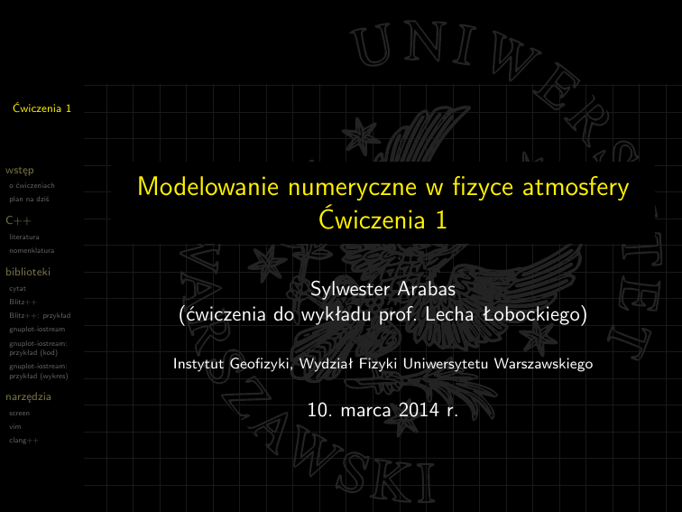 Ćwiczenia 1 wstęp o ćwiczeniach plan na dziś C++ Modelowanie numeryczne w fizyce atmosfery Ćwiczenia 1 literatura nomenklatura biblioteki cytat Blitz++ Blitz++: przykład Sylwester Arabas (ćwiczenia do wykładu prof. Lecha Łobockiego) gnuplot-iostream gnuplot-iostream: przykład (kod) gnuplot-iostream: przykład (wykres) narzędzia screen vim clang++ Instytut Geofizyki, Wydział Fizyki Uniwersytetu Warszawskiego 10. marca 2014 r. o ćwiczeniach Ćwiczenia 1 wstęp Prowadzący o mnie: http://www.igf.fuw.edu.pl/˜ slayoo/ kontakt: [email protected] / pok. 424A, IV piętro IGF o ćwiczeniach plan na dziś Zasady zaliczenia, narzędzia C++ literatura nomenklatura biblioteki cytat Blitz++ Blitz++: przykład gnuplot-iostream gnuplot-iostream: przykład (kod) do napisania: dwa programy i dwa raporty z „doświadczenia numerycznego” język: dowolny obiektowy (C++, Python, Fortran. . . ) na ćwiczeniach: przykłady w C++ gnuplot-iostream: przykład (wykres) narzędzia Materiały do ćwiczeń screen vim clang++ http://www.igf.fuw.edu.pl/˜ slayoo/mnfa2014/ plan na dziś Ćwiczenia 1 wstęp o ćwiczeniach plan na dziś C++ literatura na zajęciach: zaznajomienie się z narzędziami nomenklatura biblioteki cytat Blitz++ Blitz++: przykład gnuplot-iostream gnuplot-iostream: przykład (kod) gnuplot-iostream: przykład (wykres) narzędzia screen vim clang++ praca domowa: zdobycie dostępu do tych narzędzi (lub alternatywnych) w domu / na uczelni C++: polecana literatura Ćwiczenia 1 Bjarne Stroustrup1 (autor C++, AT&T) The C++ Programming Language Paweł Klimczewski2 (FUW/IFT/KMMF) Programowanie w języku C++ w środowisku systemu UNIX Polecane strony: cplusplus.com cppreference.com en.wikibooks.org/ wiki/C++ wstęp o ćwiczeniach stackoverflow.com plan na dziś C++ literatura nomenklatura biblioteki cytat Blitz++ Blitz++: przykład gnuplot-iostream gnuplot-iostream: przykład (kod) gnuplot-iostream: przykład (wykres) narzędzia screen vim clang++ 1: strona domowa BS: http://www.research.att.com/˜ bs/ 2: wykłady o C++ na stronie domowej PK: http://www.fuw.edu.pl/˜ pablo/programowanie1/wyklad.php C++: nomenklatura Ćwiczenia 1 wstęp o ćwiczeniach plan na dziś C++ literatura nomenklatura biblioteki cytat typy/struktury danych: proste (POD) złożone (struktury=klasy) algorytmy: funkcje metody klas/struktur Blitz++ Blitz++: przykład gnuplot-iostream gnuplot-iostream: przykład (kod) gnuplot-iostream: przykład (wykres) narzędzia screen vim clang++ parametry czasu kompilacji: typy (POD/klasy) wartości stałe 1 2 3 4 5 6 7 8 9 // dyrektywa preprocesora #include <cstdlib> // definicja funkcji int main() { // wartość funkcji return EXIT_SUCCESS; } C++: nomenklatura Ćwiczenia 1 wstęp o ćwiczeniach plan na dziś C++ literatura nomenklatura biblioteki cytat typy/struktury danych: proste (POD) złożone (struktury=klasy) algorytmy: funkcje metody klas/struktur Blitz++ Blitz++: przykład gnuplot-iostream gnuplot-iostream: przykład (kod) gnuplot-iostream: przykład (wykres) narzędzia screen vim clang++ parametry czasu kompilacji: typy (POD/klasy) wartości stałe 1 2 3 4 5 6 7 8 9 10 11 12 13 14 15 16 17 18 19 20 21 22 23 // dyrektywa preprocesora #include <cstdlib> // definicja klasy=struktury struct solver { // pola int t=0; // metody void advance(int nt) {} solver() {} // ctor }; // definicja funkcji int main() { // deklaracja (+wyw. ctora) solver s; // wywołanie metody s.advance(10); // wartość funkcji return EXIT_SUCCESS; } C++: nomenklatura Ćwiczenia 1 wstęp o ćwiczeniach plan na dziś C++ literatura nomenklatura biblioteki cytat typy/struktury danych: proste (POD) złożone (struktury=klasy) algorytmy: funkcje metody klas/struktur Blitz++ Blitz++: przykład gnuplot-iostream gnuplot-iostream: przykład (kod) gnuplot-iostream: przykład (wykres) narzędzia screen vim clang++ parametry czasu kompilacji: typy (POD/klasy) wartości stałe 1 2 3 4 5 6 7 8 9 10 11 12 13 14 15 16 17 18 19 20 21 22 23 24 25 #include <cstdlib> #include <array> template < typename real_t,// p. czasu int n_dims // kompilacj > struct solver { int t=0; std::array<int,n_dims> n; void advance(int nt) {} solver( // ctor int nx, // p. czasu int ny // wykonania ) : n({nx,ny}) {} }; int main() { solver<double, 2> s(64,64); s.advance(10); return EXIT_SUCCESS; } Stroustrup: C++ Programming Styles and Libraries1 Ćwiczenia 1 wstęp Without a good library, most interesting tasks are hard to do in C++; but given a good library, almost any task can be made easy. o ćwiczeniach plan na dziś C++ literatura nomenklatura biblioteki Here ”easy” means that the programming language isn’t a source of significant complexity so that a programmer can concentrate on the fundamental problems of the task in hand. cytat Blitz++ Blitz++: przykład gnuplot-iostream gnuplot-iostream: przykład (kod) gnuplot-iostream: przykład (wykres) narzędzia screen vim clang++ 1 http://www2.research.att.com/ bs/style and libraries.pdf Blitz++: wydajne (optymalizacja przez kompilator) i czytelne (dla człowieka) operacje macierzowe źródła: http://sf.net/p/blitz/ Ćwiczenia 1 podręcznik: http://blitz.sf.net/resources/blitz-0.9.pdf wstęp pakiety: o ćwiczeniach Debian/Ubuntu: libblitz0-dev Fedora: blitz-devel Gentoo: dev-libs/blitz Arch: blitz MacPorts: blitz Homebrew: blitz plan na dziś C++ literatura nomenklatura biblioteki cytat Blitz++ Blitz++: przykład alternatywy w C++: NT2 , Armadillo, . . . gnuplot-iostream gnuplot-iostream: przykład (kod) alternatywy w innych językach: tablice w Fortranie (nie obiektowe, liczne ograniczeniaa ) w Pythonie: NumPyPy, Numba, numexpr gnuplot-iostream: przykład (wykres) narzędzia screen vim clang++ a por. np. http://arxiv.org/abs/1301.1334 Blitz++: przykład Ćwiczenia 1 wstęp o ćwiczeniach plan na dziś C++ literatura nomenklatura biblioteki cytat Blitz++ Blitz++: przykład gnuplot-iostream gnuplot-iostream: przykład (kod) gnuplot-iostream: przykład (wykres) narzędzia screen vim clang++ 1 