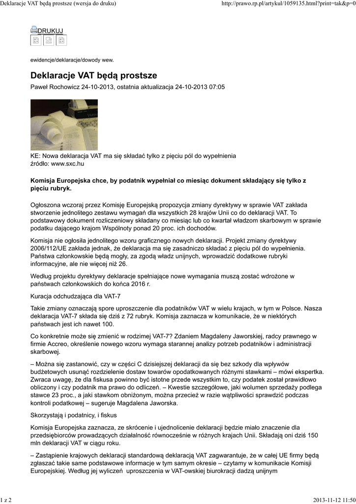 Deklaracje VAT będą prostsze (wersja do druku) 1z2 http://prawo.rp.pl/artykul/1059135.html?print=tak&p=0 DRUKUJ ewidencje/deklaracje/dowody wew. Deklaracje VAT będą prostsze Paweł Rochowicz 24-10-2013, ostatnia aktualizacja 24-10-2013 07:05 KE: Nowa deklaracja VAT ma się składać tylko z pięciu pól do wypełnienia źródło: www.sxc.hu Komisja Europejska chce, by podatnik wypełniał co miesiąc dokument składający się tylko z pięciu rubryk. Ogłoszona wczoraj przez Komisję Europejską propozycja zmiany dyrektywy w sprawie VAT zakłada stworzenie jednolitego zestawu wymagań dla wszystkich 28 krajów Unii co do deklaracji VAT. To podstawowy dokument rozliczeniowy składany co miesiąc lub co kwartał władzom skarbowym w sprawie podatku dającego krajom Wspólnoty ponad 20 proc. ich dochodów. Komisja nie ogłosiła jednolitego wzoru graficznego nowych deklaracji. Projekt zmiany dyrektywy 2006/112/UE zakłada jednak, że deklaracja ma się zasadniczo składać z pięciu pól do wypełnienia. Państwa członkowskie będą mogły, za zgodą władz unijnych, wprowadzić dodatkowe rubryki informacyjne, ale nie więcej niż 26. Według projektu dyrektywy deklaracje spełniające nowe wymagania muszą zostać wdrożone w państwach członkowskich do końca 2016 r. Kuracja odchudzająca dla VAT-7 Takie zmiany oznaczają spore uproszczenie dla podatników VAT w wielu krajach, w tym w Polsce. Nasza deklaracja VAT-7 składa się dziś z 72 rubryk. Komisja zaznacza w komunikacie, że w niektórych państwach jest ich nawet 100. Co konkretnie może się zmienić w rodzimej VAT-7? Zdaniem Magdaleny Jaworskiej, radcy prawnego w firmie Accreo, określenie nowego wzoru wymaga starannej analizy potrzeb podatników i administracji skarbowej. – Można się zastanowić, czy w części C dzisiejszej deklaracji da się bez szkody dla wpływów budżetowych usunąć rozdzielenie dostaw towarów opodatkowanych różnymi stawkami – mówi ekspertka. Zwraca uwagę, że dla fiskusa powinno być istotne przede wszystkim to, czy podatek został prawidłowo obliczony i czy podatnik ma prawo do odliczeń. – Kwestie szczegółowe, jaki wolumen sprzedaży podlega stawce 23 proc., a jaki stawkom obniżonym, można przecież w razie wątpliwości sprawdzić podczas kontroli podatkowej – sugeruje Magdalena Jaworska. Skorzystają i podatnicy, i fiskus Komisja Europejska zaznacza, ze skrócenie i ujednolicenie deklaracji będzie miało znaczenie dla przedsiębiorców prowadzących działalność równocześnie w różnych krajach Unii. Składają oni dziś 150 mln deklaracji VAT w ciągu roku. – Zastąpienie krajowych deklaracji standardową deklaracją VAT zagwarantuje, że w całej UE firmy będą zgłaszać takie same podstawowe informacje w tym samym okresie – czytamy w komunikacie Komisji Europejskiej. Według jej wyliczeń uproszczenia w VAT-owskiej biurokracji dadzą unijnym 2013-11-12 11:50 Deklaracje VAT będą prostsze (wersja do druku) 2z2 http://prawo.rp.pl/artykul/1059135.html?print=tak&p=0 przedsiębiorcom łącznie około 15 mld euro oszczędności rocznie. Mają na tym skorzystać także władze skarbowe. – Rządy dostaną nowe narzędzie poprawy przestrzegania przepisów o VAT, które powinno przyczynić się do zwiększenia ich dochodów – powiedział komisarz ds. podatków Algirdas Szemeta. Według danych Komisji, VAT stanowi średnio około 21 proc. dochodów państw członkowskich. Zbiera się go jednak zbyt mało. W 2011 r. różnica między spodziewanymi a wpłaconymi należnościami wyniosła około 193 mld euro. W Polsce sytuacja jest podobna. Według wyliczeń firmy PwC w 2012 r. różnica wyniosła, zależnie od metody obliczeń, od 36,5 do 58,5 mld zł. Komisja twierdzi, że stworzenie systemu prostszego zarówno dla podatników, jak i dla organów administracji, ograniczy ten ubytek. Joanna Rudzka, Doradca podatkowy Propozycja Komisji wpisuje się w politykę uporządkowania wpływów z VAT w Unii Europejskiej. Daje się bowiem zauważyć, nie tylko w Polsce, pogłębiającą się lukę między planowanymi i rzeczywistymi wpływami z tego podatku. Uproszczona deklaracja może ułatwić funkcjonowanie firmom działającym w różnych krajach UE, szczególnie tym, które założyły wspólne dla całej swojej sieci centra rozliczeń podatków. Na razie trudno powiedzieć, jak będą wyglądały nowe polskie deklaracje VAT, ale z pewnością w nowym wzorze liczba rubryk będzie zredukowana. Może się pojawić, zresztą nie tylko w Polsce, pokusa, by żądać od podatników dodatkowych dokumentów. Projekt dyrektywy w tej sprawie wyraźnie jednak stwierdza, że państwa członkowskie nie mogą żądać od podatników informacji wykraczających poza ściśle określony w dyrektywie zakres. Rzeczpospolita © Wszystkie prawa zastrzeżone Żadna część jak i całość utworów zawartych w dzienniku nie może być powielana i rozpowszechniana lub dalej rozpowszechniana w jakiejkolwiek formie i w jakikolwiek sposób (w tym także elektroniczny lub mechaniczny lub inny albo na wszelkich polach eksploatacji) włącznie z kopiowaniem, szeroko pojętą digitalizacją, fotokopiowaniem lub kopiowaniem, w tym także zamieszczaniem w Internecie - bez pisemnej zgody PRESSPUBLICA Sp. z o.o. Jakiekolwiek użycie lub wykorzystanie utworów w całości lub w części bez zgody PRESSPUBLICA Sp. z o.o. lub autorów z naruszeniem prawa jest zabronione pod groźbą kary i może być ścigane prawnie. 2013-11-12 11:50
