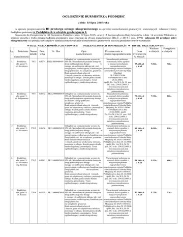 OGŁOSZENIE BURMISTRZA PODDĘBIC z dnia 03 lipca 2015 roku w sprawie przeprowadzenia III przetargu ustnego nieograniczonego na sprzedaż nieruchomości gruntowych stanowiących własność Gminy Poddębice położonej w Poddębicach w obrębie geodezyjnym 9. Stosownie do Zarządzenia Nr 89 Burmistrza Poddębic z dnia 02 lipca 2015r. oraz § 13 Rozporządzenia Rady Ministrów z dnia 14 września 2004 roku w sprawie sposobu i trybu przeprowadzania przetargów oraz rokowań na zbycie nieruchomości (Dz.U. z 2014 r. poz. 1490) ogłaszam III przetarg ustny nieograniczony na sprzedaż opisanych w zamieszczonym wykazie nieruchomości gruntowych na niżej przedstawionych warunkach: WYKAZ NIERUCHOMOŚCI GRUNTOWYCH Lp. . 1. 2. 3 4. 5 Położenie Numer Pow. działki w ha nieruchomości Poddębice obr. geod. 9, ul. Kwiatowa 79/2 Poddębice obr. geod. 9, ul. Tulipanowa 79/3 Nr Kw PRZEZNACZONYCH DO SPRZEDAŻY W TRYBIE PRZETARGOWYM Opis nieruchomości Przeznaczenie w Cena planie zagospodarowania wywoławcza w złotych Odległość od centrum miasta wynosi ok. Nieruchomość położona 0,1374 SR2L/00004804/9 850 mb. Nieruchomość posiada dostęp do na terenach, które zgodnie drogi publicznej oraz dostęp w z miejscowym planem zasięgu do uzbrojenia takiego jak: sieć zagospodarowania energetyczna, wodociągową, kanalizacyjna. przestrzennego miasta Poddębic, Drogi publiczne nie urządzone, gruntowe. zatwierdzonym Uchwałą Rady Brak naniesień budowlanych Miejskiej i innych, grunt nie użytkowany rolniczo, Nr XXIV/158/04 pozostaje w odłogu. Kształt granic działki w Poddębicach z dnia bardzo regularny, prostokątny. Teren 28.12.2004r. ogólnodostępny, płaski nieogrodzony. (publ. Dz. Urz.W.Ł.Nr 54 poz. 563 z dn. 254.02.2005r.) - przeznaczona jest pod zabudowę mieszkaniowa jednorodzinną 0,1442 SR2L/00004804/9 Odległość od centrum miasta wynosi ok. Nieruchomość położona 850 mb. Nieruchomość posiada dostęp do na terenach, które zgodnie drogi publicznej oraz ograniczony dostęp z miejscowym planem do mediów. Drogi publiczne nie zagospodarowania urządzone, gruntowe. przestrzennego miasta Poddębic, Brak naniesień budowlanych i innych, zatwierdzonym Uchwałą Rady grunt nie użytkowany rolniczo, pozostaje w Miejskiej Nr XXIV/158/04 odłogu. Kształt granic działki bardzo w Poddębicach z dnia regularny, prostokątny. Teren 28.12.2004r. (publ. ogólnodostępny, płaski nieogrodzony. Dz. Urz.W.Ł.Nr 54 poz. 563 z dn. 254.02.2005r.) - przeznaczona jest pod zabudowę mieszkaniowa jednorodzinną Odległość od centrum miasta wynosi ok. Nieruchomość położona na 0,1456 SR2L/00006269/0 850 mb. Nieruchomość posiada dostęp do terenach, które zgodnie z drogi publicznej oraz dostęp w miejscowym planem zasięgu do uzbrojenia takiego jak: sieć zagospodarowania energetyczna, wodociągową, kanalizacyjna. przestrzennego miasta Poddębic, Drogi publiczne nie urządzone, gruntowe. zatwierdzonym Uchwałą Rady Brak naniesień budowlanych Miejskiej Nr XXIV/158/04 w i innych, grunt nie użytkowany rolniczo, Poddębicach z dnia 28.12.2004r. pozostaje w odłogu. Kształt granic działki (publ. Dz. Urz.W.Ł.Nr 54 bardzo regularny, prostokątny. Teren poz. 563 z dn. 254.02.2005r.) ogólnodostępny, płaski nieogrodzony. - przeznaczona jest pod zabudowę mieszkaniowa jednorodzinną Poddębice obr. geod. 9, ul. Kwiatowa 278/2 Poddębice obr. geod. 9, ul. Kwiatowa róg Różanej 278/3 0,1085 Poddębice obr. geod. 9, ul. Różana 278/4 0,0959 Odległość od centrum miasta wynosi ok. SR2L/00006269/0 850 mb. Nieruchomość posiada dostęp do drogi publicznej oraz dostęp w zasięgu do uzbrojenia takiego jak: sieć energetyczna, wodociągową, kanalizacyjna. Drogi publiczne nie urządzone, gruntowe. Brak naniesień budowlanych i innych, grunt nie użytkowany rolniczo, pozostaje w odłogu. Kształt granic działki bardzo regularny, prostokątny. Teren ogólnodostępny, płaski nieogrodzony. Nieruchomość położona na terenach, które zgodnie z miejscowym planem zagospodarowania przestrzennego miasta Poddębic, zatwierdzonym Uchwałą Rady Miejskiej Nr XXIV/158/04 w Poddębicach z dnia 28.12.2004r. (publ. Dz. Urz.W.Ł.Nr 54 poz. 563 z dn. 254.02.2005r.) - przeznaczona jest pod zabudowę mieszkaniowa jednorodzinną Odległość od centrum miasta wynosi ok. SR2L/00006269/0 850 mb. Nieruchomość posiada dostęp do drogi publicznej oraz dostęp w zasięgu do uzbrojenia takiego jak: sieć energetyczna, wodociągową, kanalizacyjna. Drogi publiczne nie urządzone, gruntowe. Brak naniesień budowlanych i innych, grunt nie użytkowany rolniczo, pozostaje w odłogu. Kształt granic działki bardzo regularny, prostokątny. Teren ogólnodostępny, płaski nieogrodzony. Nieruchomość położona na terenach, które zgodnie z miejscowym planem zagospodarowania przestrzennego miasta Poddębic, zatwierdzonym Uchwałą Rady Miejskiej Nr XXIV/158/04 w Poddębicach z dnia 28.12.2004r. (publ. Dz. Urz.W.Ł.Nr 54 poz. 563 z dn. 254.02.2005r.) - przeznaczona jest pod zabudowę mieszkaniowa jednorodzinną Wadium w złotych Postąpienie w złotych 75.600,-zł z VAT 7.560,- 760,- 79.300,- zł z VAT 7.930,- 800,- 80.100,- zł z VAT 8.010,- 810,- 59.700,- zł z VAT 5.970,- 600,- 52.700,- zł z VAT 5.270,- 530,- 6 7 8 9 Poddębice obr. geod. 9, ul. Różana 278/5 0,0938 Poddębice obr. geod. 9, ul. Tulipanowa 278/6 0,1468 Poddębice obr. geod. 9, ul. Różana 278/7 0,0917 Poddębice obr. geod. 9, 278/8 ul. Różana, róg Tulipanowej 0,1029 Odległość od centrum miasta wynosi ok. SR2L/00006269/0 850 mb. Nieruchomość posiada dostęp do drogi publicznej oraz dostęp w zasięgu do uzbrojenia takiego jak: sieć energetyczna, wodociągową, kanalizacyjna. Drogi publiczne nie urządzone, gruntowe. Brak naniesień budowlanych i innych, grunt nie użytkowany rolniczo, pozostaje w odłogu. Kształt granic działki bardzo regularny, prostokątny. Teren ogólnodostępny, płaski nieogrodzony. Nieruchomość położona na terenach, które 